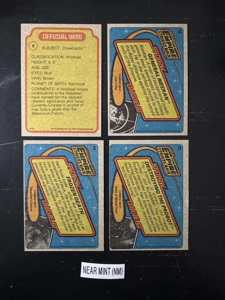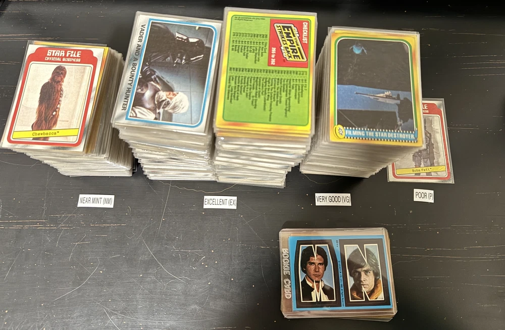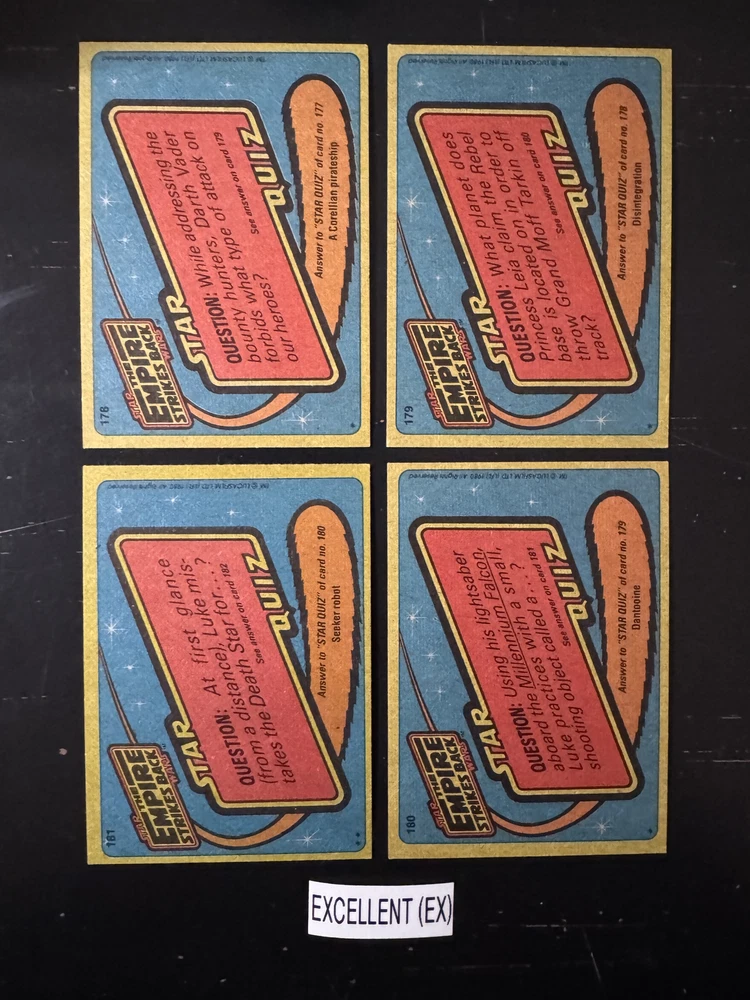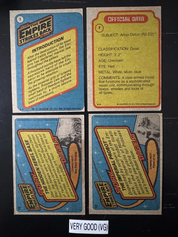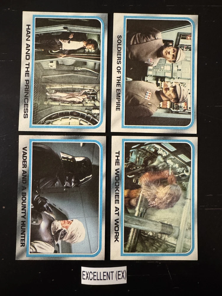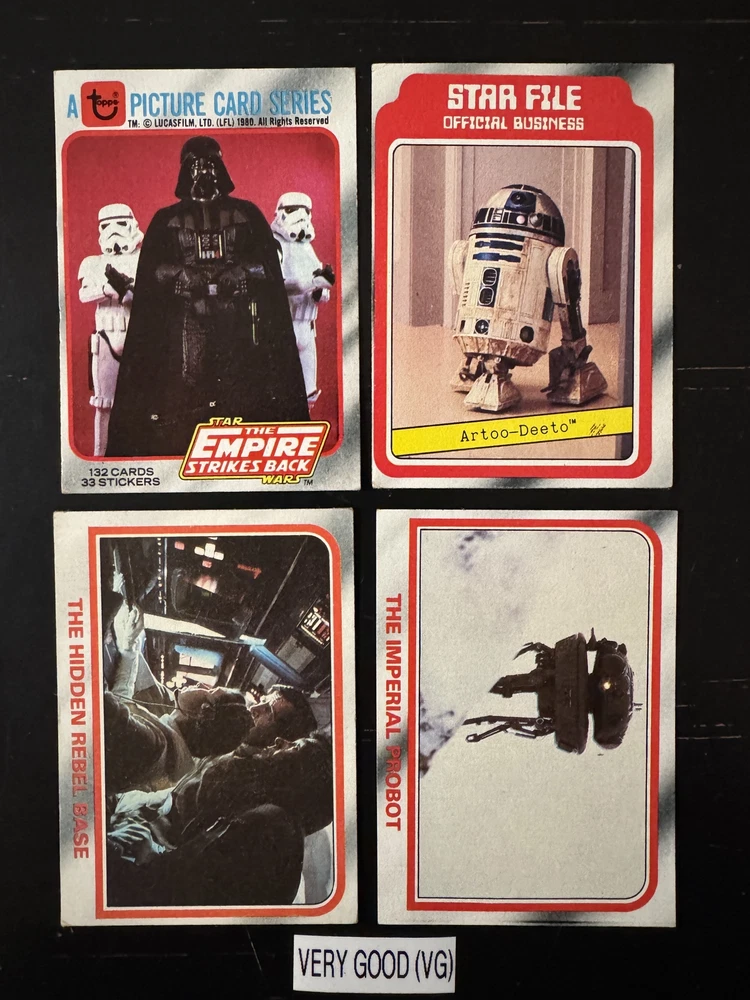 Complete Your Card Set 1980 Topps Star Wars Cards 201-352 (P-NM) - You Pick - Complete Your Set Description 1980 Topps Star Wars Cards 201-352 (P-NM) - You Pick - Complete Your Set Choose the cards from this listing to complete your set. Please see details below about card conditions, discounts, combined shipping, packaging, and tracking. Cards available in this set include: Base Cards Inserts: Stickers Please see the separate listing(s) for the other cards in this same set: 1980 Topps Star Wars Cards 1-100 (P-NM) - You Pick - Complete Your Set 1980 Topps Star Wars Cards 101-200 (P-NM) - You Pick - Complete Your Set 1980 Topps Star Wars Cards 201-352 (P-NM) - You Pick - Complete Your Set Visit my eBay store to see other sets: Complete Your Card Sets | eBay Stores Discounts Volume Priceing 2 cards - 10% off both 3 cards - 15% off all 3 4+ cards - 20% off all of my "complete your set" listing cards in the cart. Combined Shipping $0.69 cents for the first card and .15 cents for each additional card $5.00 max shipping per order for "complete your set" listings Conditions I have categorized the cards according to the eBay card condition guide so you have a good idea of the condition of each card. The condition is added to the end of each card name and I usually grade more stringent that the condition guide outlines. If more than one card with the same condition specified is available, I will select the best conditioned card for you. NM +: Near Mint or Better Minor issues on corners or edges if any EX : Excellent Excellent shape with some imperfections 1-3 corners may have dings May have minor wrinkle (not usually) but no creases VG : Very Good 3-4 corners are bent or rounded Rarely have 1 wrinkle or crease that doesn’t cross the entire face of the card. No staining or very little (not often) on front or back of card No tears, significantly damaged surfaces, or pen writings on them P : Poor Corners are bent or rounded May have 1 or more wrinkles or creases May have some sort of staining on the front or back of card PM : Poor w/ pen or pencil markings Some sort of pen or pencil marking on the card Typically, the number on the back is crossed out or highlighted Checklists that have boxes checked Examples : See the pictures on the listing for examples that show a good representation of the general conditions. Packaging Your cards will be well protected guaranteed! All cards are packaged in penny sleeves, placed in top loader hard sleeves, and wrapped in a team bag. Orders of 14 cards or less and under $20 will be safely packaged and shipped in a plain white envelope Orders of 15+ cards will be safely packaged in a bubble envelope Shipping Cards will be packaged and shipped the same or next business day. All orders will ship using " eBay Standard Envelope " or " USPS Ground Advantage " Orders under $20 with 14 cards or less will ship in a plain envelope using "eBay Standard Envelope" which includes eBay Tracking Orders over $20 OR include 15+ cards will be packaged in a bubble envelope and shipped using "USPS Ground Advantage" which includes regular USPS Tracking. Tracking NOTE : Cards shipped with the "eBay Standard Envelope" tracking are scanned and the tracking is marked as "Delivered" when they arrive at the destination post office. It will take a couple additional days BEFORE the cards arrive at the your address. Please contact if you are experiencing delays longer than expected.