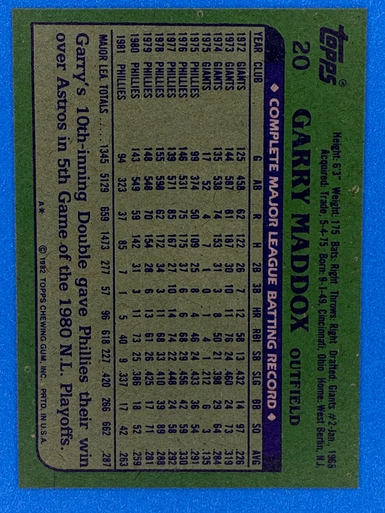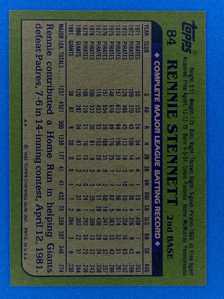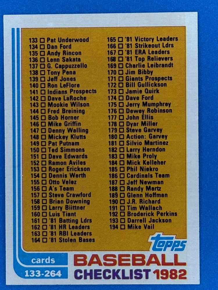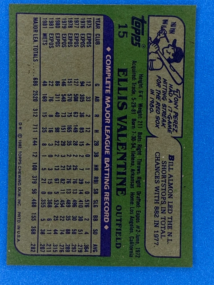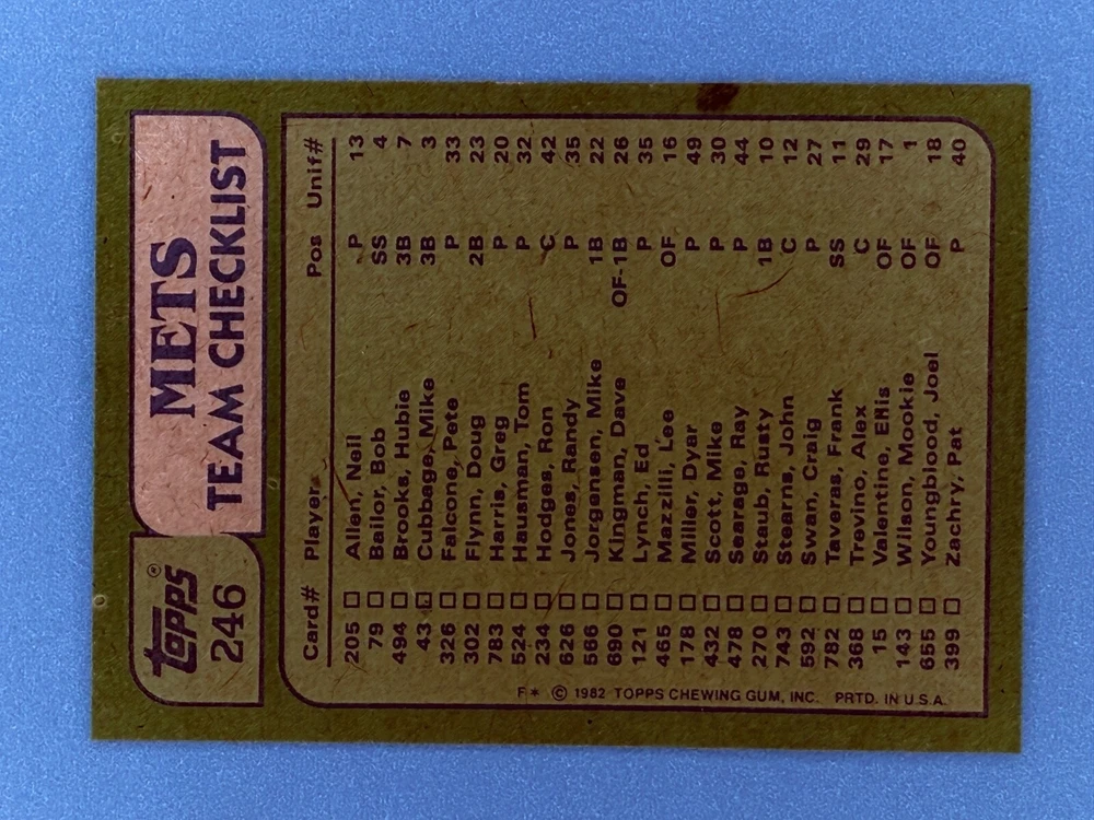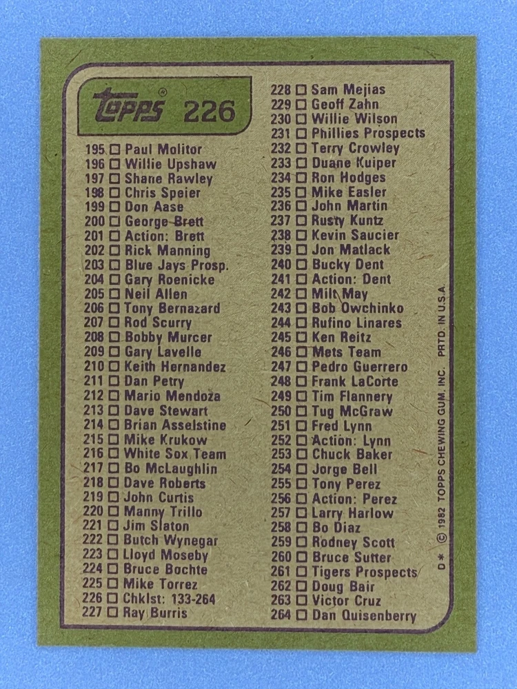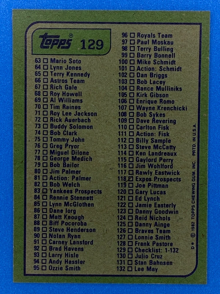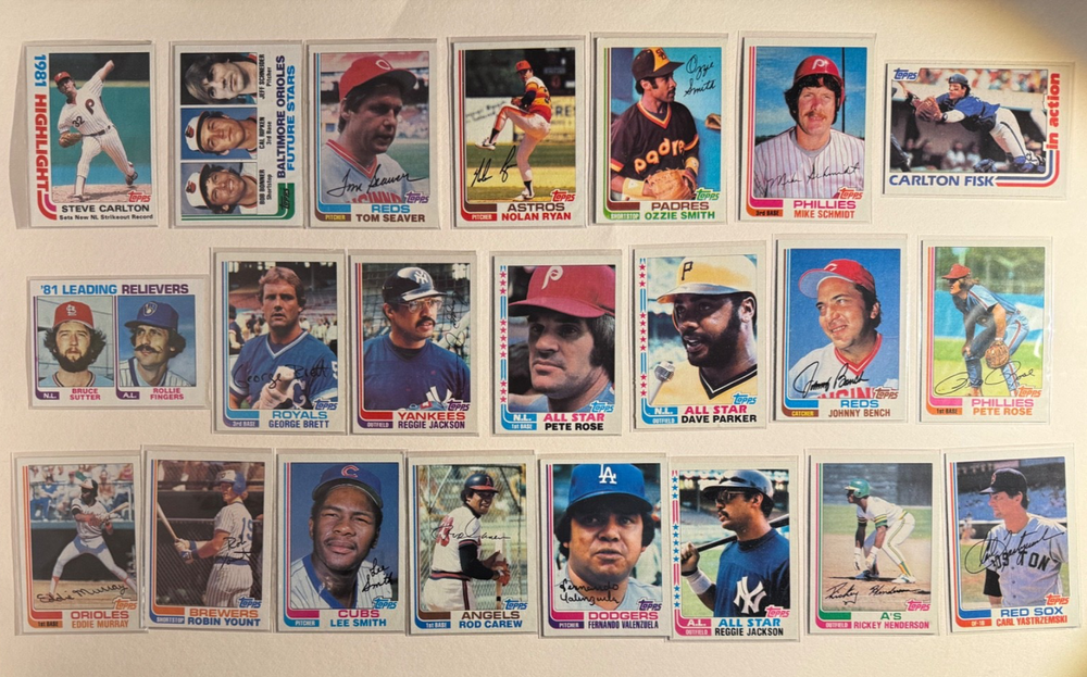 Free Shipping! eBay Standard Envelope or USPS Ground Advantage Enjoy 50% off your entire order, if you purchase at least 5 items from either of my 1982 Topps Listings. Commons available! If a card is not listed separately then it is considered a common and can be purchased by selecting the item shown as ' Up to 20 commons ', use contact seller button and send me either a picture of your list or a typed list with card numbers. See list below for cards I do not have available. If you would like to purchase 400 different commons, please select '1982 Topps 400 Different' in the drop down box. Cost for 400 different commons is $16 with 50% off (be sure to purchase 4 other 1982 Topps items to get the 50% off). Most cards you receive will have condition of NM or better; however, certain cards have front centering between 70/30 and 85/15 which would grade as low as EX. No creases or badly damaged corners. If you are not satisfied with the condition of a card, I will offer a refund. Be sure to see my other listing for 1982 Topps Baseball which has card numbers 376-792 available. See pictures of cards which are representative of the cards you may receive. I have many duplicates not pictured.