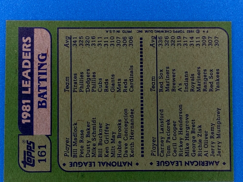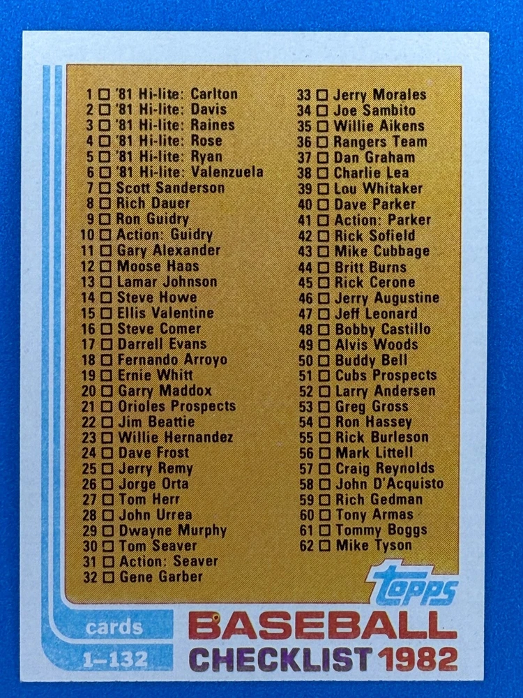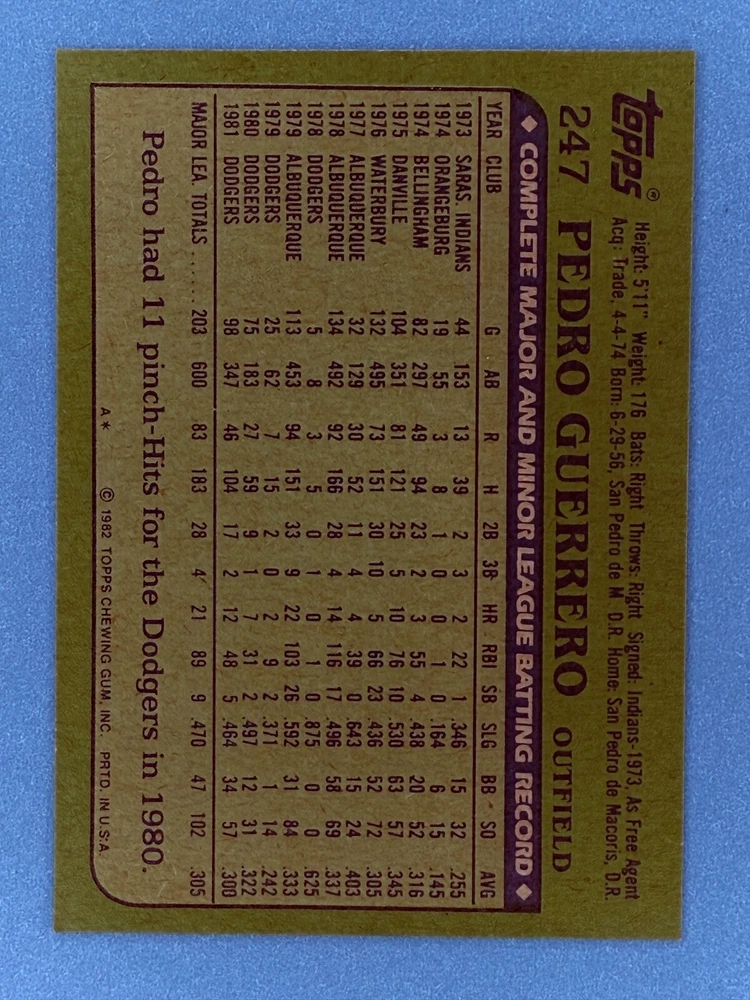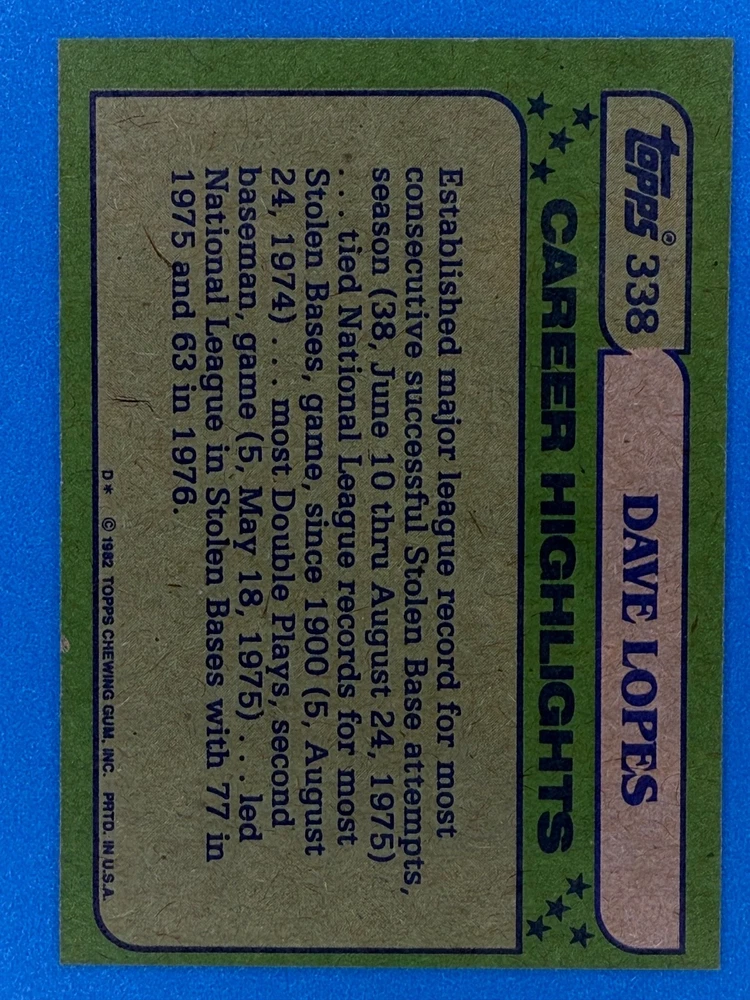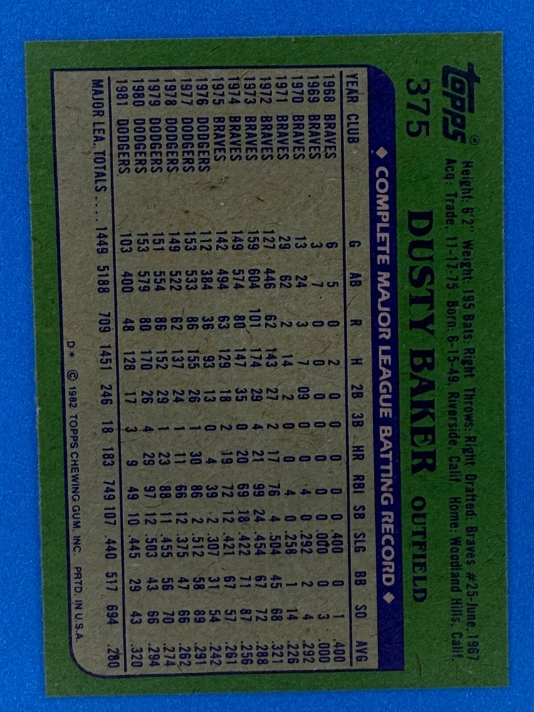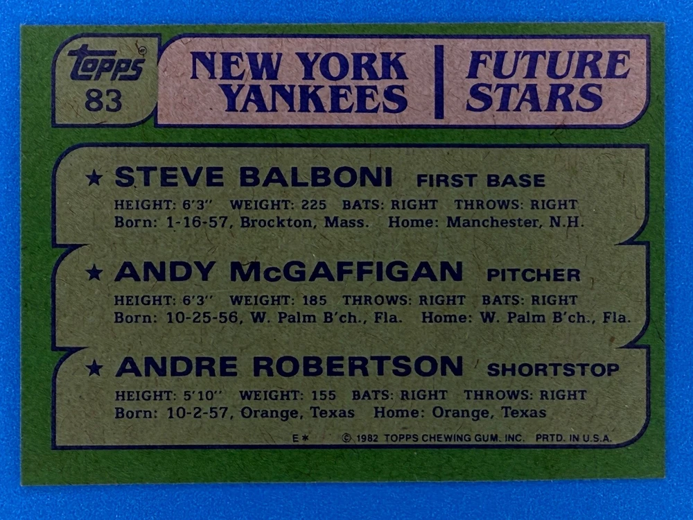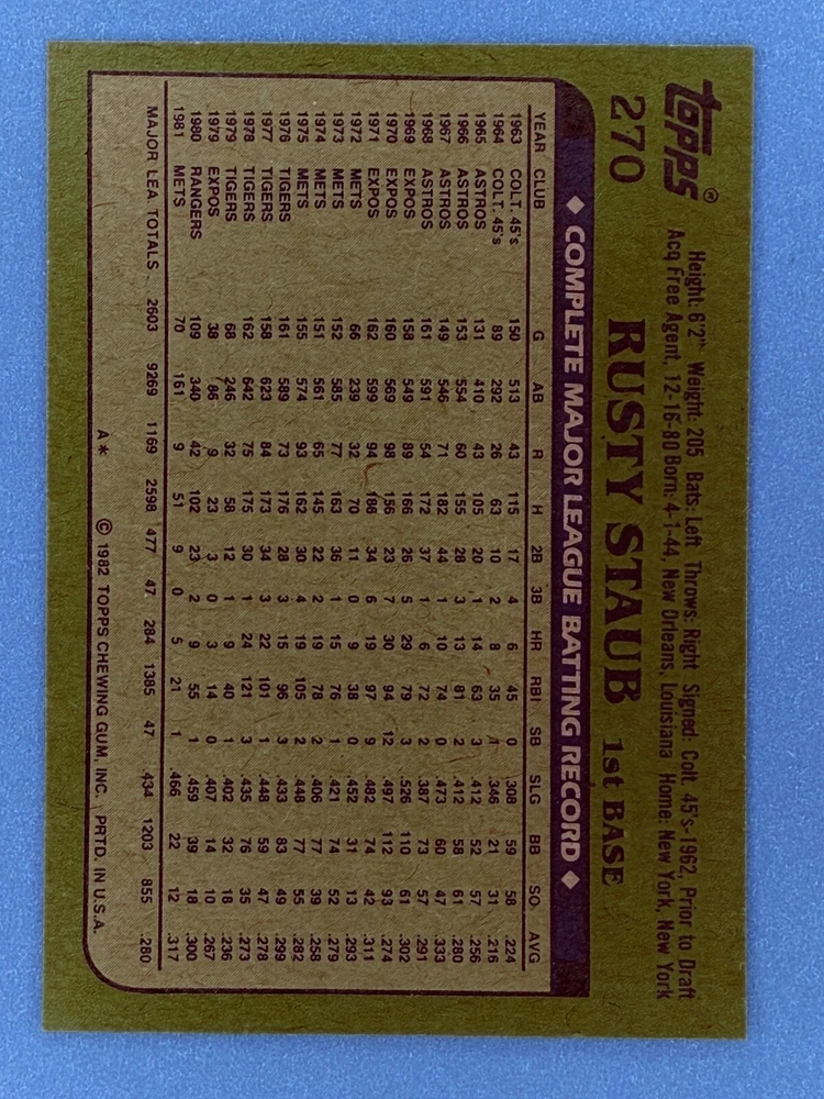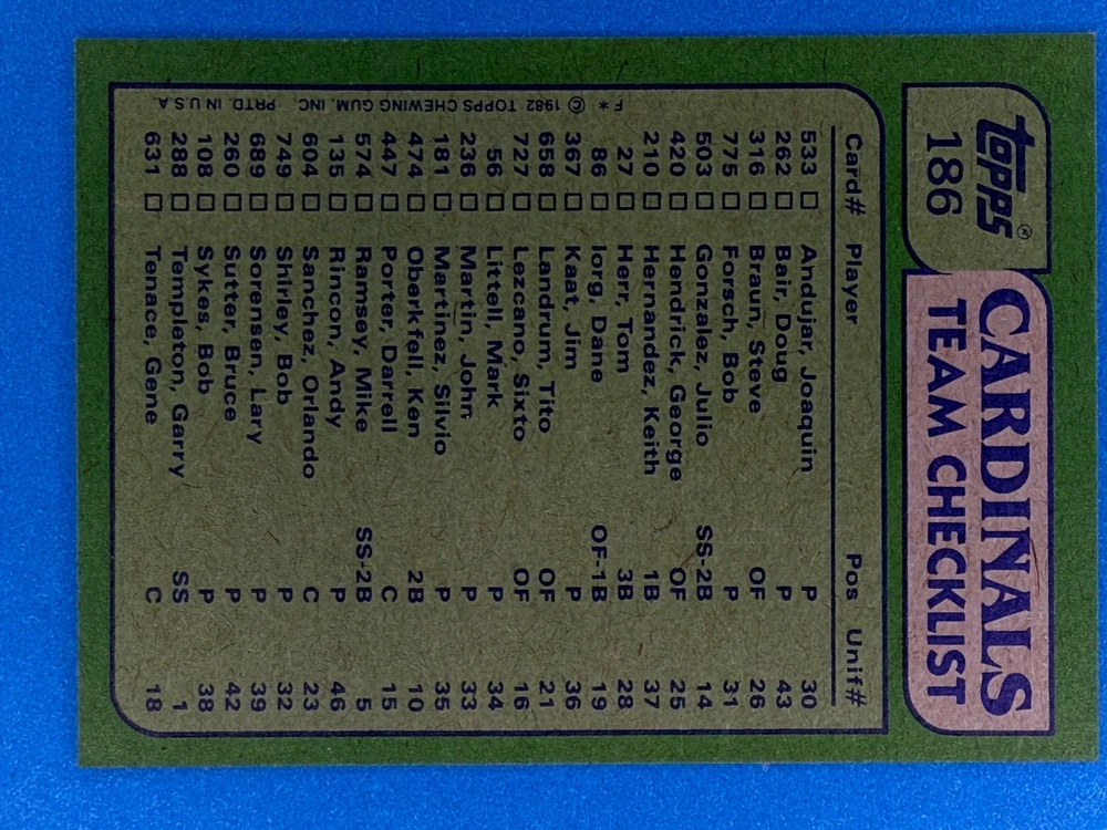 Free Shipping! eBay Standard Envelope or USPS Ground Advantage Enjoy 50% off your entire order, if you purchase at least 5 items from either of my 1982 Topps Listings. Commons available! If a card is not listed separately then it is considered a common and can be purchased by selecting the item shown as ' Up to 20 commons ', use contact seller button and send me either a picture of your list or a typed list with card numbers. See list below for cards I do not have available. If you would like to purchase 400 different commons, please select '1982 Topps 400 Different' in the drop down box. Cost for 400 different commons is $16 with 50% off (be sure to purchase 4 other 1982 Topps items to get the 50% off). Most cards you receive will have condition of NM or better; however, certain cards have front centering between 70/30 and 85/15 which would grade as low as EX. No creases or badly damaged corners. If you are not satisfied with the condition of a card, I will offer a refund. Be sure to see my other listing for 1982 Topps Baseball which has card numbers 376-792 available. See pictures of cards which are representative of the cards you may receive. I have many duplicates not pictured.