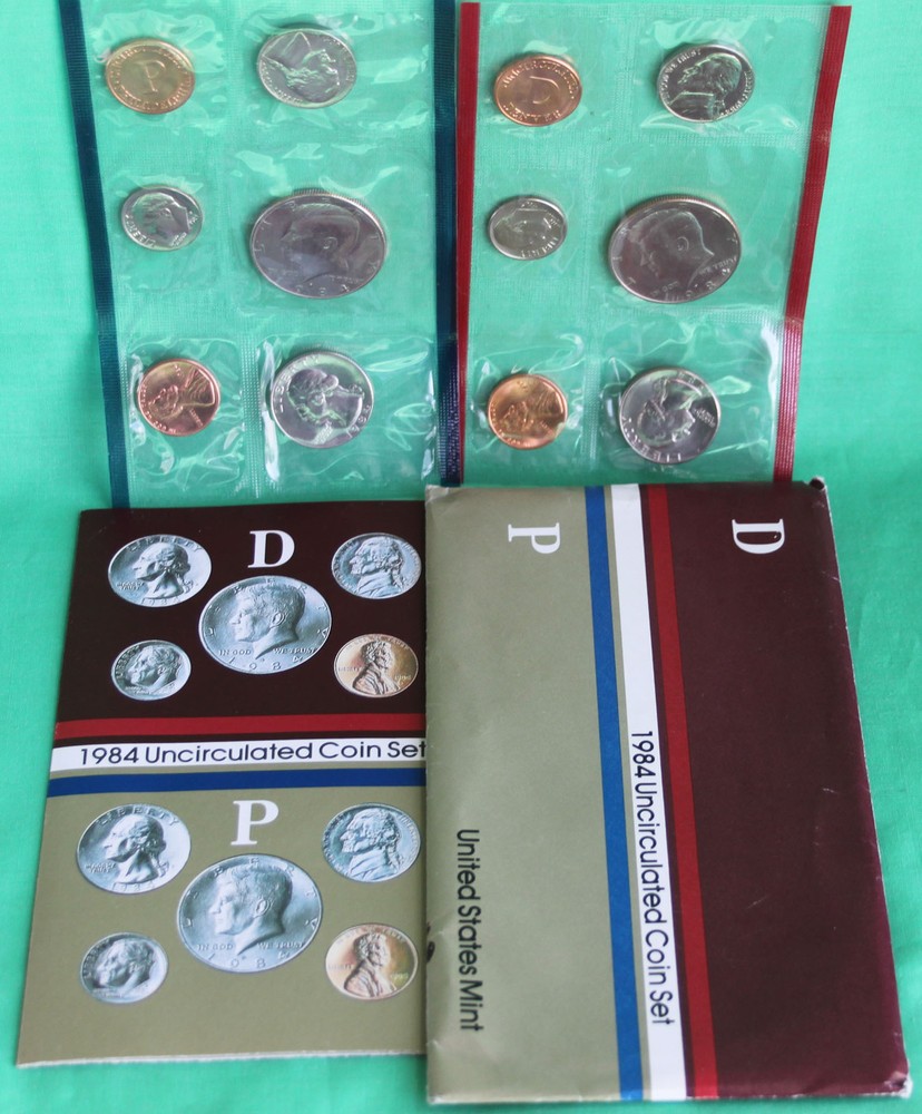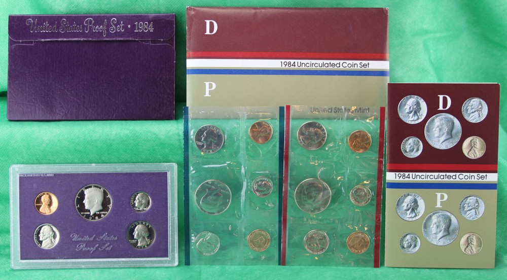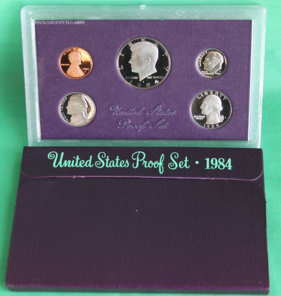 Here we offer 15 coins in two complete sets! You get all coins minted by the San Francisco, Philadelphia and Denver Mints; their original box and envelope! Includes Lincoln Cents, Jefferson Nickels, Roosevelt Dimes, Washington Quarters and Kennedy Halves. You get the two sets listed below 1984 United States Mint Proof 5 Coin Set from the San Francisco Mint 1984 United States Mint Uncirculated 10 Coin Set - 5 coins from the Denver Mint and 5 coins from the Philadelphia Mint Note: This is the first year the US Mint offered a COA with their uncirculated sets. There is no COA with the 1984 proof set (None were offered until the 1986 sets came out.) Many Proof and Mint sets are at their lowest price ever. Now is the time to take advantage of the low prices and complete your collection! What is the difference between proof sets and uncirculated mint sets? Proof sets contain proof coins - coins that were struck especially for coin collectors. These coins start from highly polished planchets (blanks) and then are struck twice with specially prepared dies. The result is an incredibly sharp detailed coin usually with mirrored fields. Struck at the San Francisco Mint since 1968.