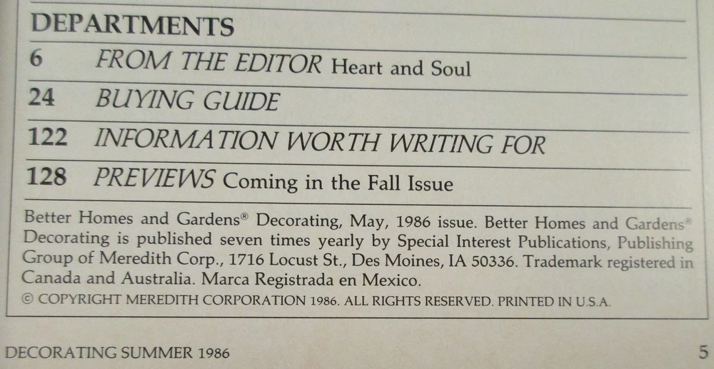 ITEM >>> Better Homes & Gardens Decorating Magazine Summer 1986 - Please see my other auctions for more magazines, shipping is free no matter how many issues you purchase! MANUFACTURER >>> Meredith Corporation ® NOTES >>>> All my items are smoke free unless stated otherwise in the auction. Please see pictures above for details. If there is anything I have missed or if you notice an error in the auction please e-mail me. I never intentionally misrepresent any of my items. Most importantly, if I haven't answered your particular question or questions please feel free to e-mail me. Please view all the pictures above before placing your bid. SHIPPING & INSURANCE >>> Please see shipping section for shipping choices and prices. I believe insuring a package should be the buyer's choice, therefore I will not automatically insure this package. If you want to insure your package you will need to e-mail me before you make your payment so that I can add the additional fees that apply to the invoice. If you do not e-mail me I will not insure your package. P lease consider insuring your package seriously. Insurance not only covers damage but also the loss of your package. I pack all my items safely and securely but please understand that once the package is out of my hands I have no control over its safety. I feel I should not be held responsible for a package that is beyond my control. The insurance will help you get the value back for your item . H&T *** PLEASE SEE MY OTHER AUCTIONS & VISIT MY STORE *** I HAVE MORE ISSUES AVAILABLE THAT YOU MAY LIKE TO SEE I AM ALWAYS HAPPY TO COMBINE ITEMS TO SAVE MONEY ON SHIPPING FEES *** GOOD LUCK & THANK YOU FOR YOUR BIDS ***
