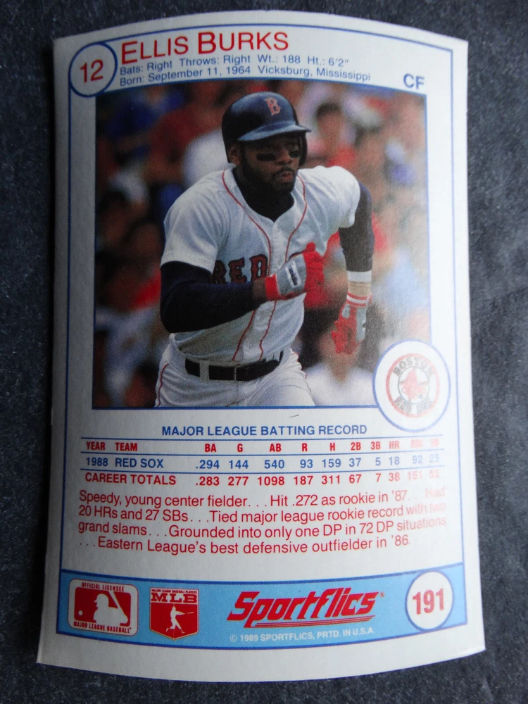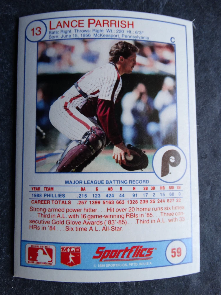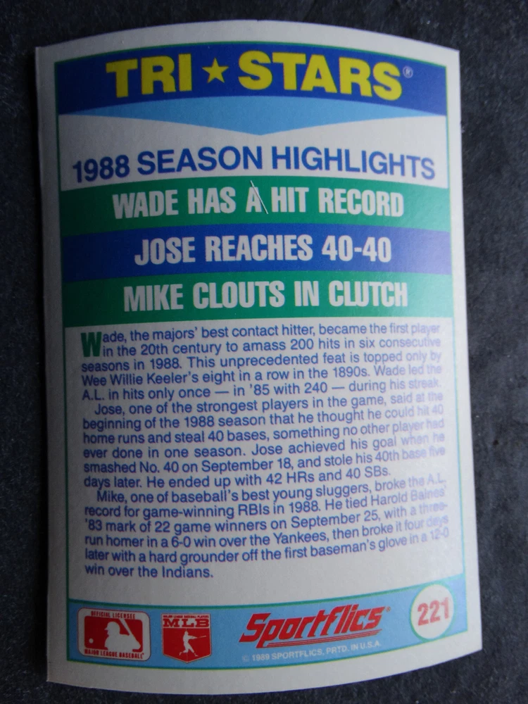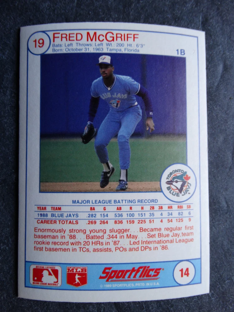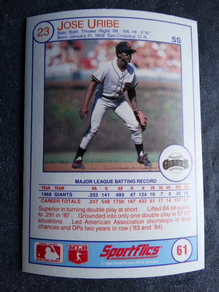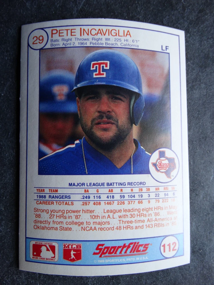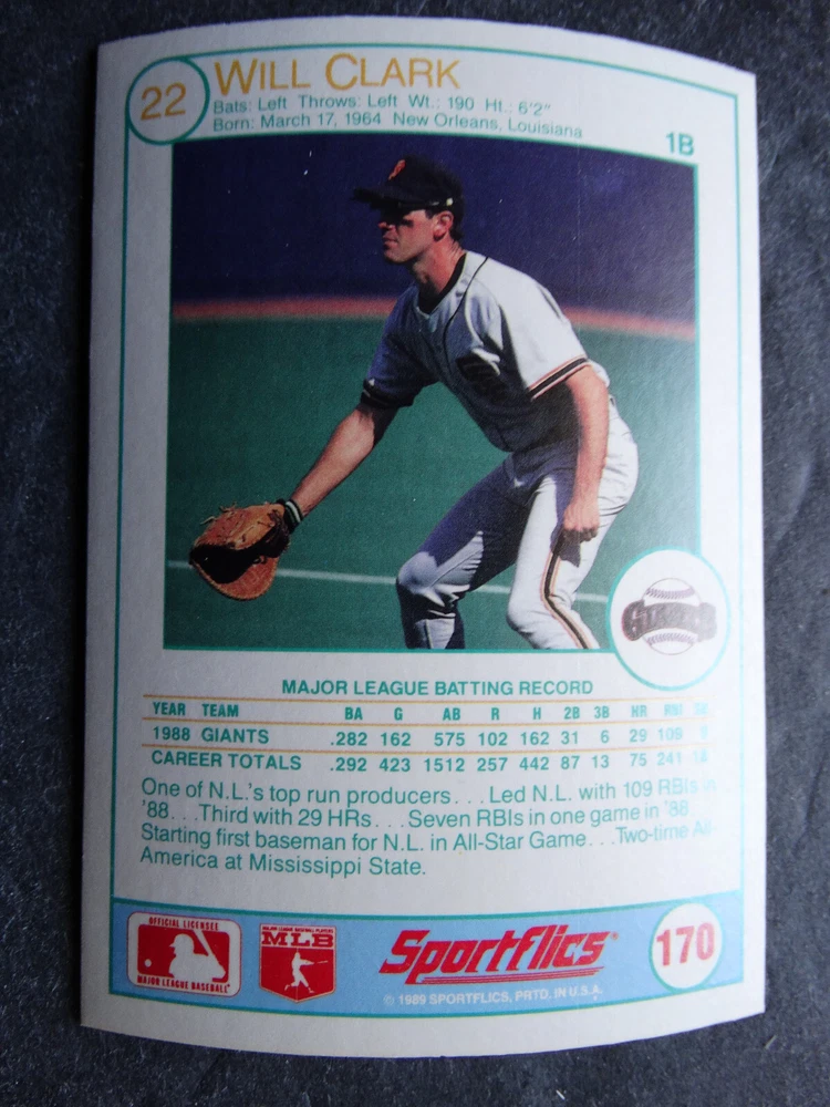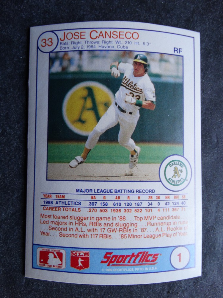 1989 Sportflics Baseball Cards Complete Your Set U Pick From List 1-225 *****The cards that don't show the front of the card have defects as shown in the pictures***** 1 Jose Canseco Oakland Athletics 2 Wally Joyner California Angels 3 Roger Clemens Boston Red Sox 4 Greg Swindell Cleveland Indians 5 Jack Morris Detroit Tigers 6 Mickey Brantley Seattle Mariners 7 Jim Presley Seattle Mariners 8 Pete O'Brien Texas Rangers 9 Jesse Barfield Toronto Blue Jays 10 Frank Viola Minnesota Twins 11 Kevin Bass Houston Astros 12 Glenn Wilson Seattle Mariners 13 Chris Sabo Cincinnati Reds 14 Fred McGriff Toronto Blue Jays 15 Mark Grace Chicago Cubs 16 Devon White California Angels 17 Juan Samuel Philadelphia Phillies 18 Lou Whitaker Detroit Tigers 19 Greg Walker Chicago White Sox 20 Roberto Alomar San Diego Padres 21 Mike Schmidt Philadelphia Phillies 22 Benny Santiago San Diego Padres 23 Dave Stewart Oakland Athletics 24 Dave Winfield New York Yankees 25 George Bell Toronto Blue Jays 26 Jack Clark New York Yankees 27 Doug Drabek Pittsburgh Pirates 28 Ron Gant Atlanta Braves 29 Glenn Braggs Milwaukee Brewers 30 Rafael Palmeiro Chicago Cubs 31 Brett Butler San Francisco Giants 32 Ron Darling New York Mets 33 Alvin Davis Seattle Mariners 34 Bob Walk Pittsburgh Pirates 35 Dave Stieb Toronto Blue Jays 36 Orel Hershiser Los Angeles Dodgers 37 John Farrell Cleveland Indians 38 Doug Jones Cleveland Indians 39 Kelly Downs San Francisco Giants 40 Bob Boone California Angels 41 Gary Sheffield Milwaukee Brewers 42 Doug Dascenzo Chicago Cubs 43 Chad Kreuter RC Texas Rangers 44 Ricky Jordan Philadelphia Phillies 45 Dave West New York Mets 46 Danny Tartabull Kansas City Royals 47 Teddy Higuera Milwaukee Brewers 48 Gary Gaetti Minnesota Twins 49 Dave Parker Oakland Athletics 50 Don Mattingly New York Yankees 51 David Cone New York Mets 52 Kal Daniels Cincinnati Reds 53 Carney Lansford Oakland Athletics 54 Mike Marshall Los Angeles Dodgers 55 Kevin Seitzer Kansas City Royals 56 Mike Henneman Detroit Tigers 57 Bill Doran Houston Astros 58 Steve Sax Los Angeles Dodgers 59 Lance Parrish Philadelphia Phillies 60 Keith Hernandez New York Mets 61 Jose Uribe San Francisco Giants 62 Jose Lind Pittsburgh Pirates 63 Steve Bedrosian Philadelphia Phillies 64 George Brett Kansas City Royals 65 Kirk Gibson Los Angeles Dodgers 66 Cal Ripken, Jr. Baltimore Orioles 67 Mitch Webster Chicago Cubs 68 Fred Lynn Baltimore Orioles 69 Eric Davis Cincinnati Reds 70 Bo Jackson Kansas City Royals 71 Kevin Elster New York Mets 72 Rick Reuschel San Francisco Giants 73 Tim Burke Montreal Expos 74 Mark Davis San Diego Padres 75 Claudell Washington New York Yankees 76 Lance McCullers San Diego Padres 77 Mike Moore Seattle Mariners 78 Robby Thompson San Francisco Giants 79 Roger McDowell New York Mets 80 Danny Jackson Cincinnati Reds 81 Tim Leary Los Angeles Dodgers 82 Bobby Witt Texas Rangers 83 Jim Gott Pittsburgh Pirates 84 Andy Hawkins San Diego Padres 85 Ozzie Guillen Chicago White Sox 86 John Tudor Los Angeles Dodgers 87 Todd Burns RC Oakland Athletics 88 Dave Gallagher Chicago White Sox 89 Jay Buhner Seattle Mariners 90 Gregg Jefferies New York Mets 91 Bob Welch Oakland Athletics 92 Charlie Hough Texas Rangers 93 Tony Fernandez Toronto Blue Jays 94 Ozzie Virgil Atlanta Braves 95 Andre Dawson Chicago Cubs 96 Hubie Brooks Montreal Expos 97 Kevin McReynolds New York Mets 98 Mike LaValliere Pittsburgh Pirates 99 Terry Pendleton St. Louis Cardinals 100 Wade Boggs Boston Red Sox 101 Dennis Eckersley Oakland Athletics 102 Mark Gubicza Kansas City Royals 103 Frank Tanana Detroit Tigers 104 Joe Carter Cleveland Indians 105 Ozzie Smith St. Louis Cardinals 106 Dennis Martinez Montreal Expos 107 Jeff Treadway Cincinnati Reds 108 Greg Maddux Chicago Cubs 109 Bret Saberhagen Kansas City Royals 110 Dale Murphy Atlanta Braves 111 Rob Deer Milwaukee Brewers 112 Pete Incaviglia Texas Rangers 113 Vince Coleman St. Louis Cardinals 114 Tim Wallach Montreal Expos 115 Nolan Ryan Houston Astros 116 Walt Weiss Oakland Athletics 117 Brian Downing California Angels 118 Melido Perez Chicago White Sox 119 Terry Steinbach Oakland Athletics 120 Mike Scott Houston Astros 121 Tim Belcher Los Angeles Dodgers 122 Mike Boddicker Boston Red Sox 123 Lenny Dykstra New York Mets 124 Fernando Valenzuela Los Angeles Dodgers 125 Gerald Young Houston Astros 126 Tom Henke Toronto Blue Jays 127 Dave Henderson Oakland Athletics 128 Dan Plesac Milwaukee Brewers 129 Chili Davis California Angels 130 Bryan Harvey California Angels 131 Don August Milwaukee Brewers 132 Mike Harkey Chicago Cubs 133 Luis Polonia Oakland Athletics 134 Craig Worthington RC Baltimore Orioles 135 Joey Meyer Milwaukee Brewers 136 Barry Larkin Cincinnati Reds 137 Glenn Davis Houston Astros 138 Mike Scioscia Los Angeles Dodgers 139 Andres Galarraga Montreal Expos 140 Dwight Gooden New York Mets 141 Keith Moreland San Diego Padres 142 Kevin Mitchell San Francisco Giants 143 Mike Greenwell Boston Red Sox 144 Mel Hall Cleveland Indians 145 Rickey Henderson New York Yankees 146 Barry Bonds Pittsburgh Pirates 147 Eddie Murray Baltimore Orioles 148 Lee Smith Boston Red Sox 149 Julio Franco Cleveland Indians 150 Tim Raines Montreal Expos 151 Mitch Williams Texas Rangers 152 Tim Laudner Minnesota Twins 153 Mike Pagliarulo New York Yankees 154 Floyd Bannister Kansas City Royals 155 Gary Carter New York Mets 156 Kirby Puckett Minnesota Twins 157 Harold Baines Chicago White Sox 158 Dave Righetti New York Yankees 159 Mark Langston Seattle Mariners 160 Tony Gwynn San Diego Padres 161 Tom Brunansky St. Louis Cardinals 162 Vance Law Chicago Cubs 163 Kelly Gruber Toronto Blue Jays 164 Gerald Perry Atlanta Braves 165 Harold Reynolds Seattle Mariners 166 Andy Van Slyke Pittsburgh Pirates 167 Jimmy Key Toronto Blue Jays 168 Jeff Reardon Minnesota Twins 169 Milt Thompson Philadelphia Phillies 170 Will Clark San Francisco Giants 171 Chet Lemon Detroit Tigers 172 Pat Tabler Kansas City Royals 173 Jim Rice Boston Red Sox 174 Billy Hatcher Hou