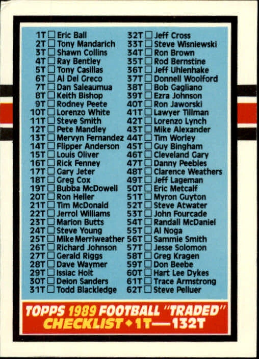 *****FOOTBALL BLOWOUT***** Please select the item(s) you wish to purchase from the list of 1989 Topps Traded Football cards available! These cards are in *MINT* condition. ***CHECK OUT MY OTHER CHEAP AUCTIONS*** I will ship worldwide (Save on shipping if you purchase more) Please message me if you have any questions. Thanks for looking and Happy Bidding!!!