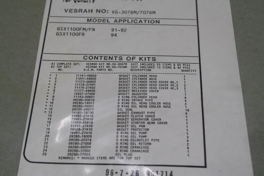This gasket set is a fantastic find for any GSX1100F Katana owner! Brand new old stock, unopened, made in Japan—perfect for a full rebuild. Fits multiple years and comes complete, so you get everything in one go. High-quality and ready to restore that legendary Suzuki engine. A must-have for serious restorers!