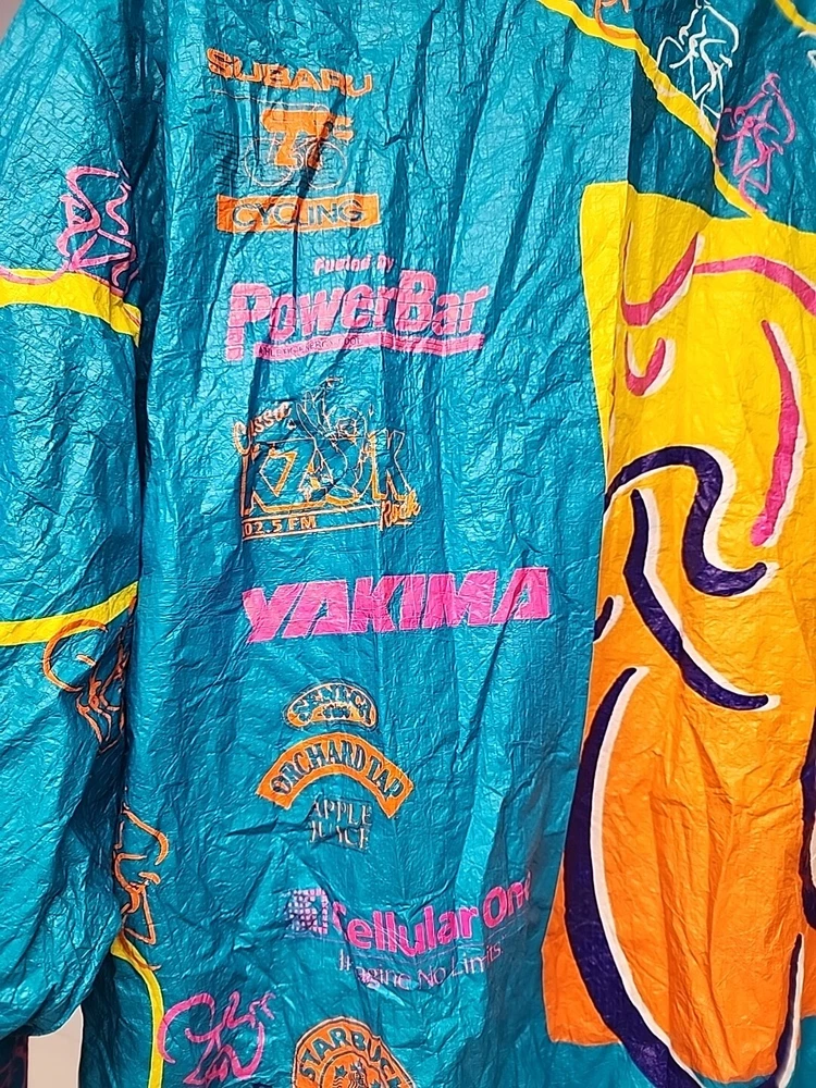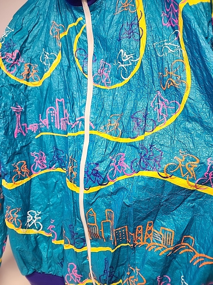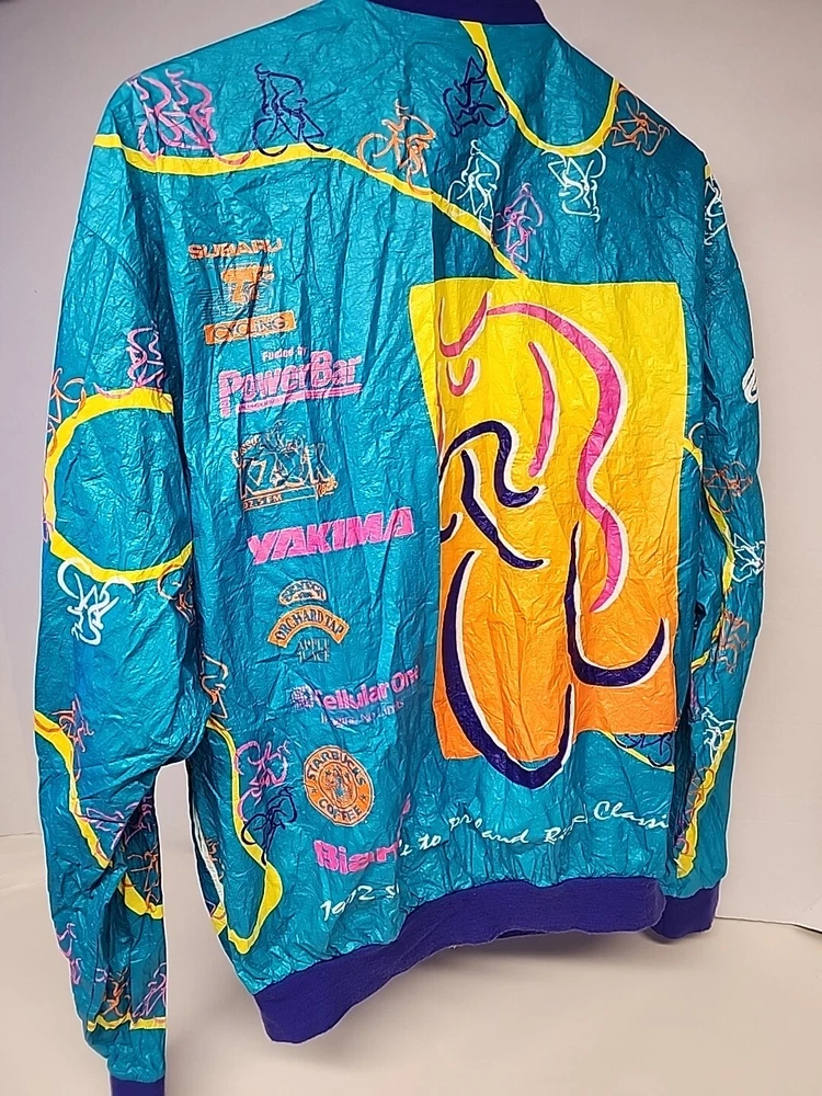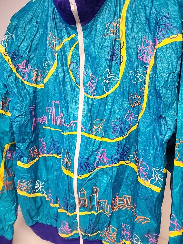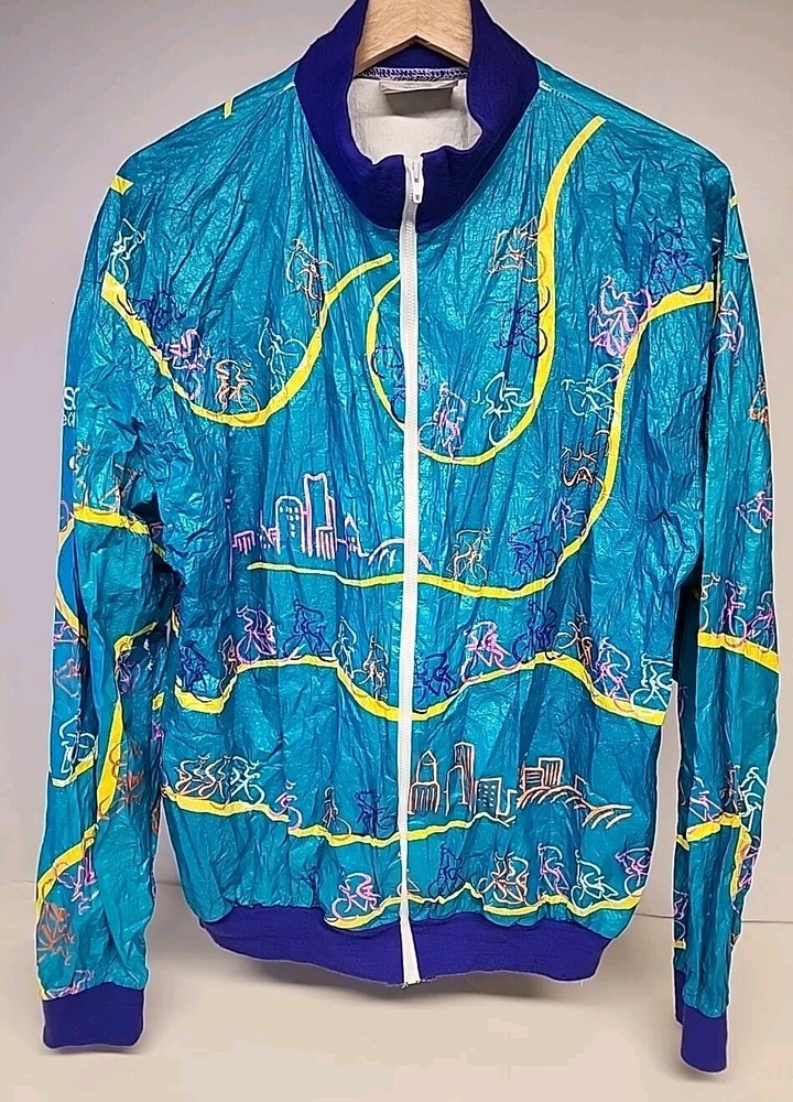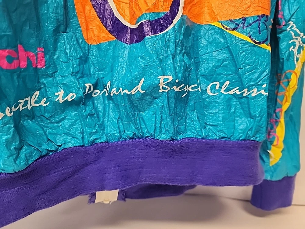 Good clean conditon, fully functional, nice cycling jacket, works good, nice vintage early 90s style, featuring the seattle and portland slyline and cool 90s cycling graphocs, as seen see photos!