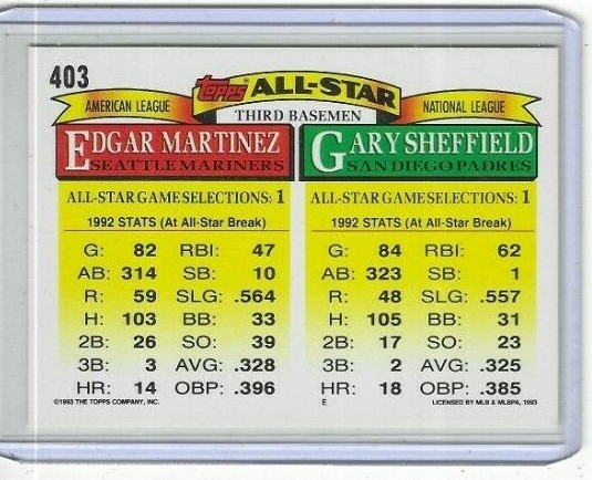 1993 Topps Edgar Martinez and Gary Sheffield #403 Seattle Mariners and San Diego Padres All Star baseball card. Stock photo . If you are looking for your favorite player just visit my store and type the players name or team into the search block. Most of my listings start at .99 cents. An excellent way to fill your set or just to collect your favorite player/team. Shipping and handling will be .75 cents.