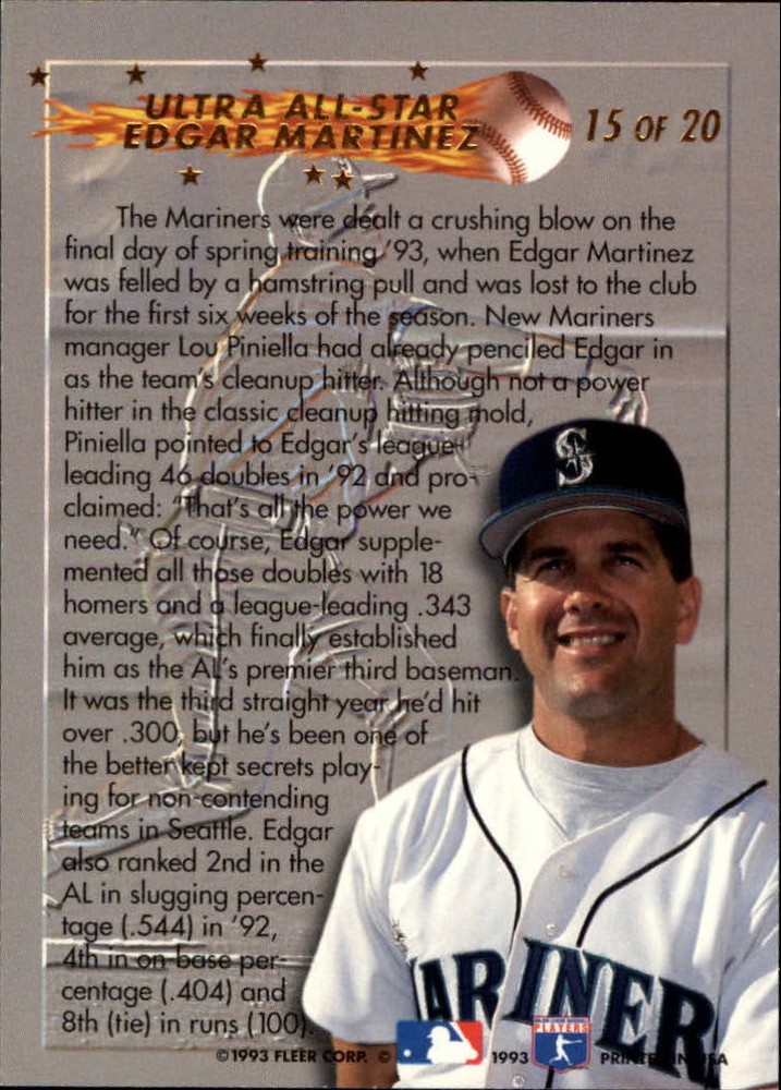 1993 Ultra All-Stars #15 Edgar Martinez - NM-MT Front Back Sport: Baseball Set: 1993 Ultra All-Stars Year: 1993 Item#: 15 Player: Edgar Martinez Team: Seattle Mariners Brand: Ultra Manufacturer: Fleer Inc. Grading Company: Raw Grade SetType: Insert Item Condition: Near Mint/Mint 2014 Beckett Collectibles, LLC. All Rights Reserved Powered by: All orders are shipped in a minimum of a bubble mailer with a box for larger orders or orders with graded cards. All domestic orders are shipped with delivery confirmation. Listings may have stock photos. If the title & the picture do not match. It is probably an error in the picture, PLEASE ASK BEFORE YOU BUY to make sure. If the card is serial numbered, it may no longer match the one pictured, as we have literally millions of cards. ASK before you buy if there are ANY questions. We combine shipping. For normal sized/thickness cards, we ship up to 20 for the $4 fee. Odd-sized, thicker and graded cards may be more expensive. Domestic S&H is $4 for first class mail Graded or Uncirculated cards may be more to ship. We are no longer shipping international orders. If you live outside the United States and wish to place an order, please set up an account with one of the international drop shipping companies or one of the companies in the U.S. that will warehouse your items for you. <!--##BCILogoStart##--> <!--##BCILogoEnd##-->