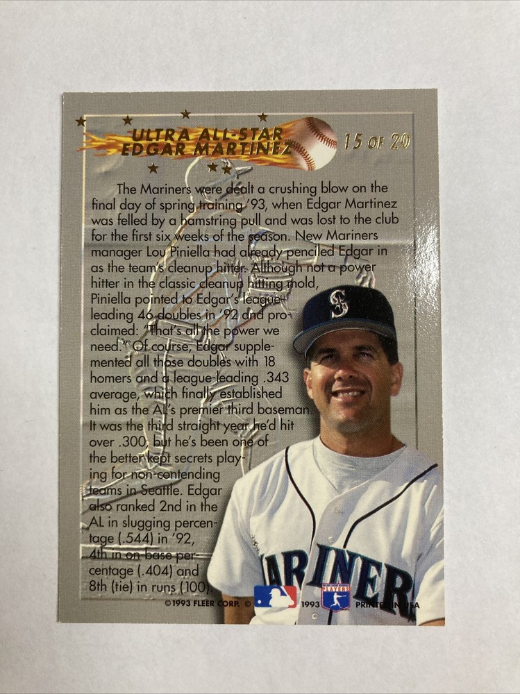 1993 Ultra All-Stars #15 Edgar Martinez Seattle Mariners. Shipped with USPS First Class. Please refer to pictures for condition of card. Please select " Ebay for Trading Card Shipping " for the card to be shipped via White Envelope Please select " USPS first class shipping " for the card to be shipped via Bubble Mailer - Aka the more expensive option Thank you for your interest in this card!