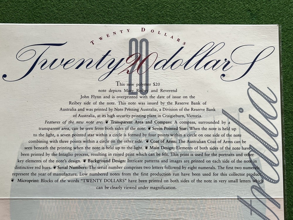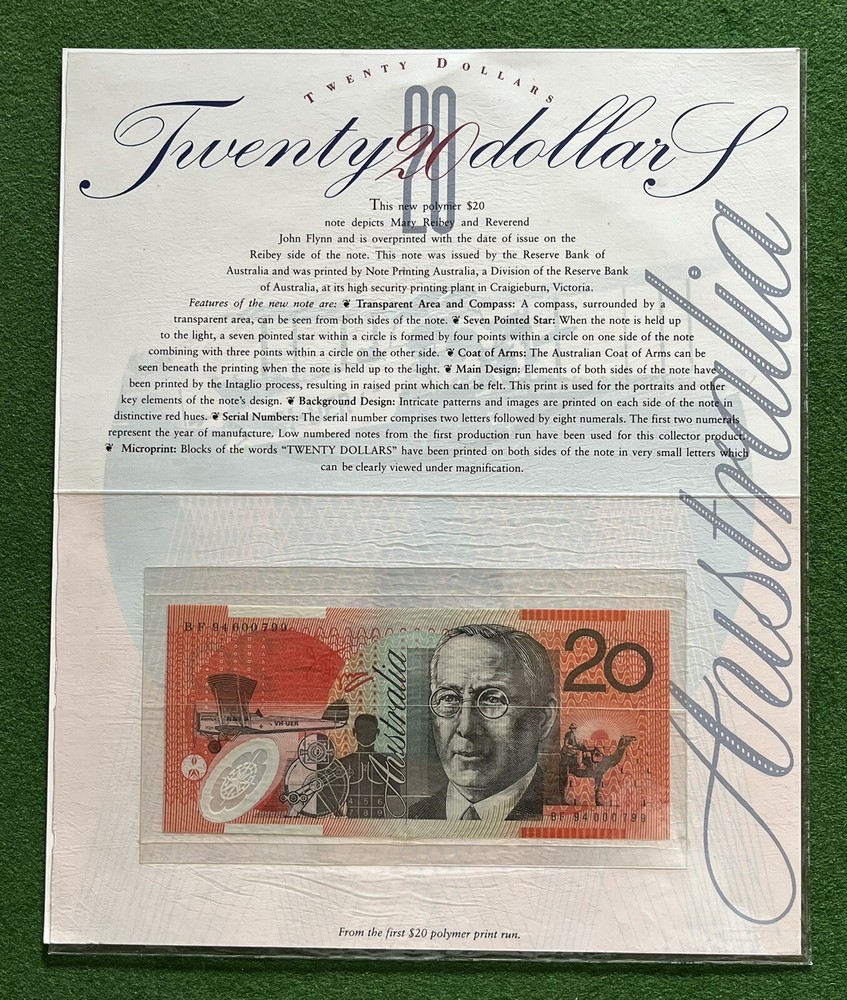 1994 FIRST $20 POLYMER PRINT LOW NUMBERED UNCIRCULATED NOTE IN FOLDER UNCIRCULATED CONDITION IN ORIGINAL FOLDER serial number BD 94000329 BD 94000331 BD 94000335 BD 94000336 BD 94000420 BD 94000623 BD 94000626 BD 94000627 BD 94000628 BD 94000630 BD 94000631 BD 94000632 BD 94000633 BD 94000634 BD 94000636 *Picture is a representation Please provide me with the serial number you need, or I'll randomly generate one if there's no specific request.