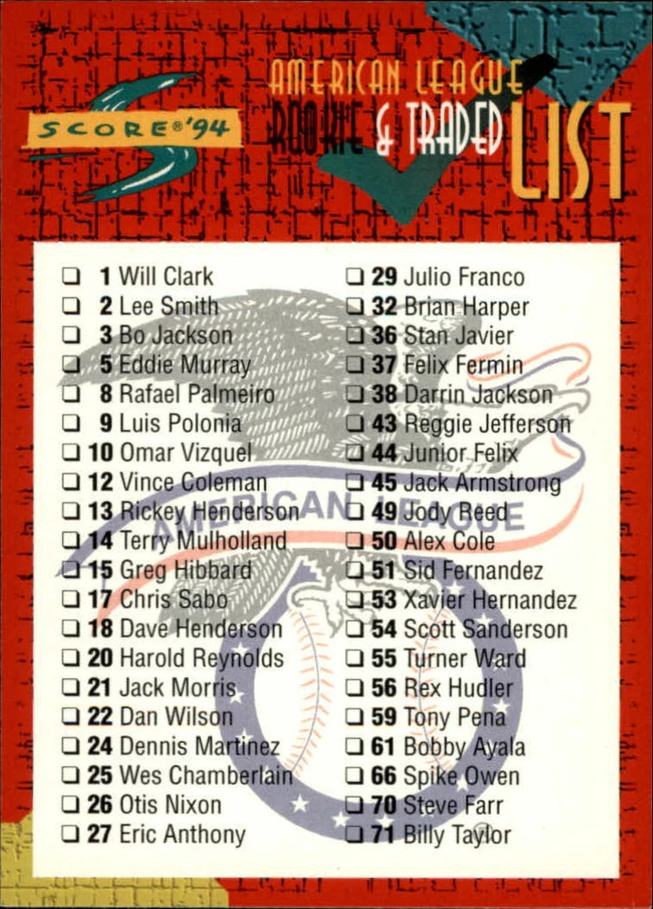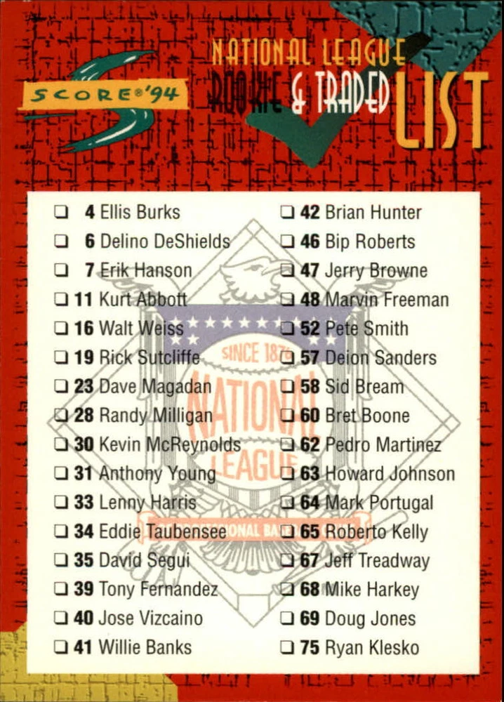 *****BASEBALL BLOWOUT***** Please select the item(s) you wish to purchase from the list of 1994 Score Rookie Traded Baseball cards available! These cards are in *MINT* condition (Images are stock photos). ***CHECK OUT MY OTHER CHEAP AUCTIONS*** I will ship worldwide (ask me for shipping costs if you do not live in the U.S.) Please message me if you have any questions. Thanks for looking and Happy Bidding!!!