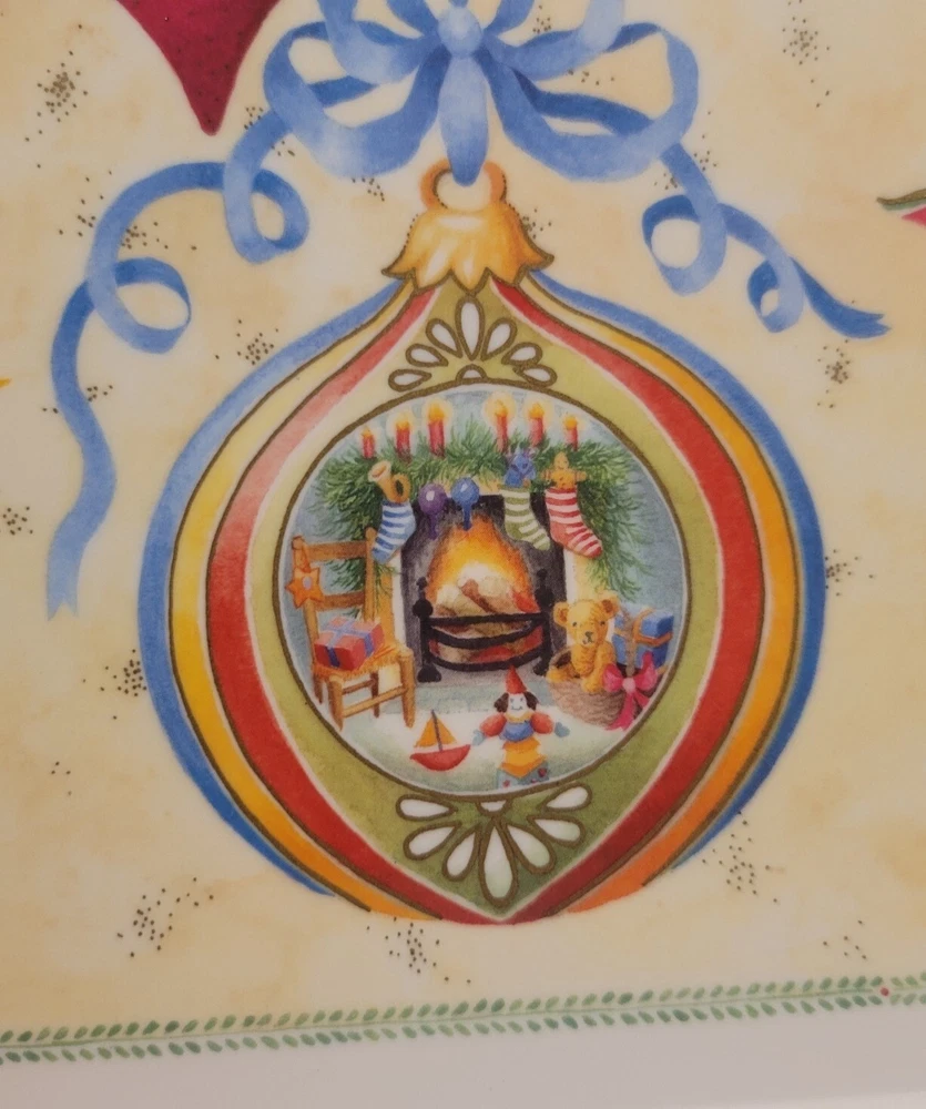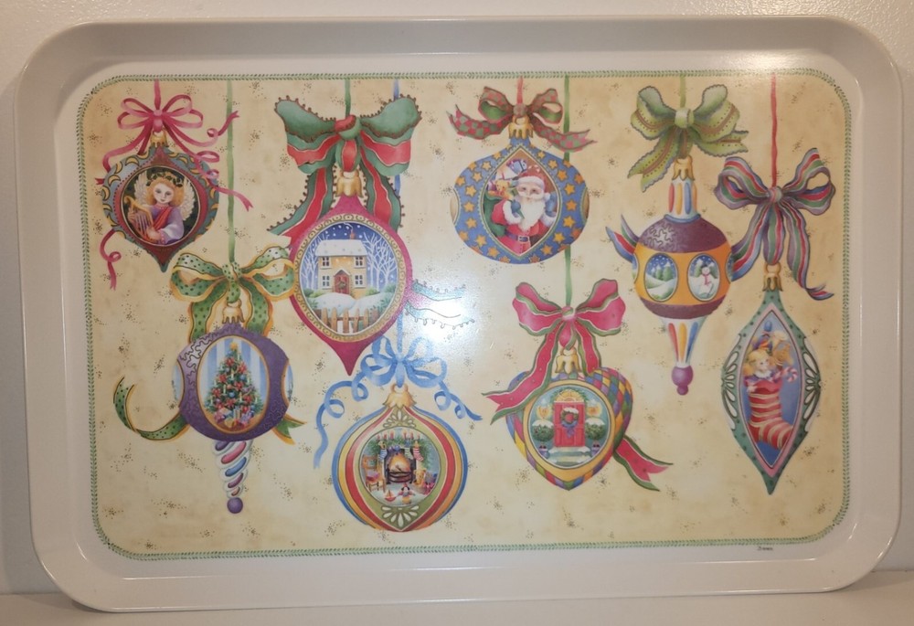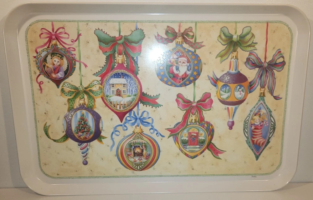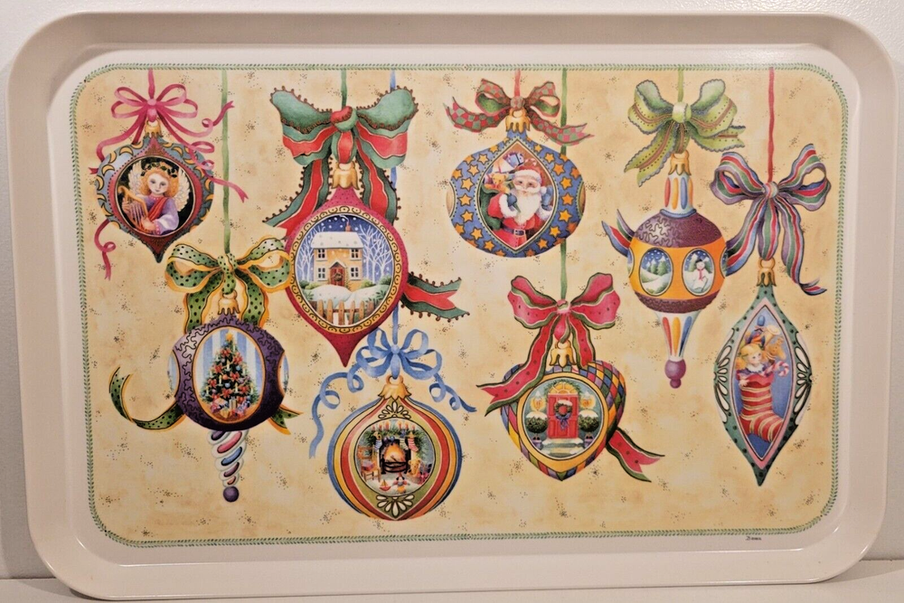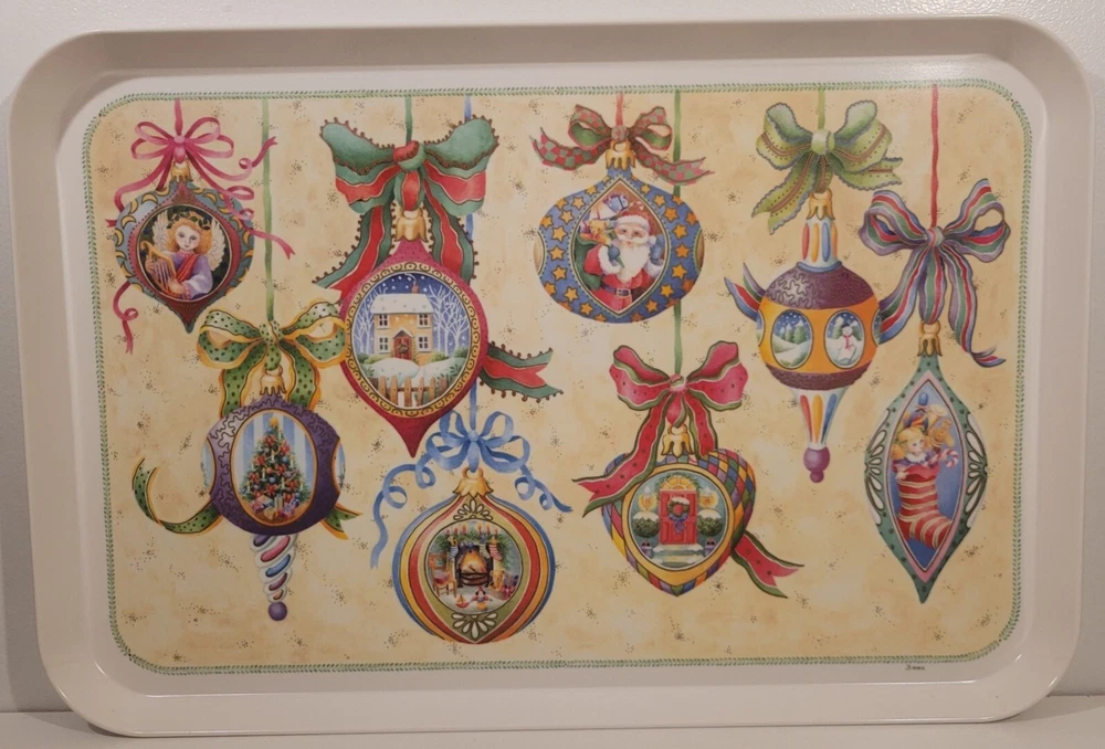 1995 Melamine Serving Tray Vintage Christmas Ornaments design Italy -17-in x11-in Add a touch of vintage charm to your kitchen this Christmas Holiday with this stunning melamine serving tray featuring beautifully colored, vintage Christmas ornament art designs. An original Design Imports serving tray made in Italy, the rectangular shape is ideal for easy storage and the sturdy melamine material ensures durability. Marked on front: “B copyright 1995 DIL” Marked on back: "Design Imports LTD Providence R.I. - Made in Italy” Measurements approximately: 17.5” L x 11.75” W x 0.75” H. Pre-owned, very good vintage condition - minor scuffs from normal usage - See photos for complete condition details. International buyers please check shipping costs before purchasing. Combined shipping is available, just request a combined invoice before paying. Feedback is greatly appreciated and always reciprocated. If you have any issues with this purchase please contact me, we will make every effort to make sure you are satisfied. #christmasornaments #christmasservingtray #vintagechristmas