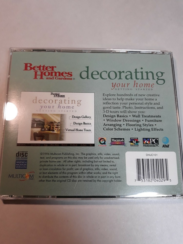 1996 Better Homes and Gardens-Decorating Your Home:Getting Started Software CD Rom. For windows and Macintosh version 3-D tours. Exploring hundreds of New creations Like new ConditionAs shown in pictures If you have any questions about item please feel free to contact Thanks for looking Shipped with USPS Media Package.