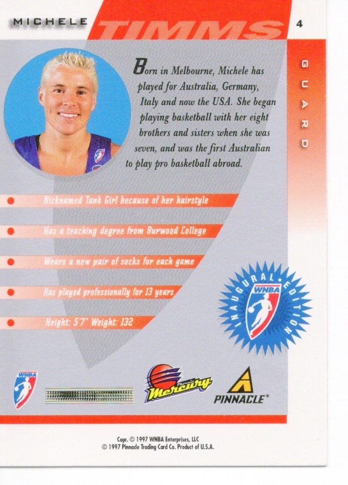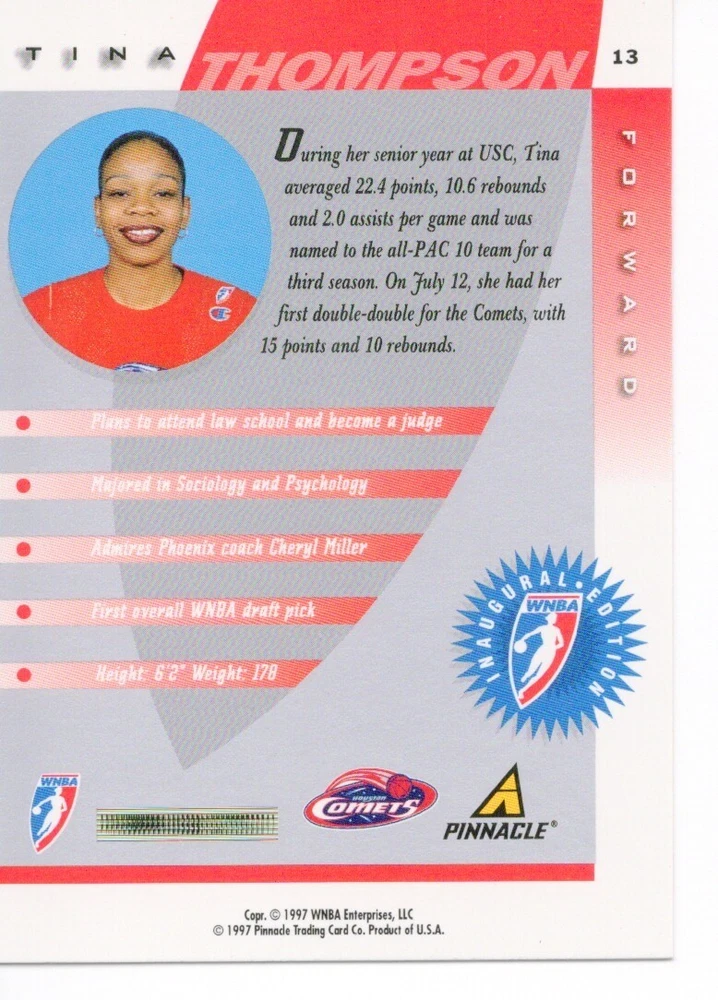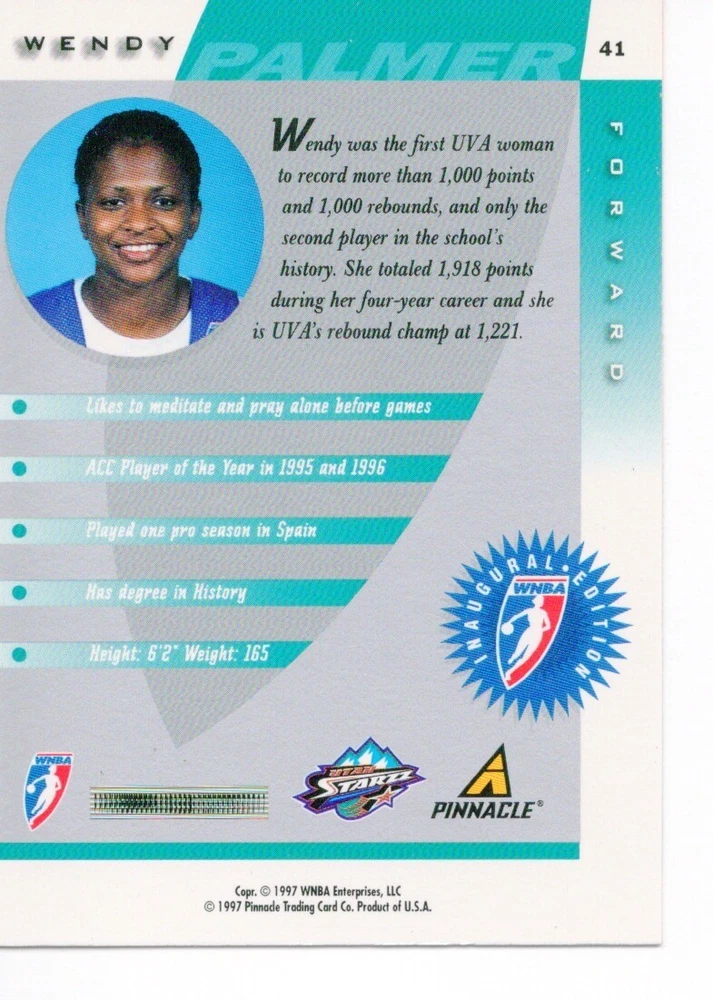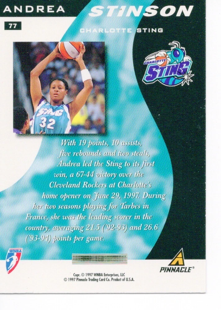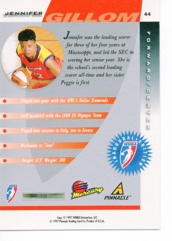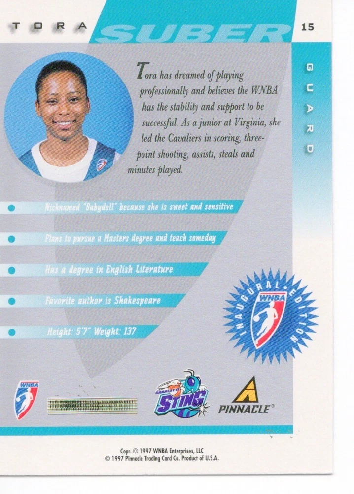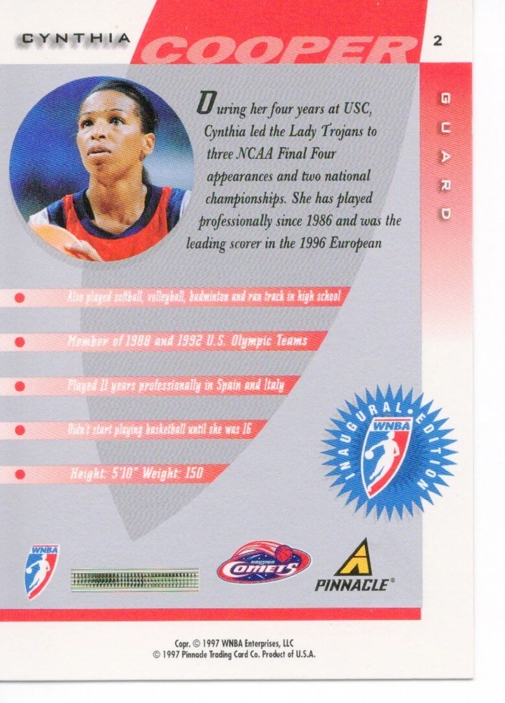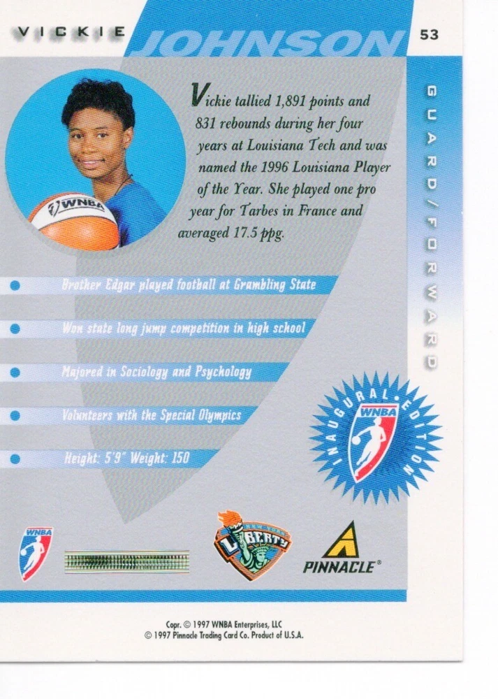 1997 WNBA Pinnacle Inside Inaugural RC's - Pick from List - Complete Your Set 🔥 Please pick the item(s) you wish to purchase from the list and add to your shopping cart. If you purchase each item separately, we will not be able to combine your purchases. Please go to your cart and complete the checkout once you are done with your purchases. Shipping and handling Payment Methods Shipped in plastic sleeve and a top loader eBay standard envelope $1.20 and $1.00 for each additional eligible item you buy from carberry. Pay a maximum of $4.75 shipping on all eligible items from carberry. Offering combined shipping discounts