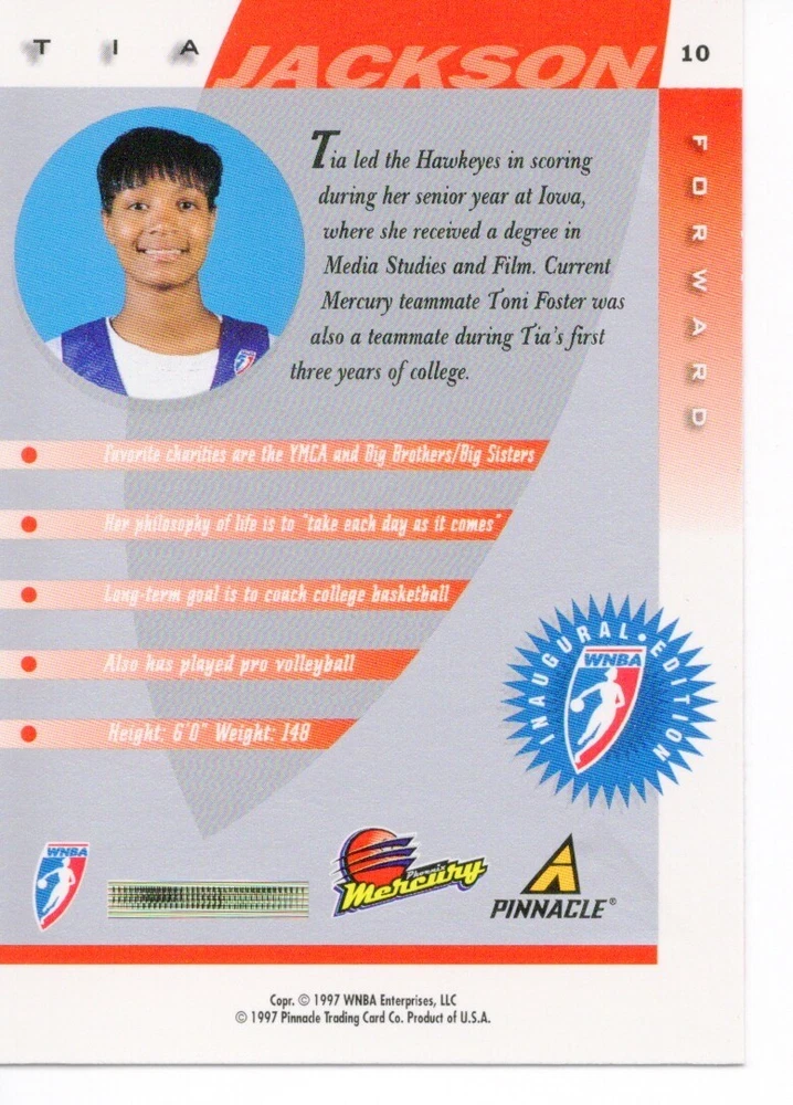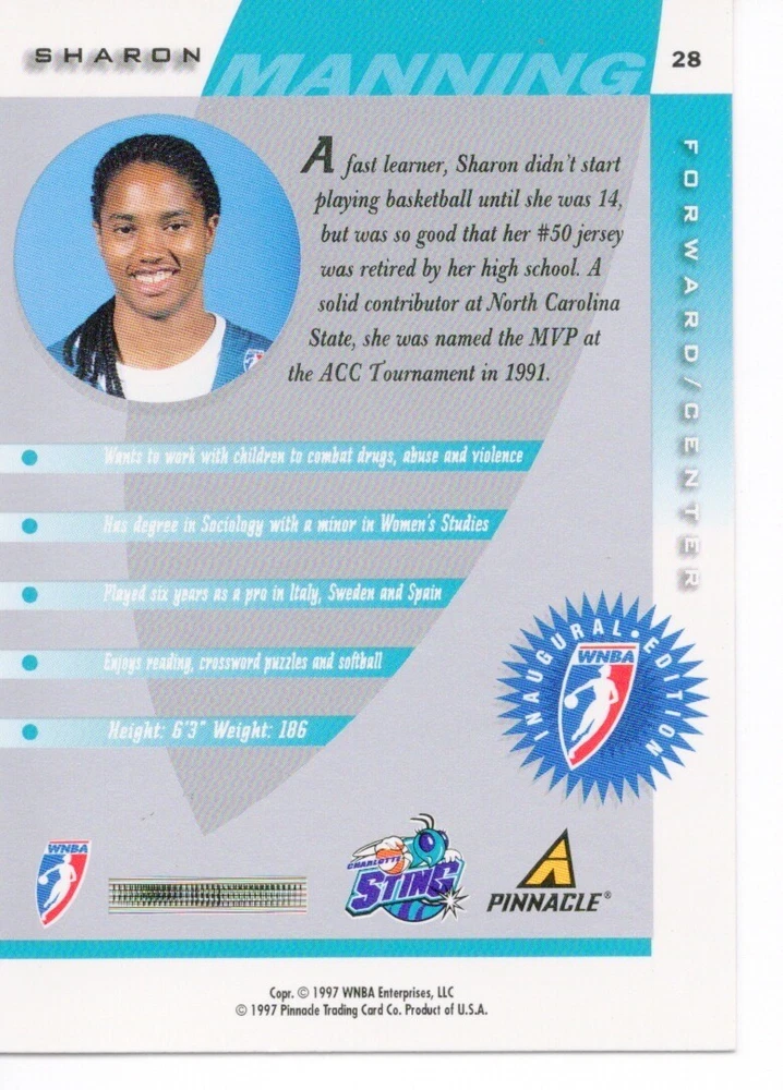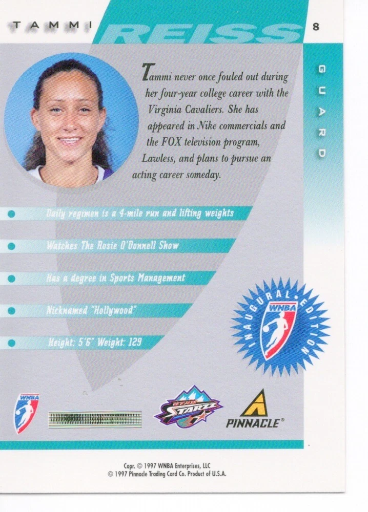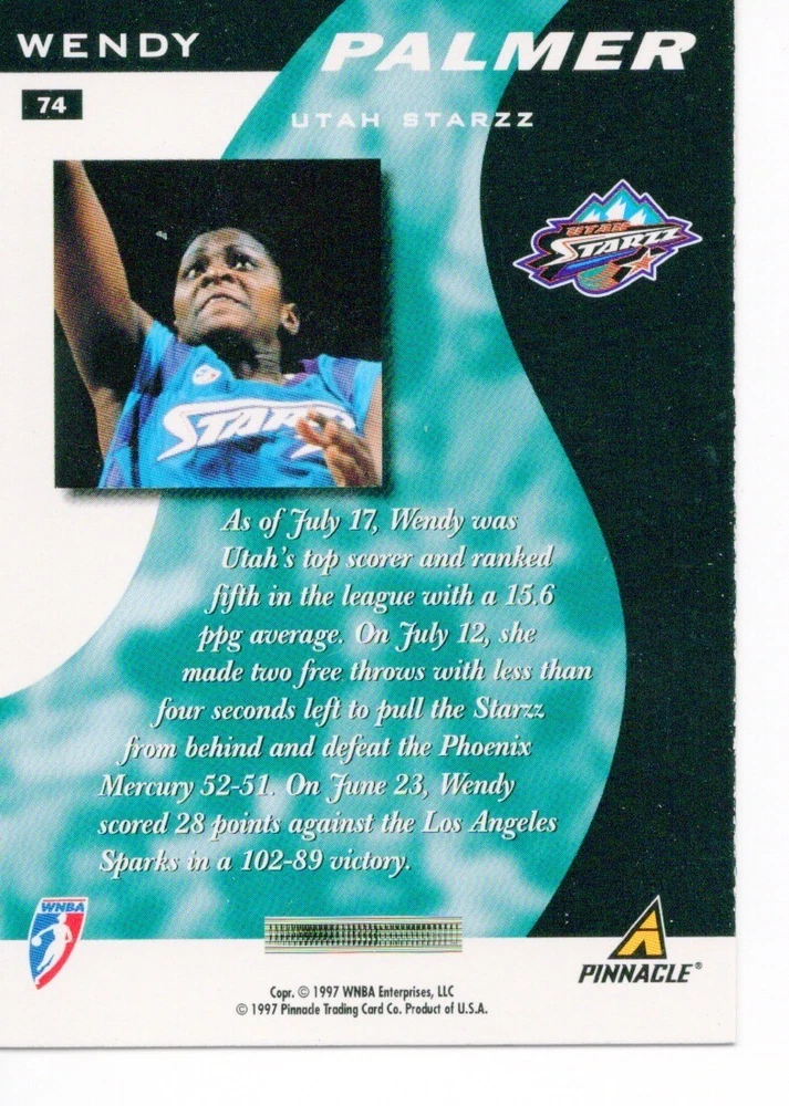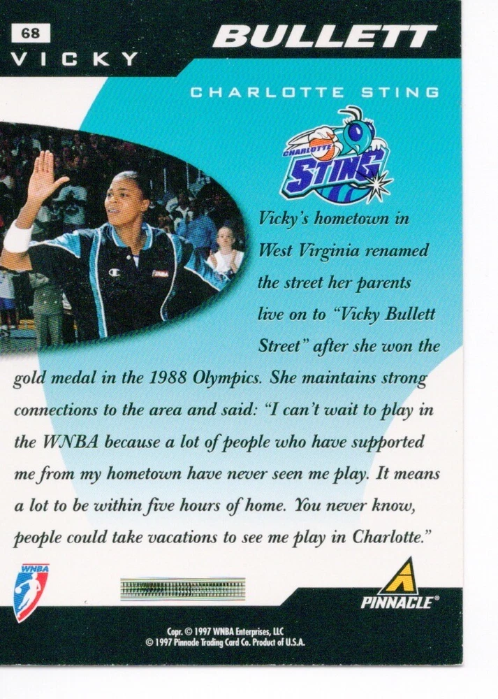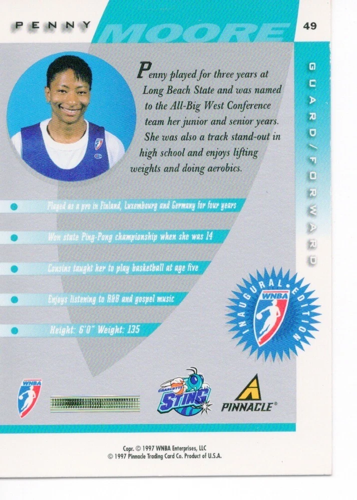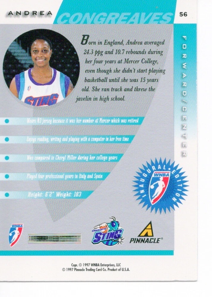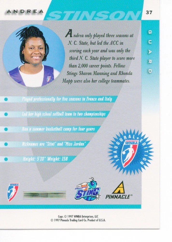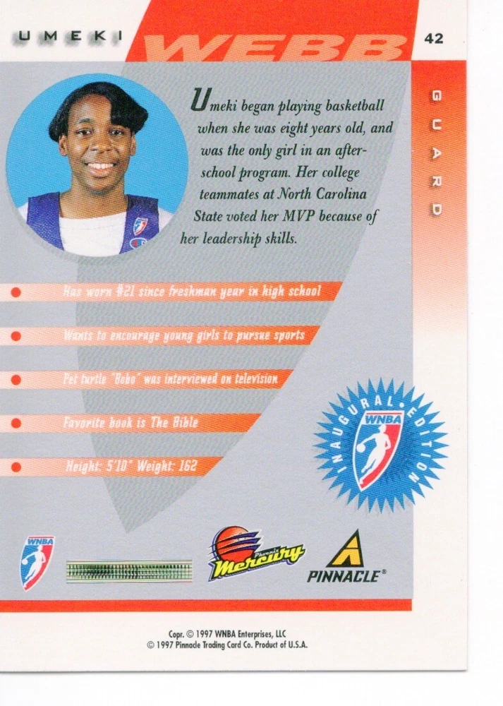 1997 WNBA Pinnacle Inside Inaugural RC's - Pick from List - Complete Your Set 🔥 Please pick the item(s) you wish to purchase from the list and add to your shopping cart. If you purchase each item separately, we will not be able to combine your purchases. Please go to your cart and complete the checkout once you are done with your purchases. Shipping and handling Payment Methods Shipped in plastic sleeve and a top loader eBay standard envelope $1.20 and $1.00 for each additional eligible item you buy from carberry. Pay a maximum of $4.75 shipping on all eligible items from carberry. Offering combined shipping discounts