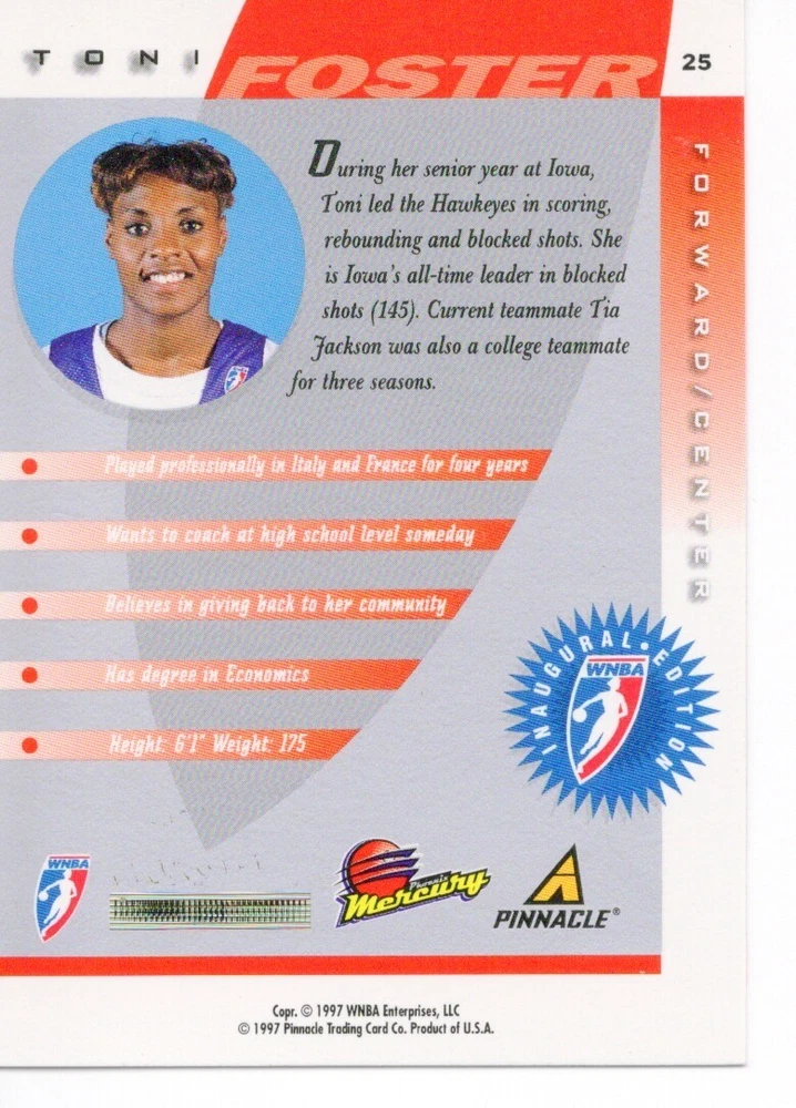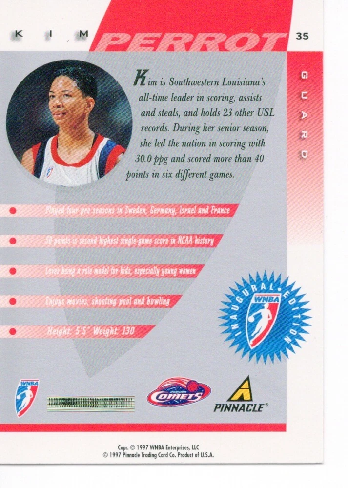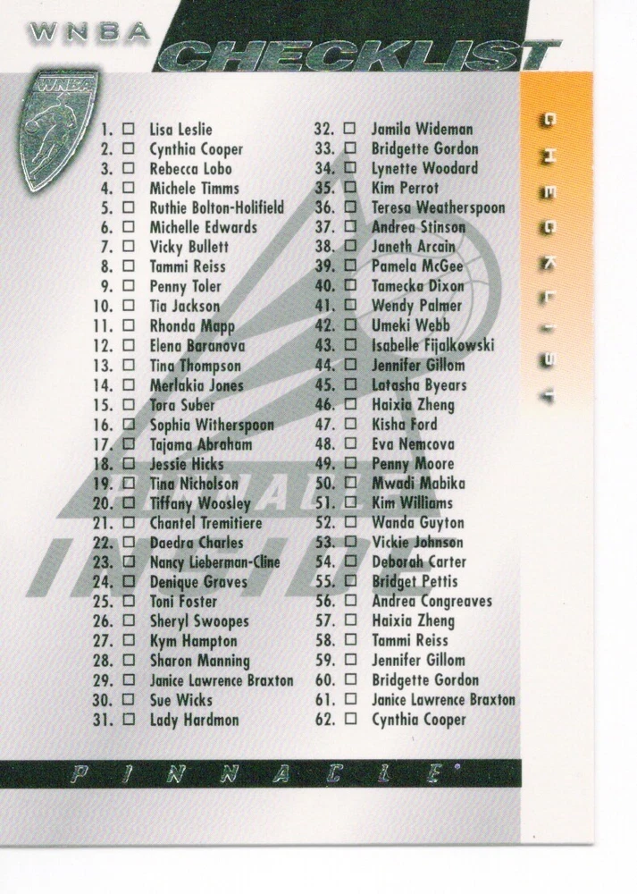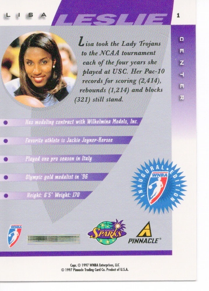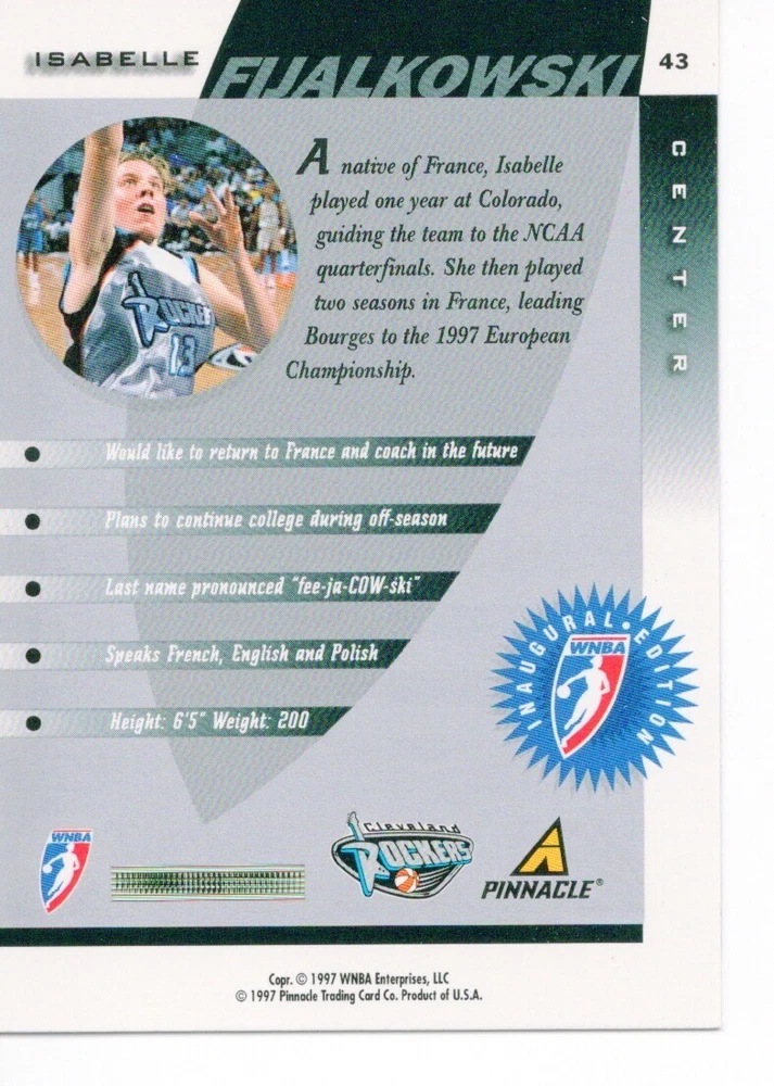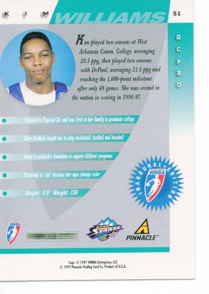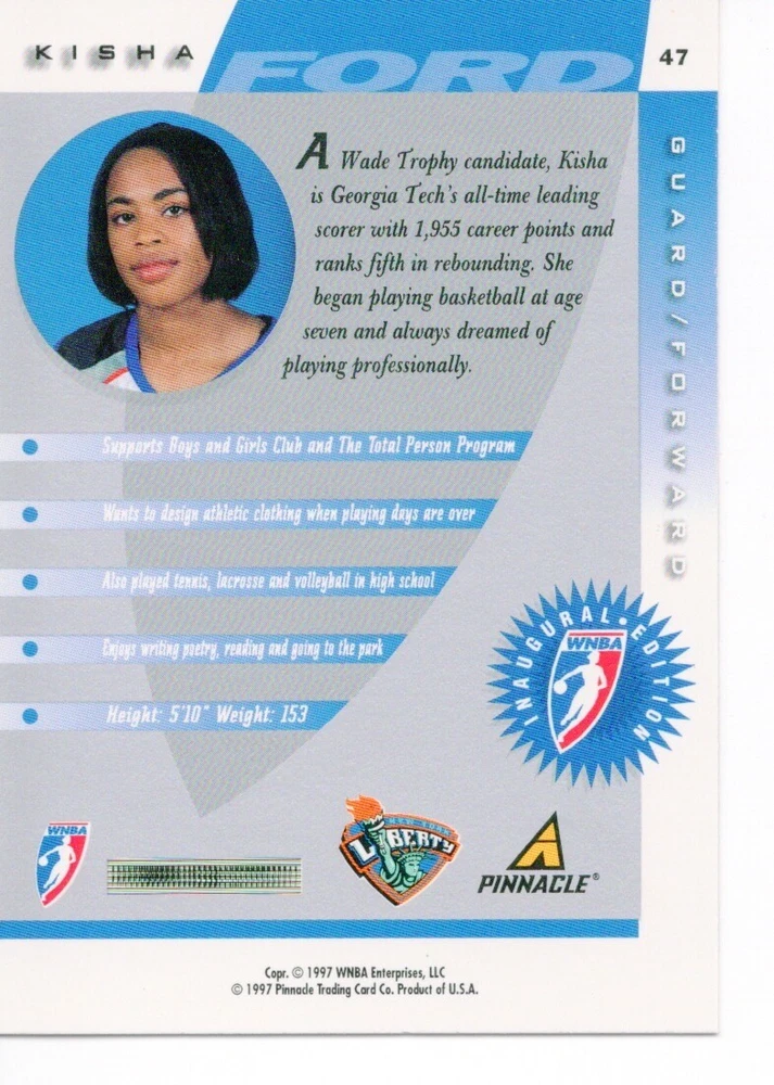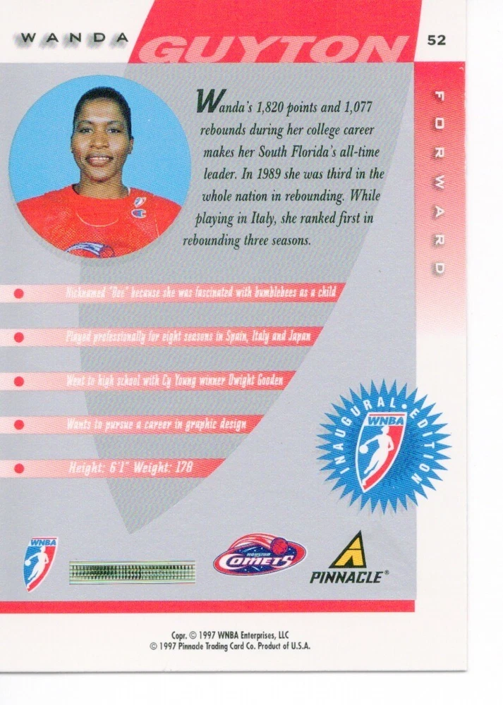1997 WNBA Pinnacle Inside Inaugural RC's - Pick from List - Complete Your Set 🔥 Please pick the item(s) you wish to purchase from the list and add to your shopping cart. If you purchase each item separately, we will not be able to combine your purchases. Please go to your cart and complete the checkout once you are done with your purchases. Shipping and handling Payment Methods Shipped in plastic sleeve and a top loader eBay standard envelope $1.20 and $1.00 for each additional eligible item you buy from carberry. Pay a maximum of $4.75 shipping on all eligible items from carberry. Offering combined shipping discounts