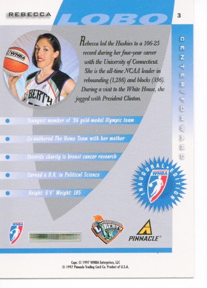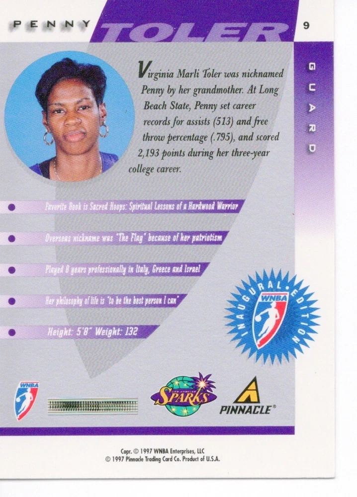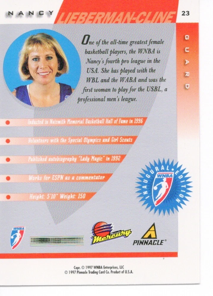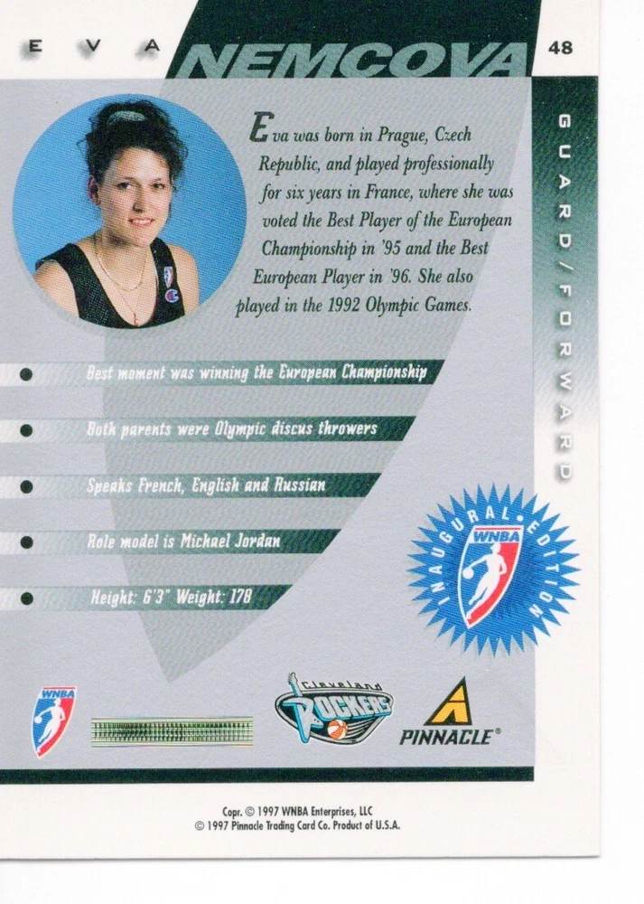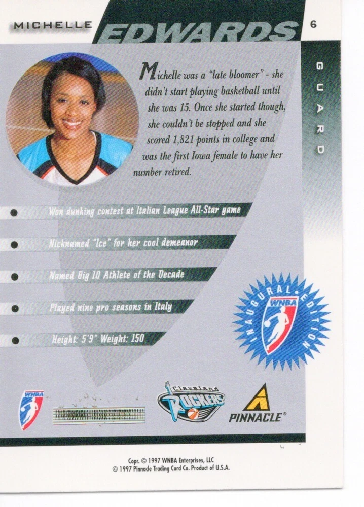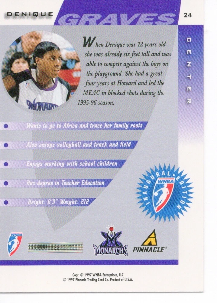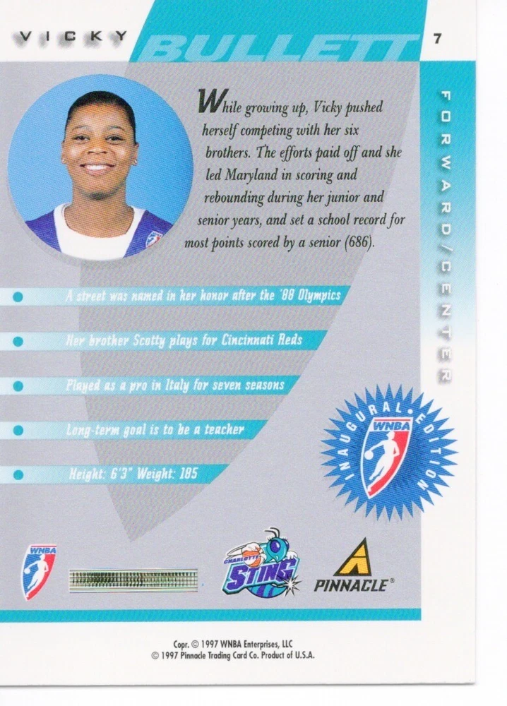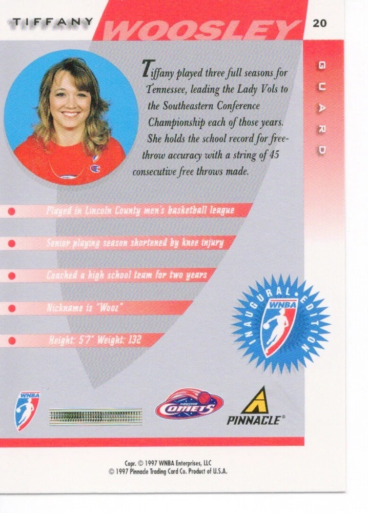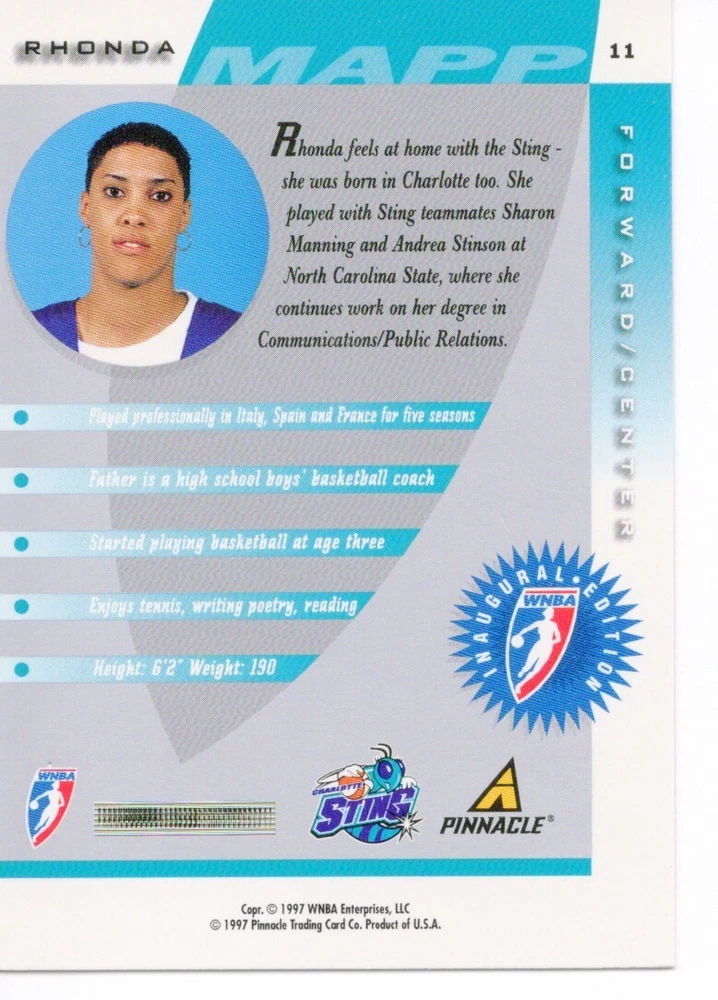 1997 WNBA Pinnacle Inside Inaugural RC's - Pick from List - Complete Your Set 🔥 Please pick the item(s) you wish to purchase from the list and add to your shopping cart. If you purchase each item separately, we will not be able to combine your purchases. Please go to your cart and complete the checkout once you are done with your purchases. Shipping and handling Payment Methods Shipped in plastic sleeve and a top loader eBay standard envelope $1.20 and $1.00 for each additional eligible item you buy from carberry. Pay a maximum of $4.75 shipping on all eligible items from carberry. Offering combined shipping discounts