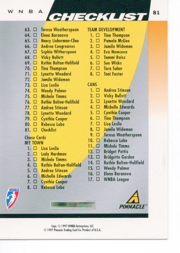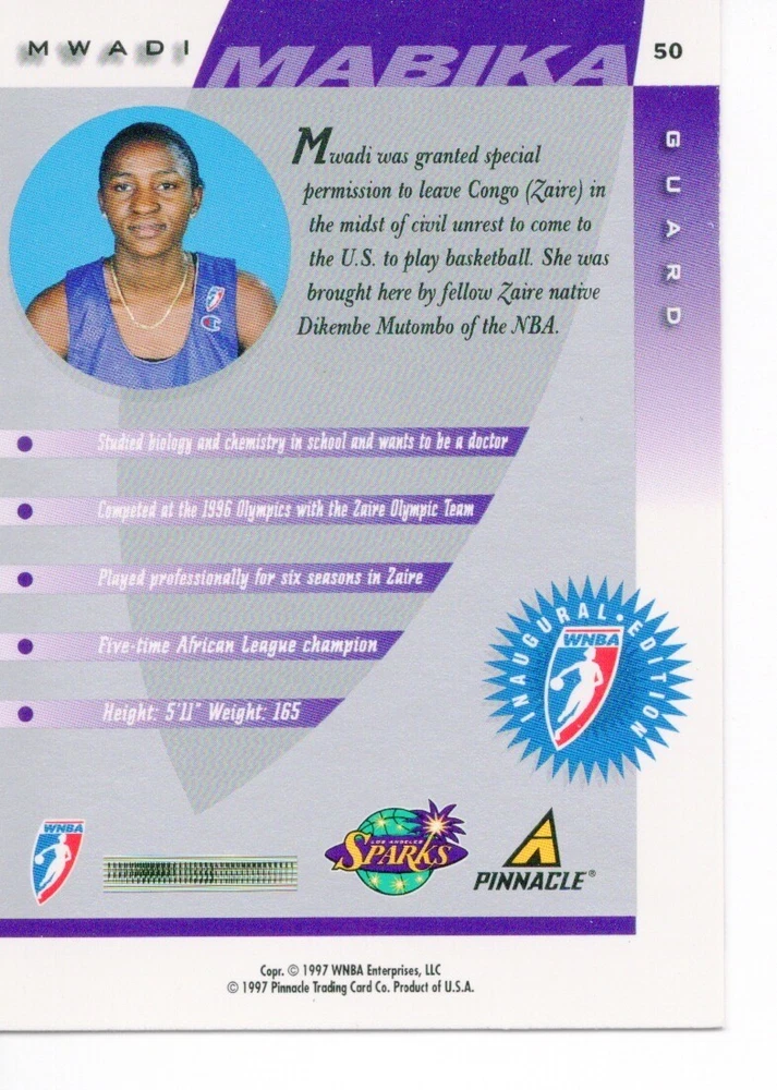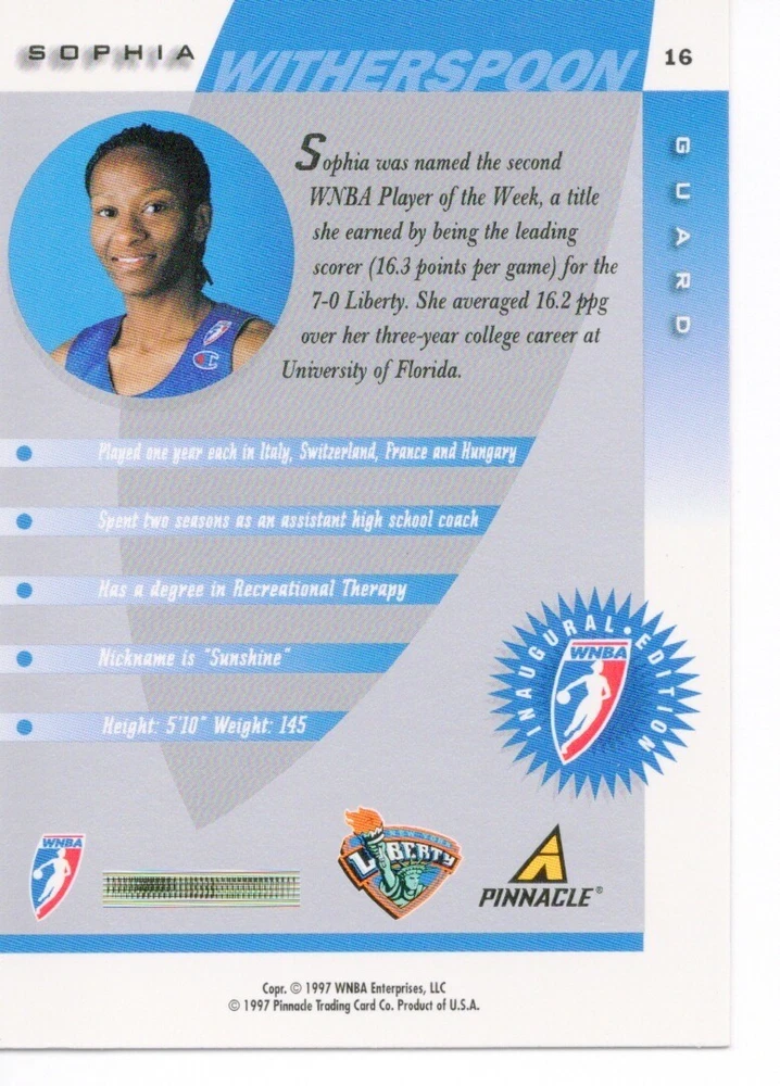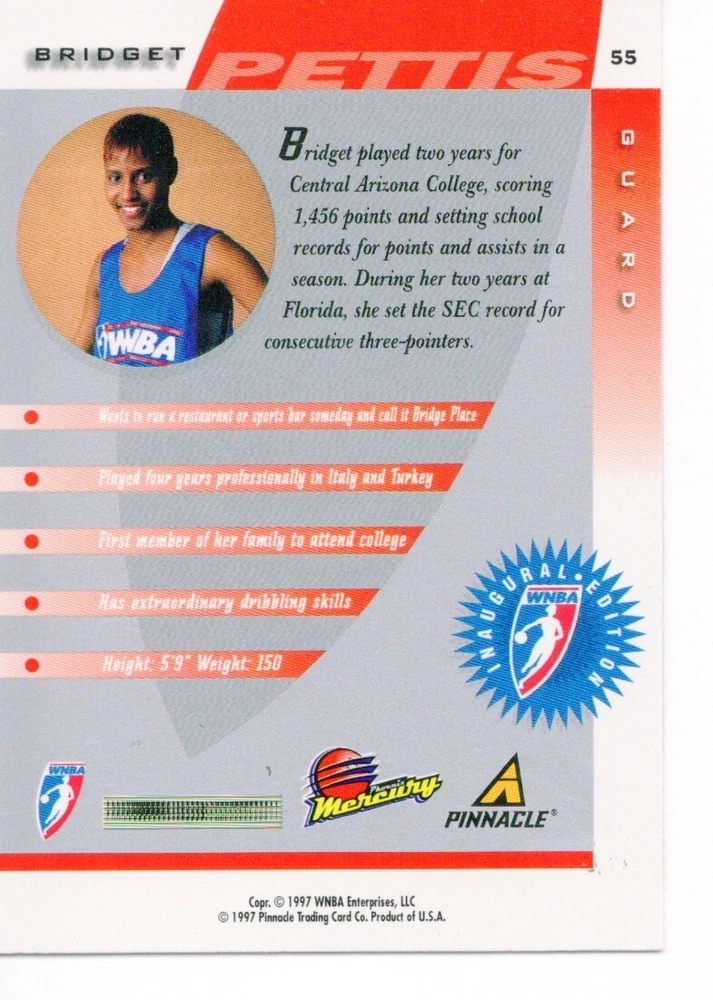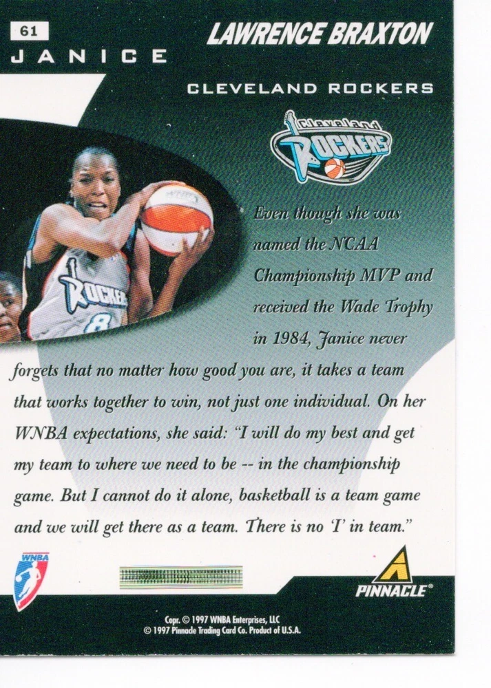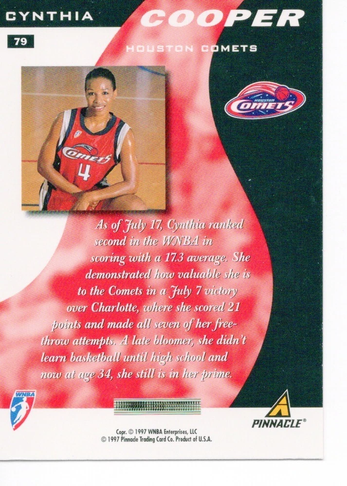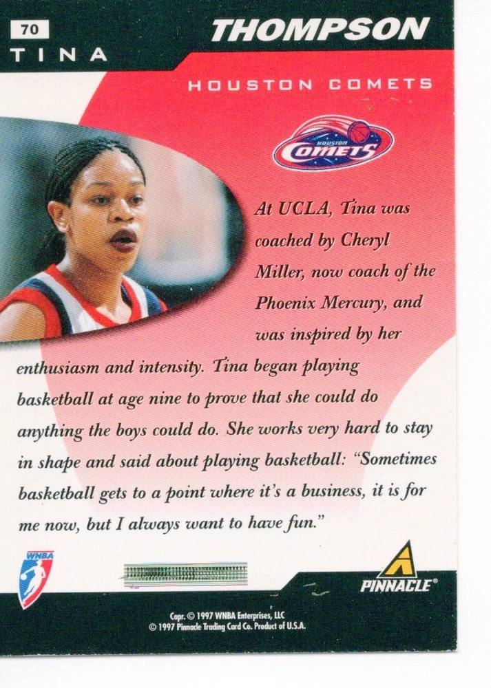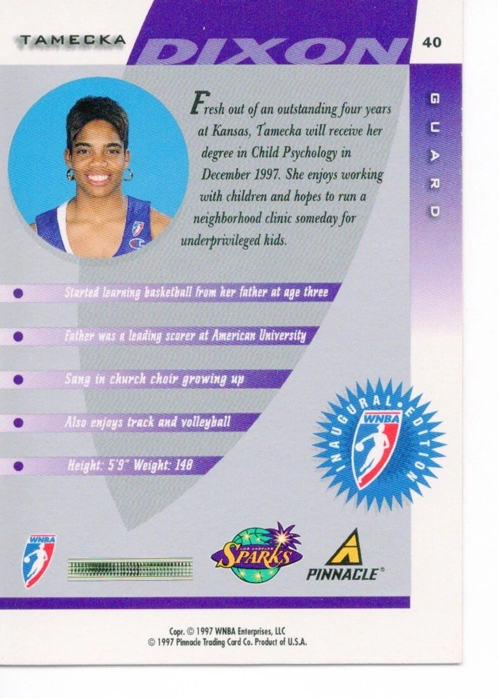 1997 WNBA Pinnacle Inside Inaugural RC's - Pick from List - Complete Your Set 🔥 Please pick the item(s) you wish to purchase from the list and add to your shopping cart. If you purchase each item separately, we will not be able to combine your purchases. Please go to your cart and complete the checkout once you are done with your purchases. Shipping and handling Payment Methods Shipped in plastic sleeve and a top loader eBay standard envelope $1.20 and $1.00 for each additional eligible item you buy from carberry. Pay a maximum of $4.75 shipping on all eligible items from carberry. Offering combined shipping discounts
