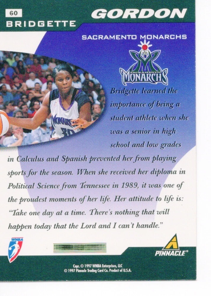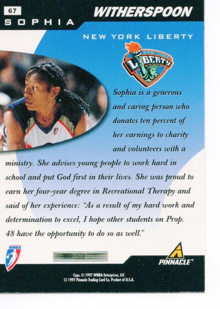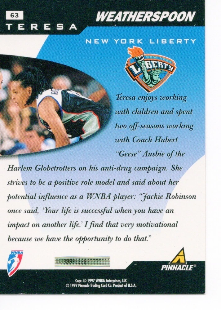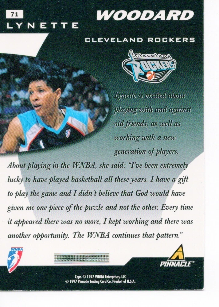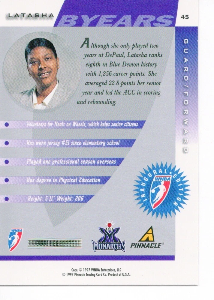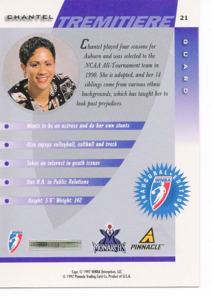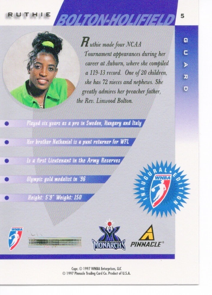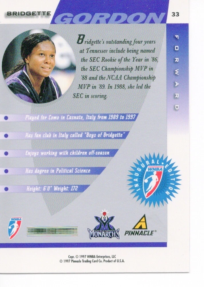 1997 WNBA Pinnacle Inside Inaugural RC's - Pick from List - Complete Your Set 🔥 Please pick the item(s) you wish to purchase from the list and add to your shopping cart. If you purchase each item separately, we will not be able to combine your purchases. Please go to your cart and complete the checkout once you are done with your purchases. Shipping and handling Payment Methods Shipped in plastic sleeve and a top loader eBay standard envelope $1.20 and $1.00 for each additional eligible item you buy from carberry. Pay a maximum of $4.75 shipping on all eligible items from carberry. Offering combined shipping discounts