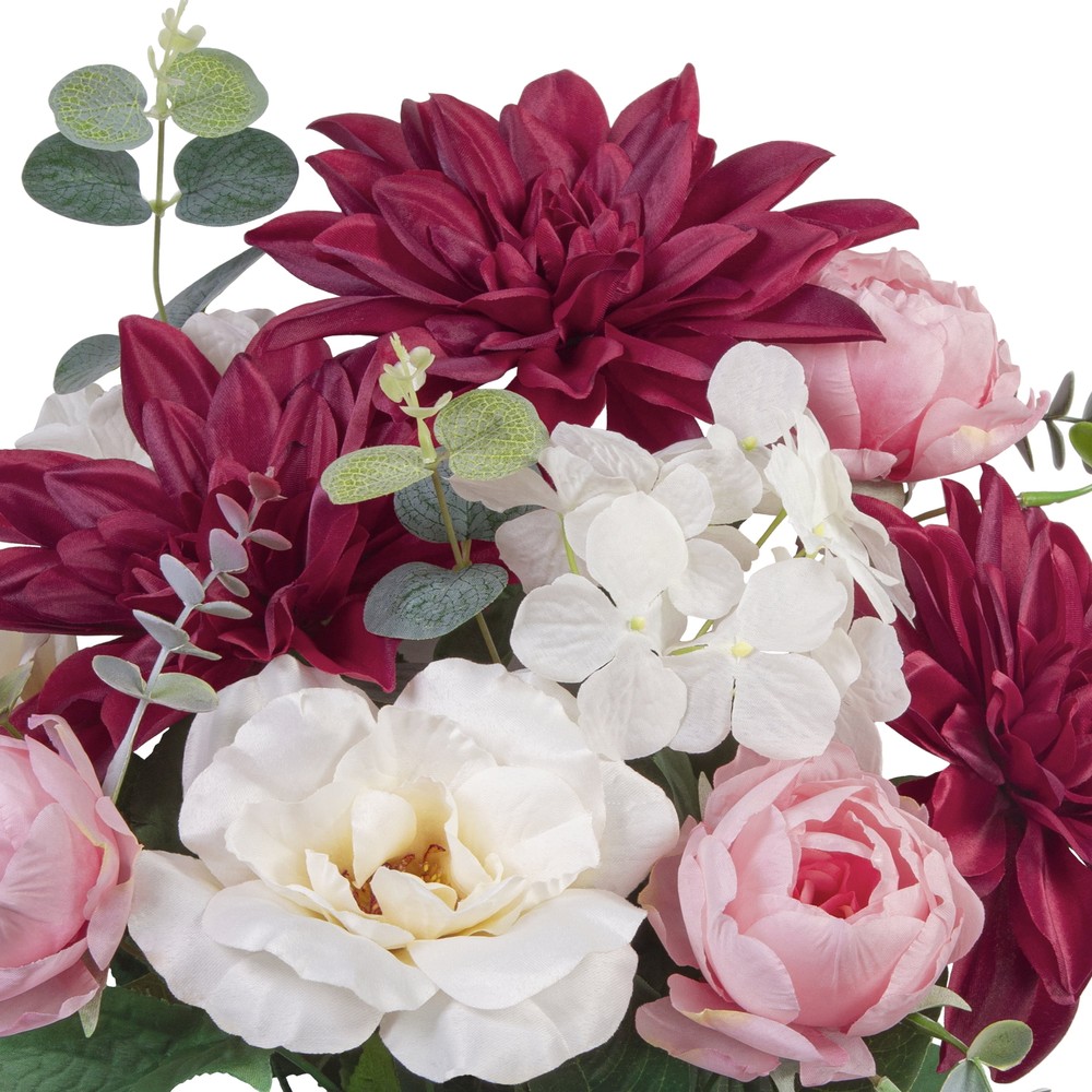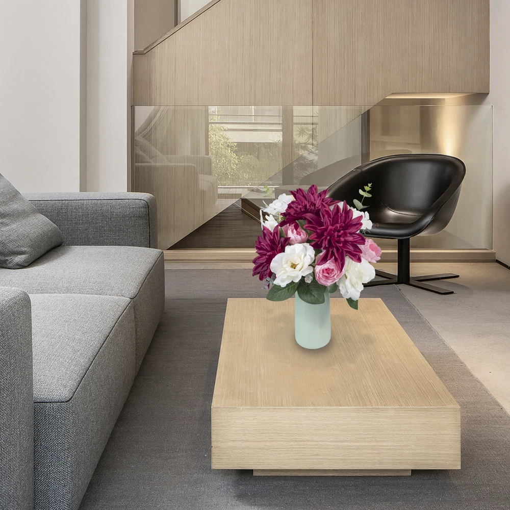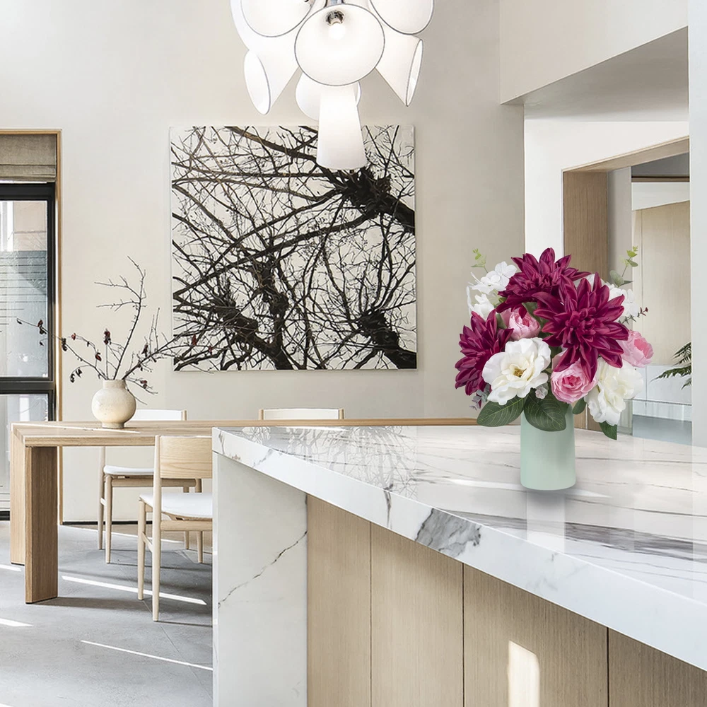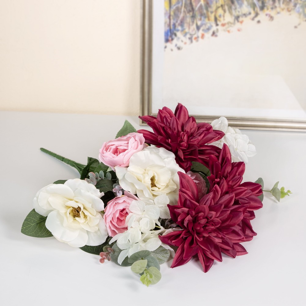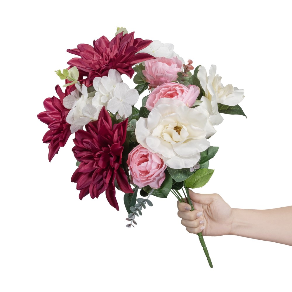 This gorgeous bouquet brings elegance to any space with its rich burgundy dahlias and delicate white roses. The mix of blooms and greenery looks so lifelike, yet requires zero maintenance—perfect for adding a pop of color to tables, mantels, or entryways. The sturdy stems make arranging a breeze, and the silk fabric holds up beautifully. Love how versatile it is for DIY projects or standalone decor!