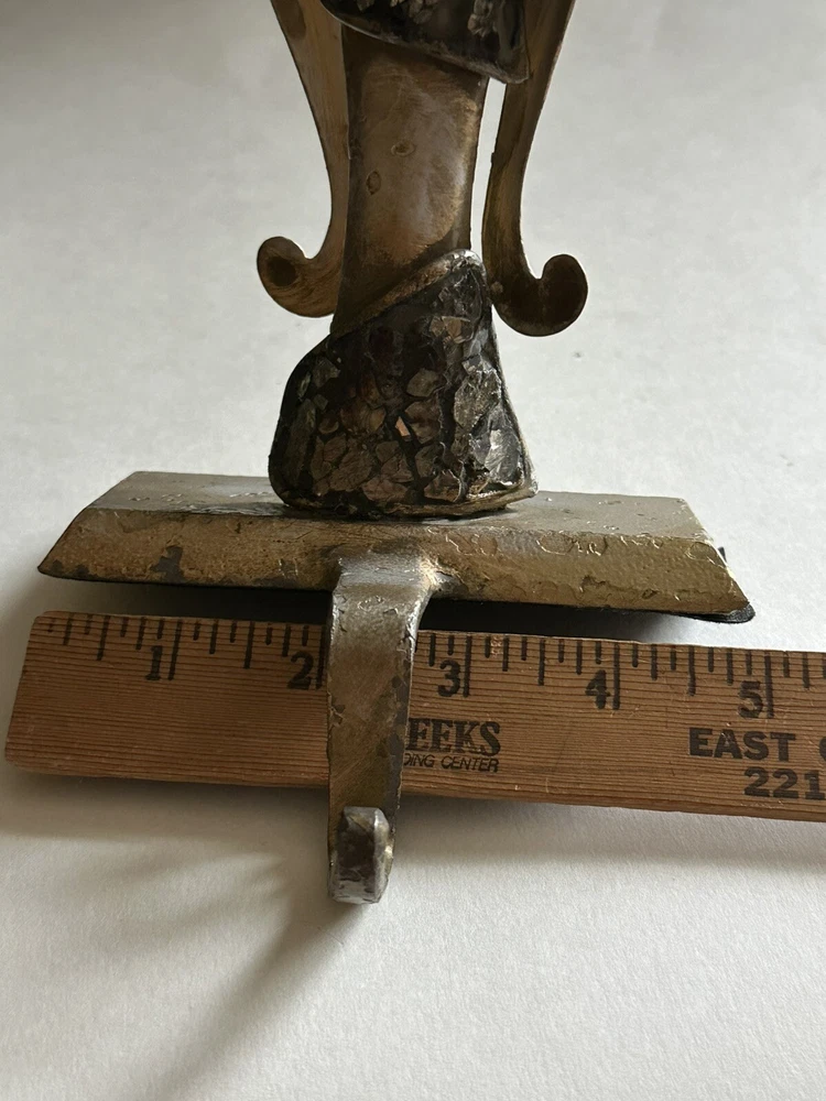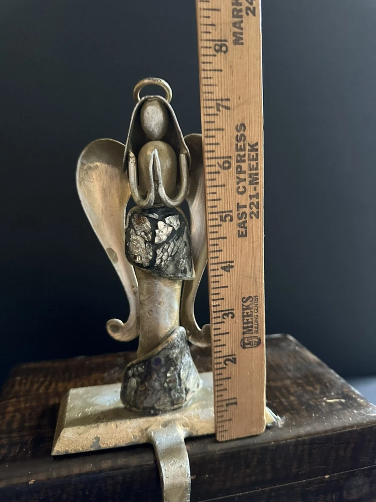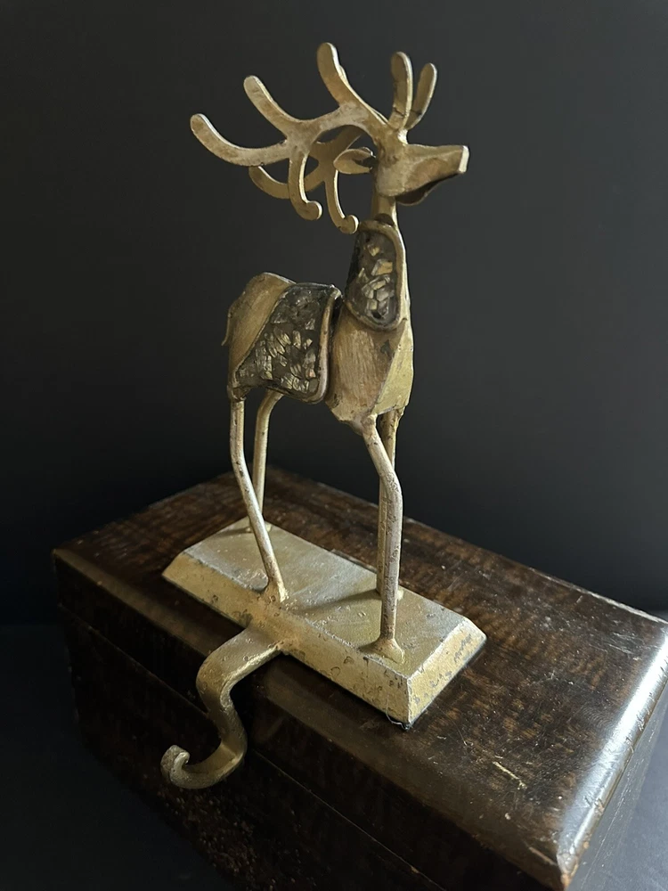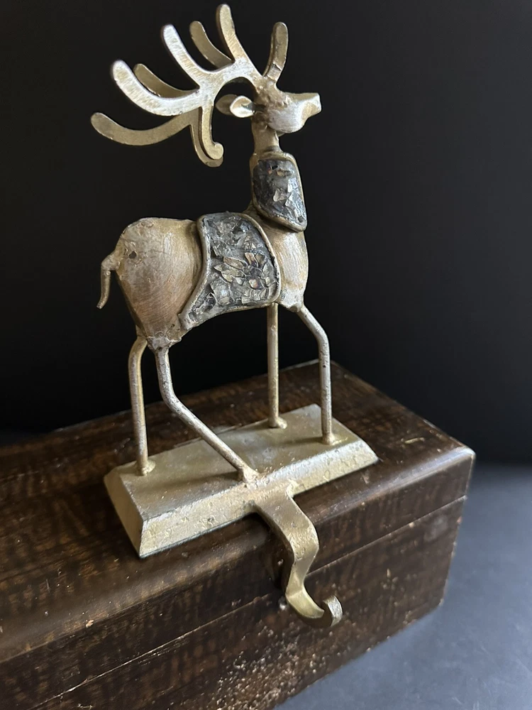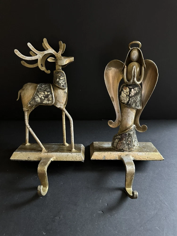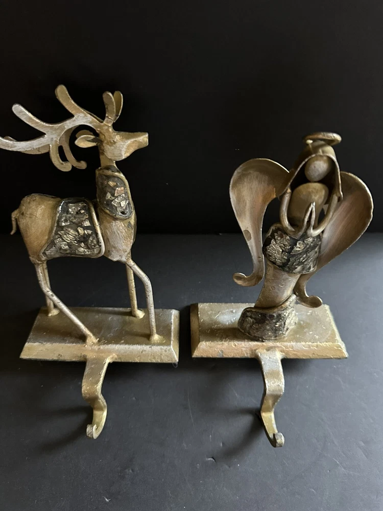 Pair of Pier 1 Imports gold-tone metal Christmas stocking holders. One is an angel. The other is a reindeer. Mixed metal construction painted gold. There is an added design element of imbedded Mica and black grout. 9” lengofrom hook to top. 7” sitting Height. 5” Width. 4” Depth. Very good pre-owned condition. It shows minor wear. See photos.