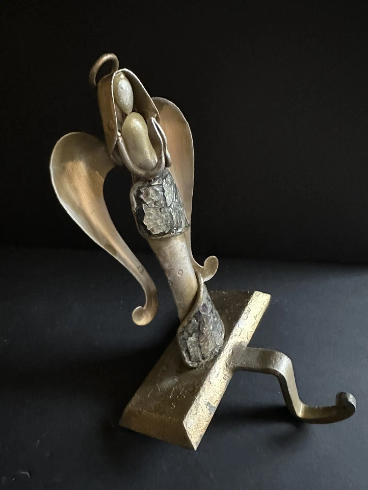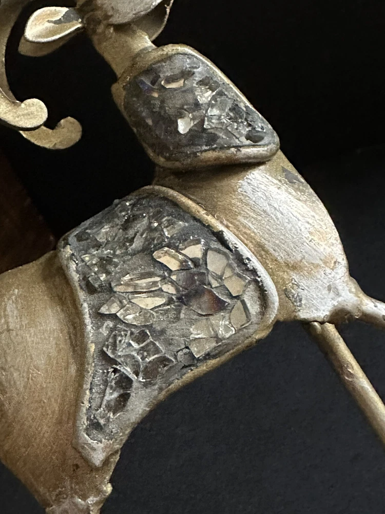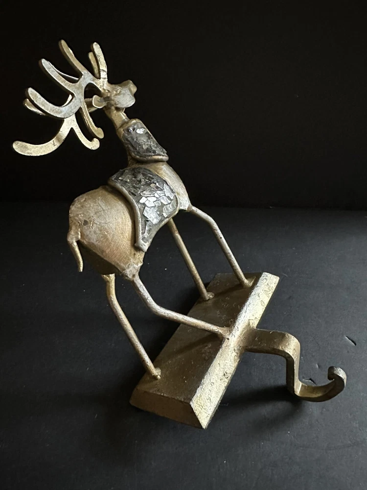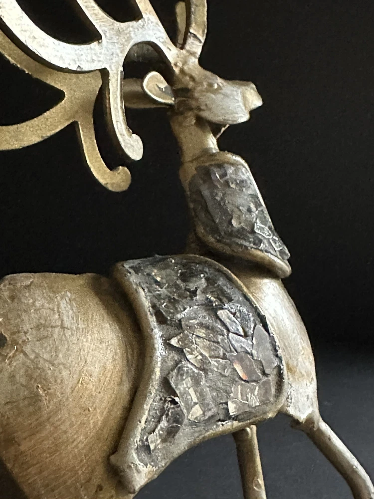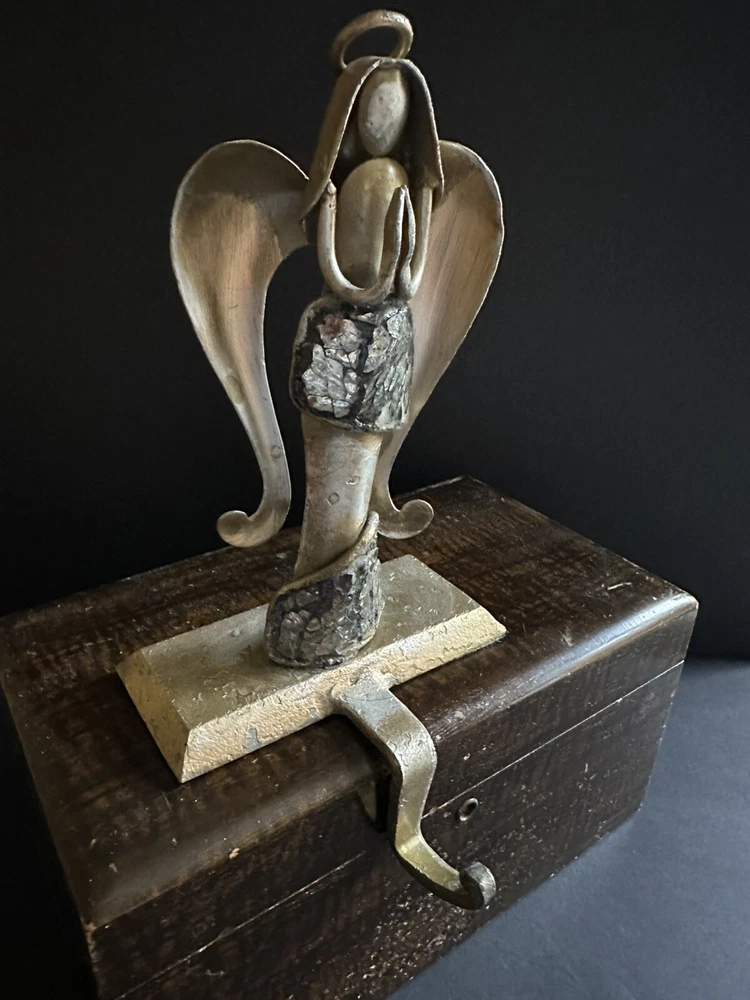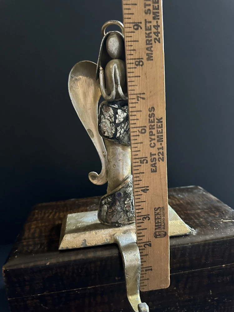 Pair of Pier 1 Imports gold-tone metal Christmas stocking holders. One is an angel. The other is a reindeer. Mixed metal construction painted gold. There is an added design element of imbedded Mica and black grout. 9” lengofrom hook to top. 7” sitting Height. 5” Width. 4” Depth. Very good pre-owned condition. It shows minor wear. See photos.