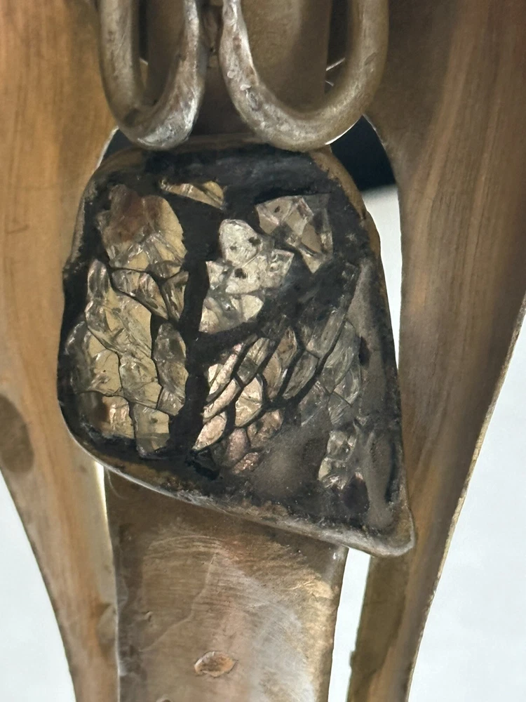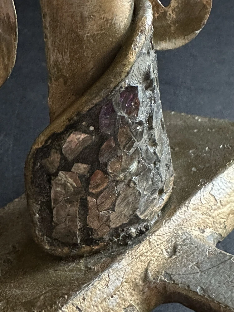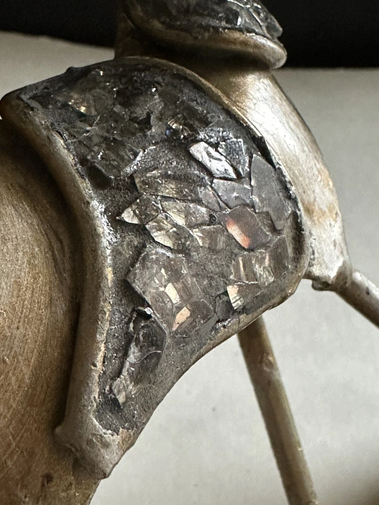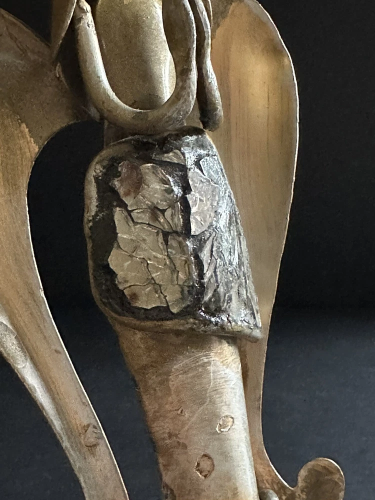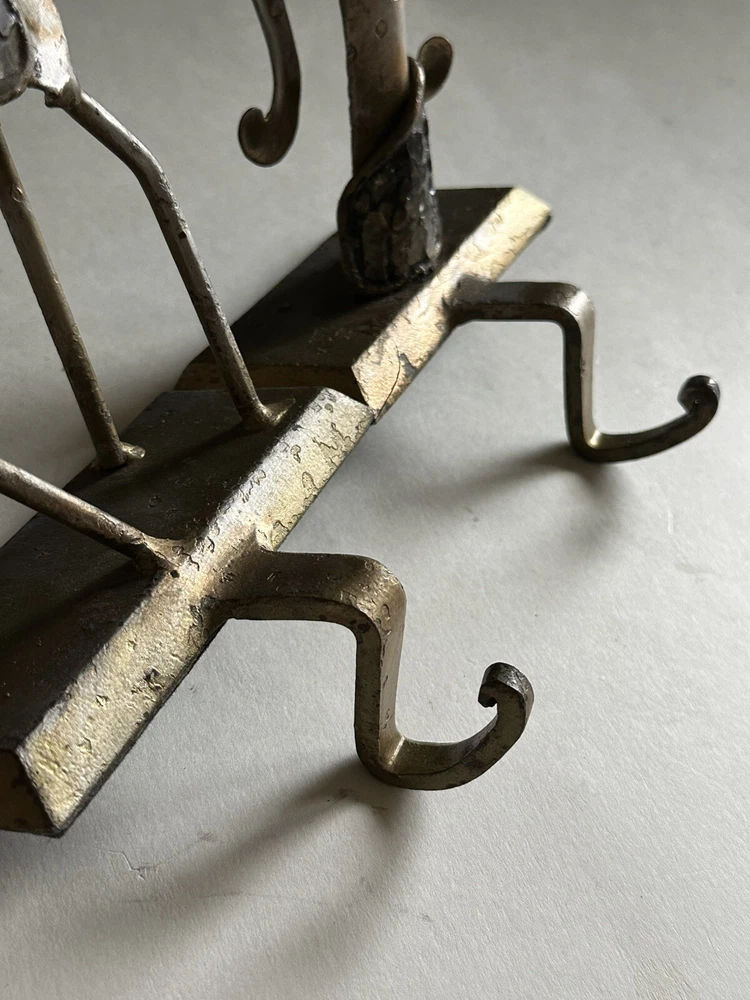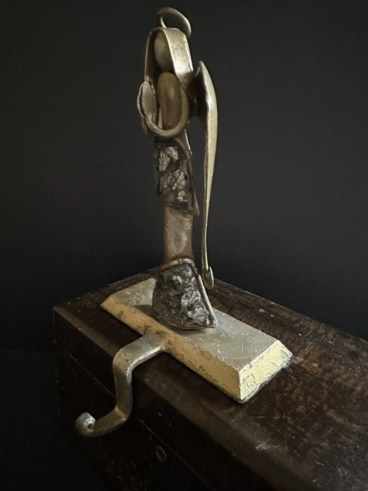 Pair of Pier 1 Imports gold-tone metal Christmas stocking holders. One is an angel. The other is a reindeer. Mixed metal construction painted gold. There is an added design element of imbedded Mica and black grout. 9” lengofrom hook to top. 7” sitting Height. 5” Width. 4” Depth. Very good pre-owned condition. It shows minor wear. See photos.