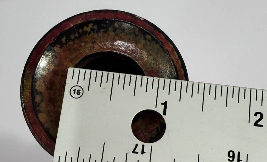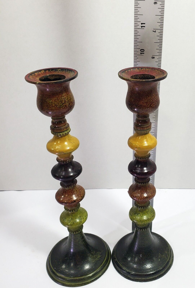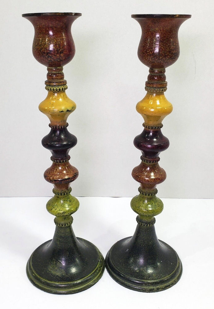 Two vintage round candle holders from Pier 1 Imports in the 1990s. These 9.5'' medium-sized multicolor metal candle holders feature a colorblock pattern. They are suitable for indoor use and can be used for all occasions. The candle holders are painted and can be cleaned with a damp cloth. Perfect for any room in your home, these unique pieces add a decorative touch to your furniture.