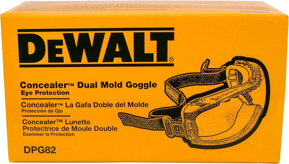 DeWalt DPG82-11 & DPG82-21 Concealer Anti Fog Over Glasses Safety Goggles, Yellow Frame 1- Pair Of Clear And 1- Pair Of Smoke / Gray The DEWALT Concealer safety goggle is a dual mold goggle that provides protection from dust and debris. DEWALT ToughCoat™ hard coated lens provides tough protection against scratches. DEWALT anti-fog lens coating provides tough protection against fogging. Soft, dual injected rubber conforms to the face to provide a high level protection from dust and debris. Adjustable, elastic cloth head strap provides a comfortable fit. Ventilation channels allow breathability and added protection against fogging. Low profile design provides full field of vision. Polycarbonate lens meets ANSI Z87.1+ standards and provides 99.9% UVA/UVB protection.