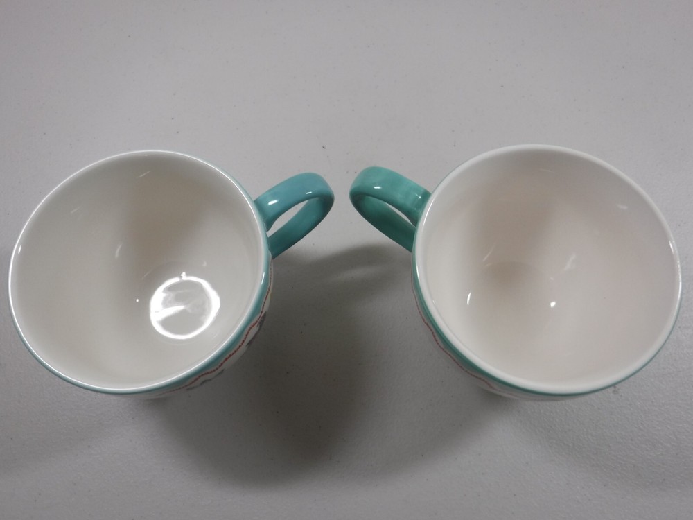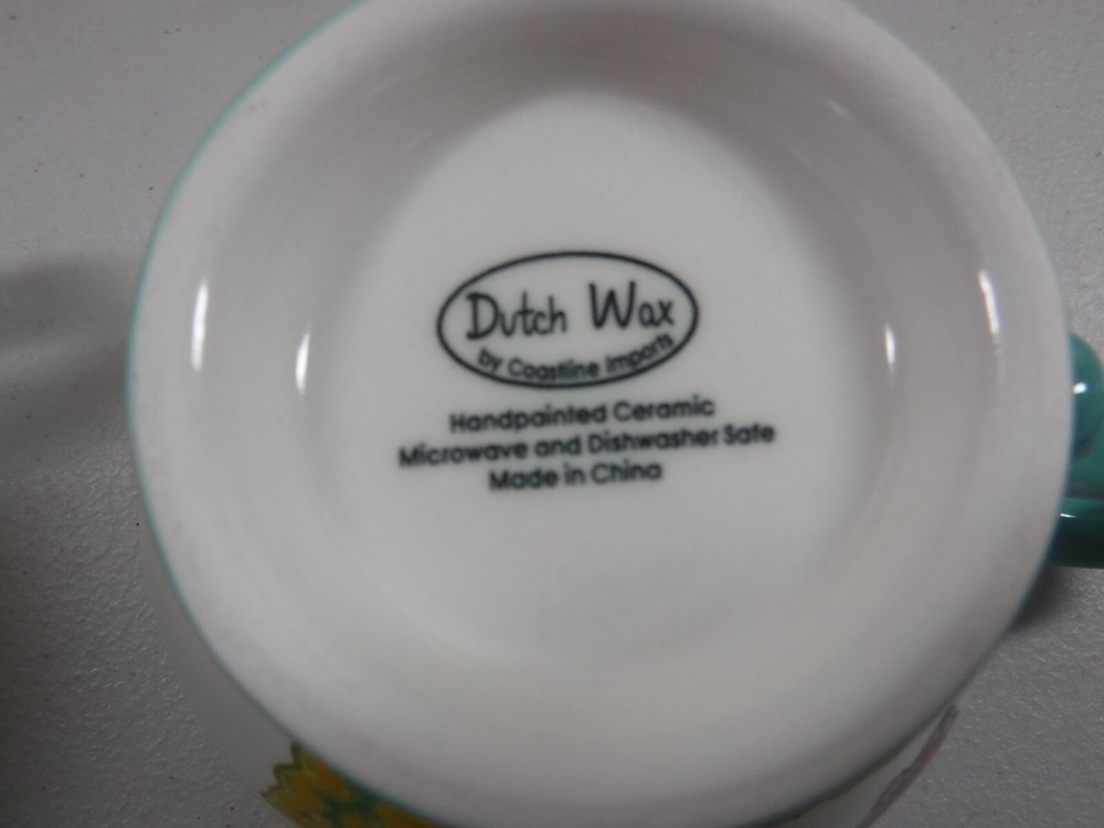 This hand-painted ceramic mug by Dutch Wax is a beautiful addition to your collection. With a capacity of 20 oz, it is perfect for enjoying your favorite beverage. The multicolor floral pattern on a round shape makes it suitable for all occasions. The mug is microwave safe and dishwasher safe, making it convenient to use. The glossy finish and printed backstamp add to its charm. It is an original piece of art pottery produced in China and is not a licensed reproduction. The production technique used is pottery and it was manufactured between 2010-2019. The mug is not signed and is not handmade. Dutch Wax By Coastline Imports Handpainted Ceramic 12 Oz Mug Teal Handle Set Of 2