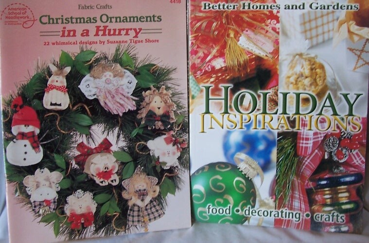 Fabric Crafts Christmas Ornaments in a Hurry. 22 Whimsical Designs by Suzanne Tigue Shore. Includes photos, patterns and instructions for Fritz Frog; Little Miss Christmas; Seymour Snowman; Little Santa; Lulu Lamb; Patience; Regis Lion; Perey Penguin; Starbrite; Dexter Kitty; Angels; Muffin Kitty; Ralph Reindeer; Renie Reindeer; Renie Angel; Bessie Cow; Moo Angel; Baby Moo; Penny Pig; Piggy Angel; Pork Chop; Christmas Ham or Piggy-in-the-Blanket. Better Homes & Gardens Holiday Inspirations - Food; Decorating; Crafts. 320 pages of Festive touches; Details; Candles; Tree Trims; Ornaments; Windows, Tabletops; Garnishes; Treats; Instant Gifts; Custom Gifts; Packages; Gift Wraps; Wreaths; Kids' Stuff and lots more.