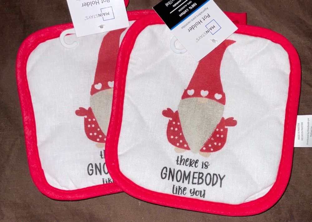 Set of Two Kitchen Tea Towels And Two Gnome Pot Holders There is Gnomebody Like You Red Heart on Black Stripes 15” x 25” each Cotton By Mainstays New with tags .25x2