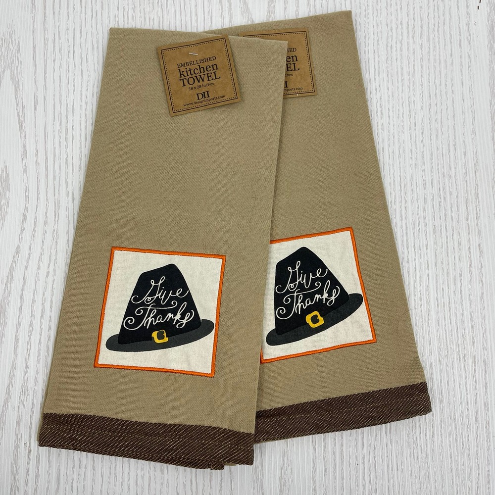 2 Kitchen Towels "Give Thanks" Appliqué w Pilgrim Hat 18x28 Thanksgiving Fall New With Tags Measurements: 18 inches x 28 inches Shipping: USPS First Class Package (3 to 5 business days)...