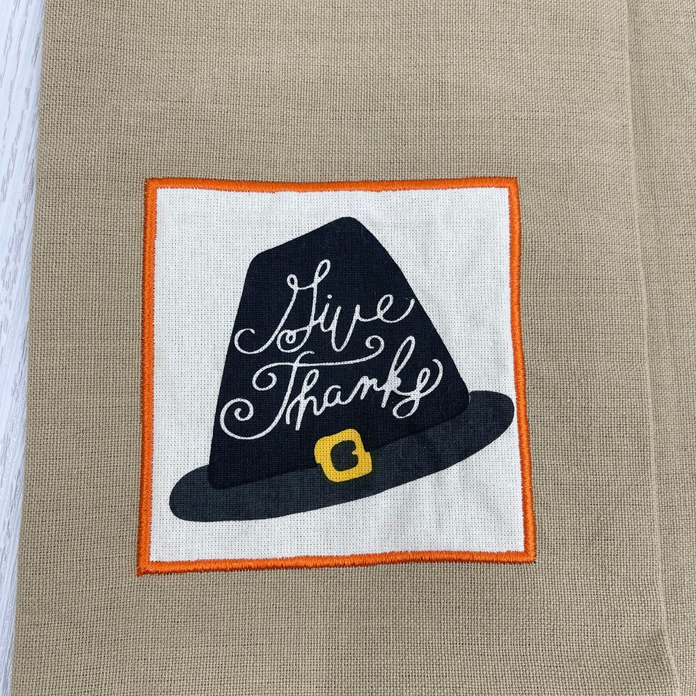 2 Kitchen Towels "Give Thanks" Appliqué w Pilgrim Hat 18x28 Thanksgiving Fall New With Tags Measurements: 18 inches x 28 inches Shipping: USPS First Class Package (3 to 5 business days)