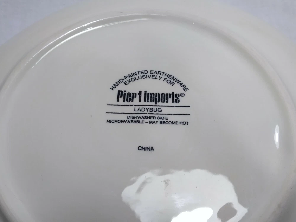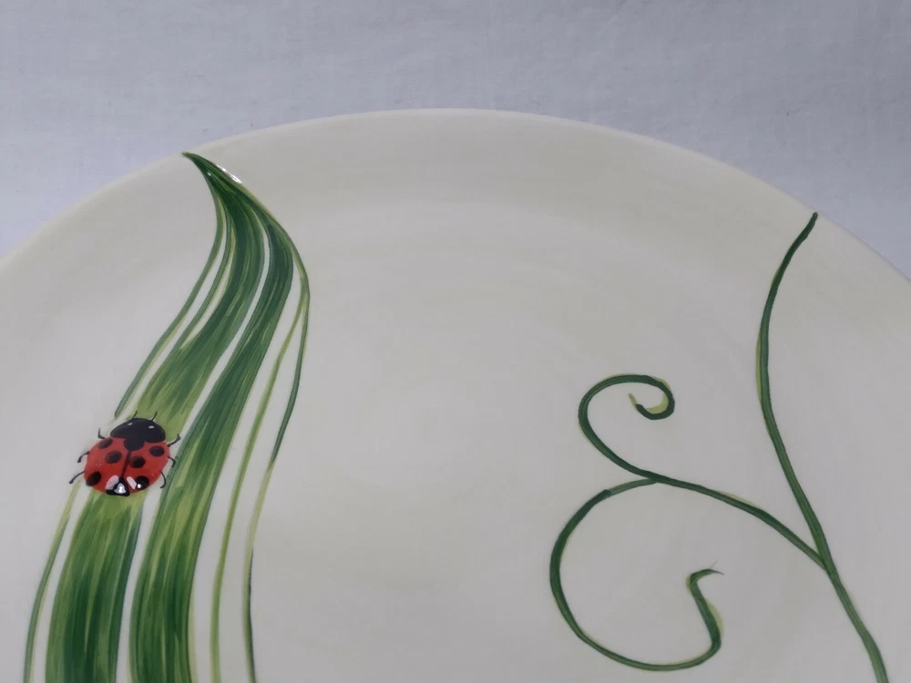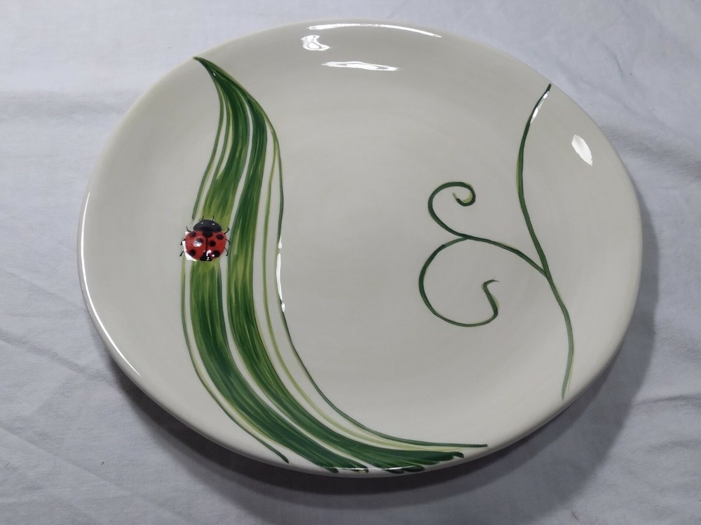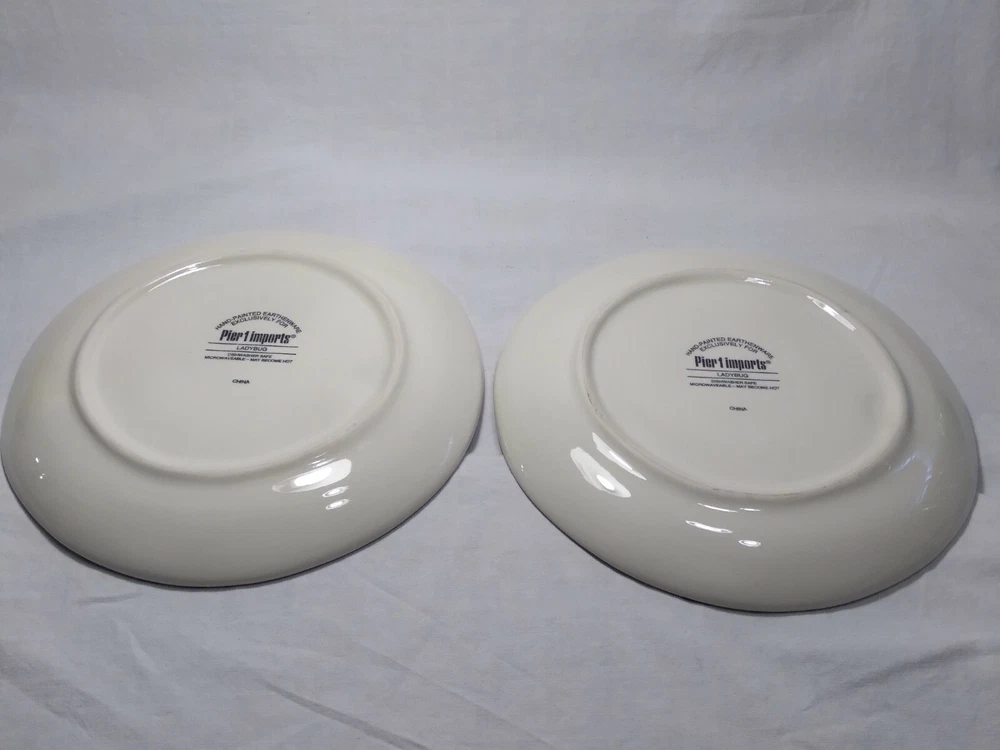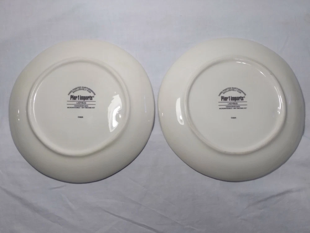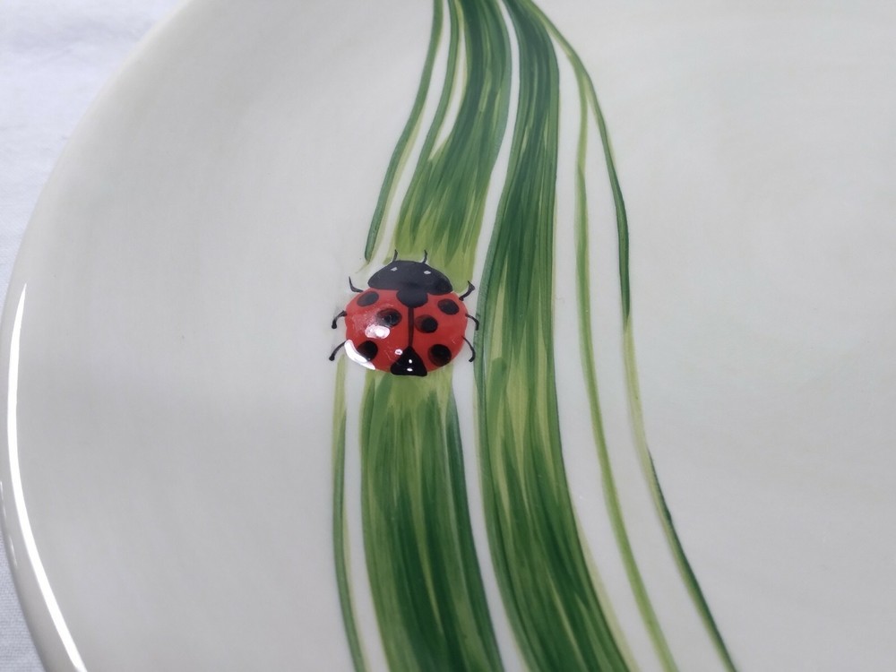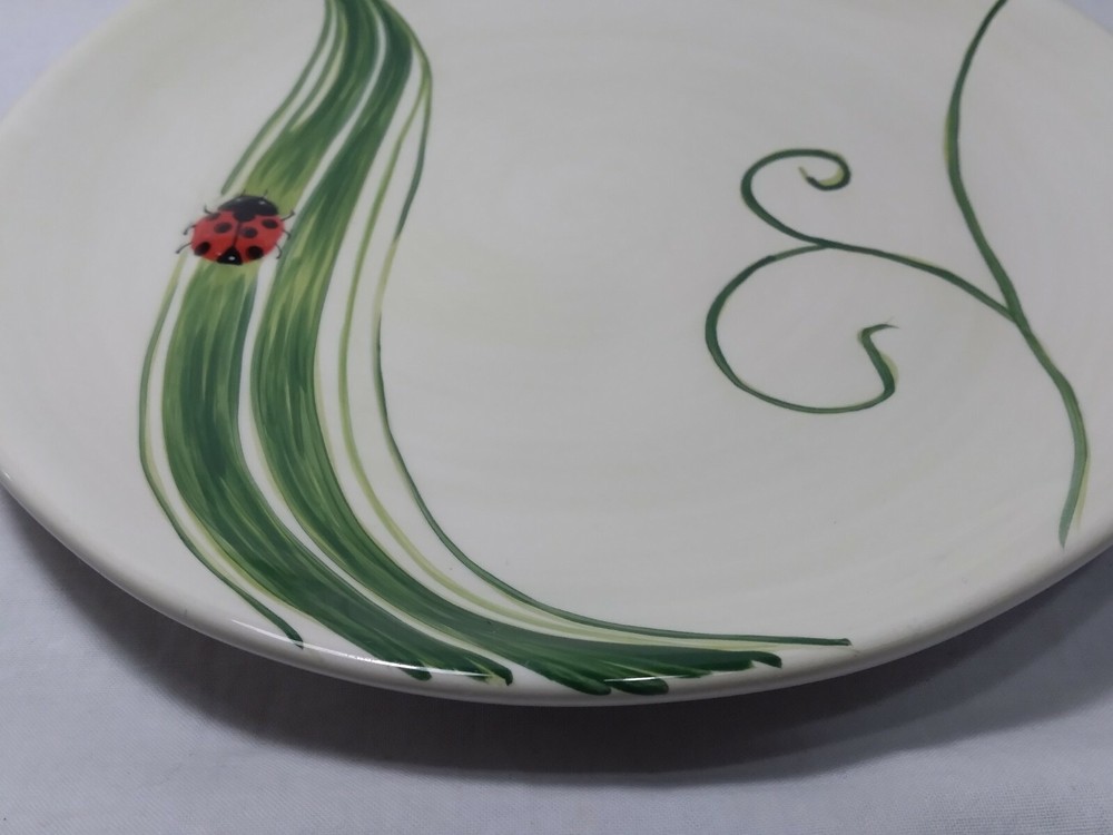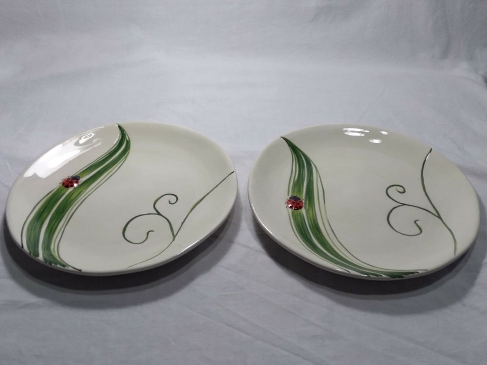 Set 2 Lady Bug Pier One Plates 8.5" Handpainted. The plates are beautifully made with indented textures on some of the leaves while the lady bug is made with a slightly raised surface to make things more lifelike and realistic. The plates are in very good condition, some knifemarks from prior use but nice shiny glaze overall.