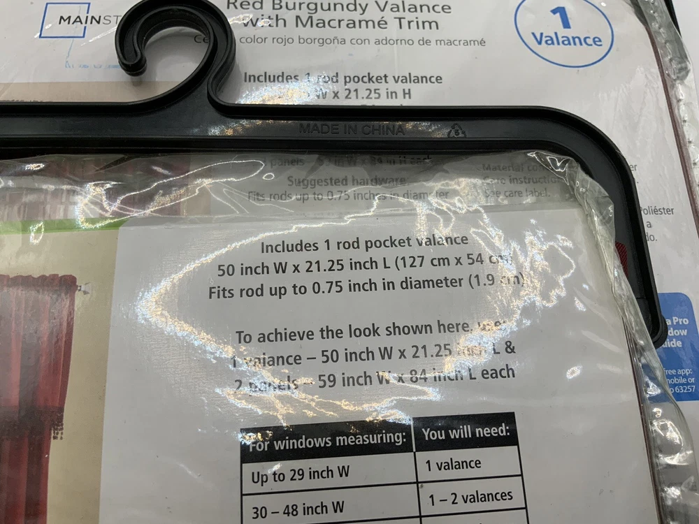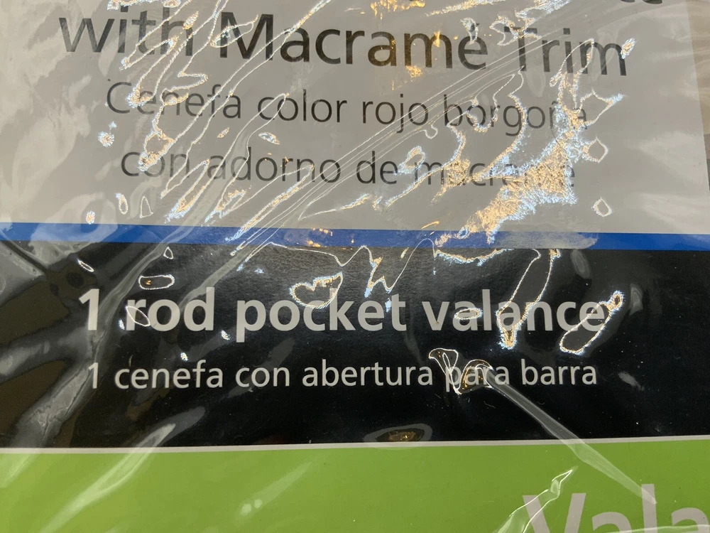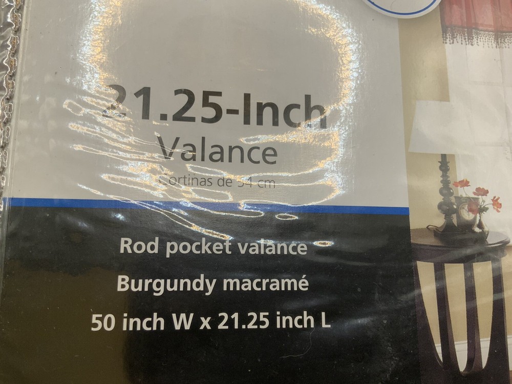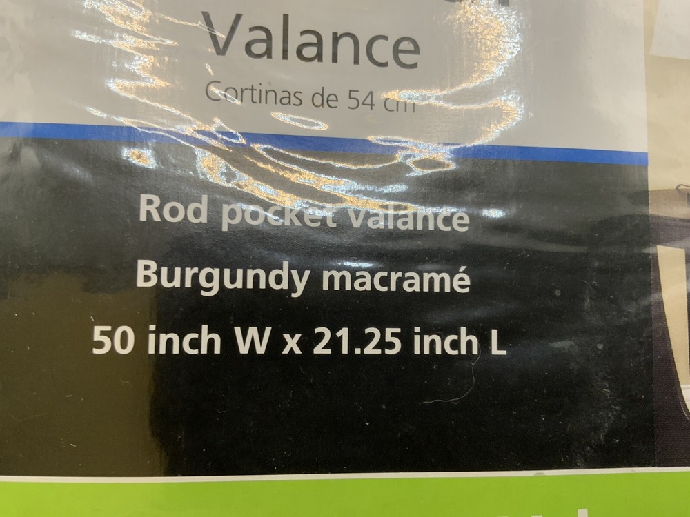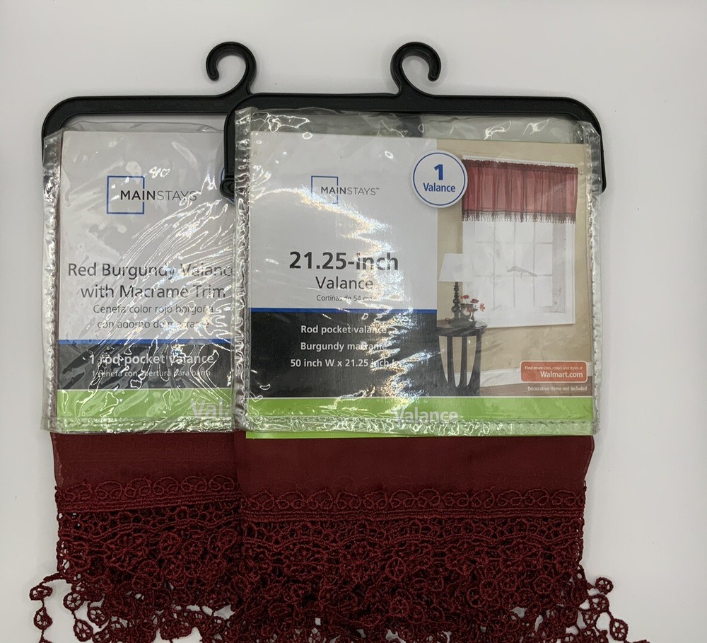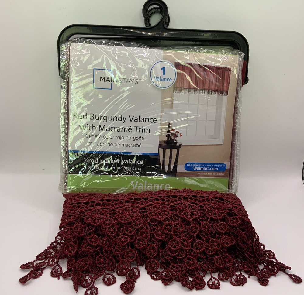 Add a touch of elegance to your windows with this beautiful burgundy red valance from Mainstays. The macrame pattern adds a unique texture and the light filtering material ensures your privacy. This rod pocket valance is perfect for any room in your home and measures 50 inches wide, up to 29 inches long. The polyester material and red/burgundy color make it a stylish addition to any decor. Installation is easy with the included rod and the valance is designed to fit any window style. Enjoy the beautiful macrame features and elevate your home with this stunning valance.