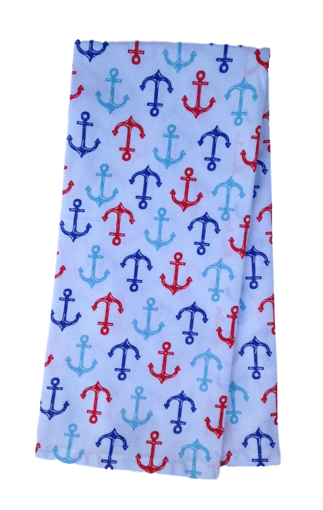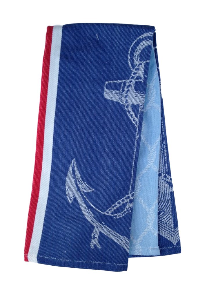 A coordinating set of maritime themed towels, which feature anchors. Often used as dish drying towels, or kitchen hand towels. The pattern is woven into the blue/striped anchor towel. The white tea towel has a blue & red anchor print. Each towel measures 18 x 28 inches, 100 percent cotton, machine washable.