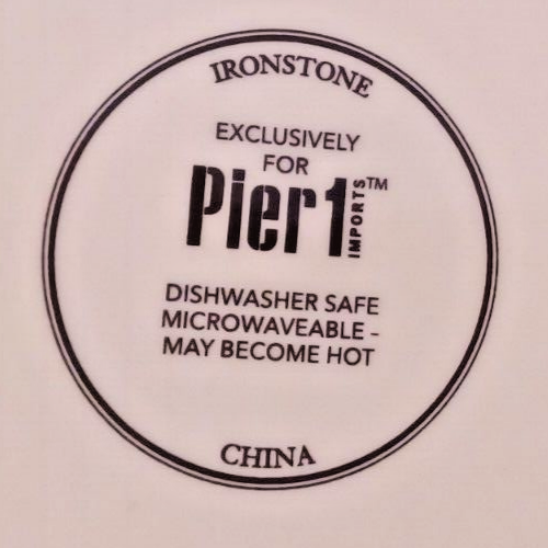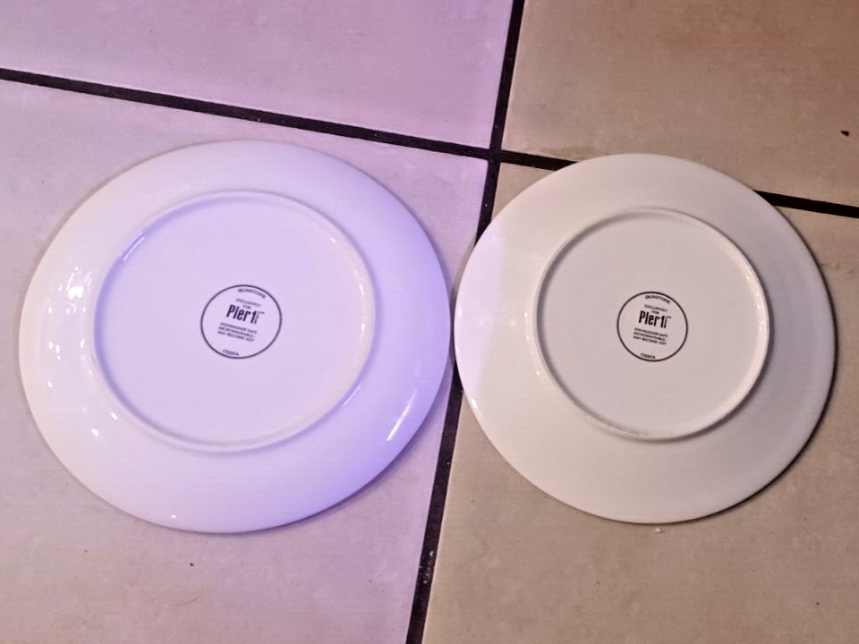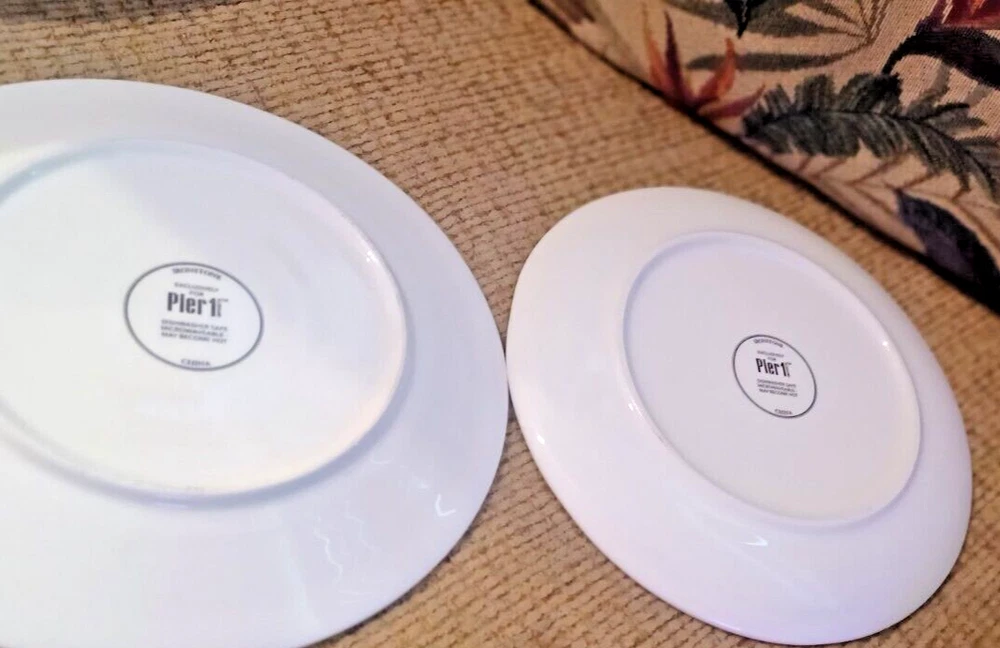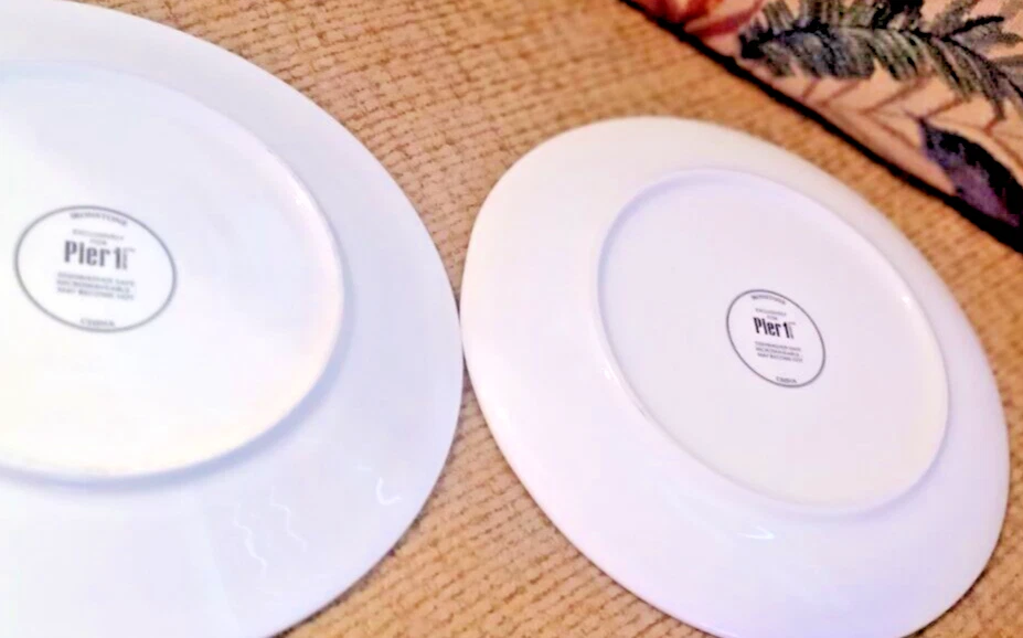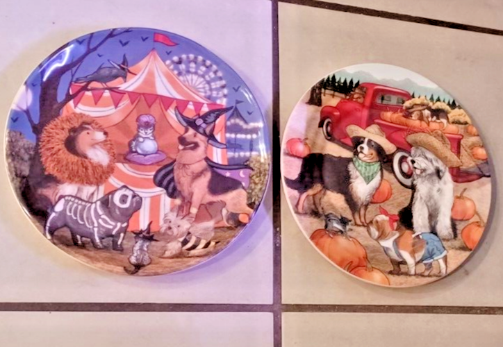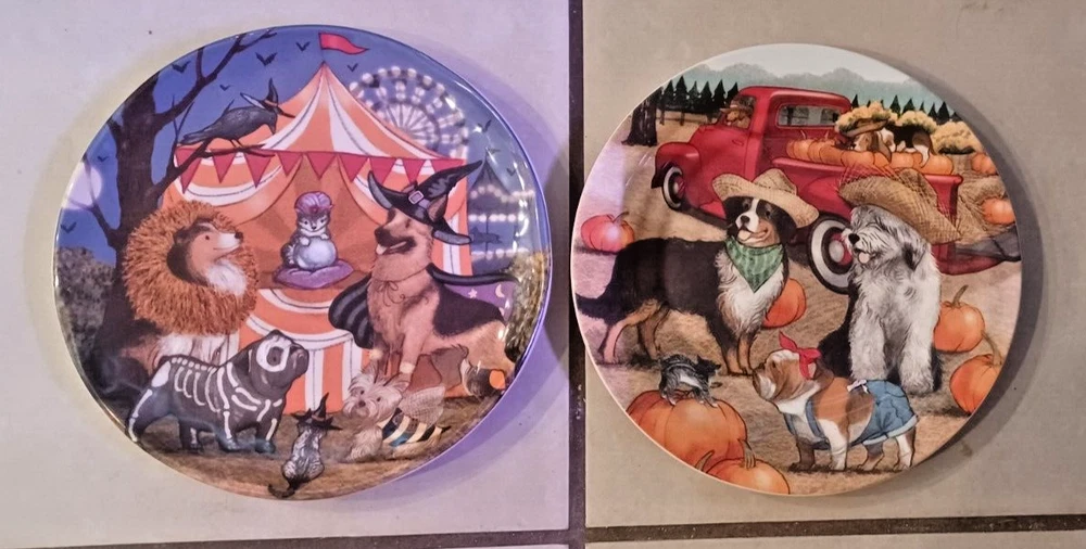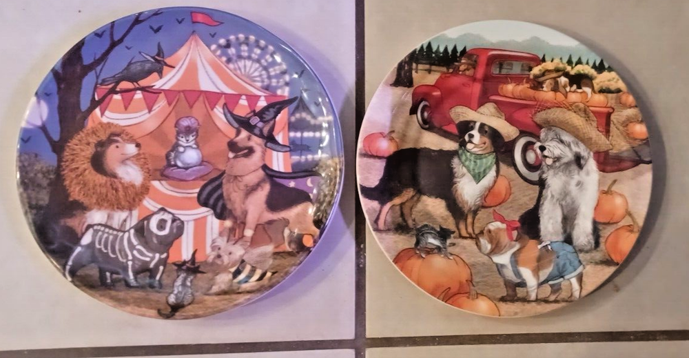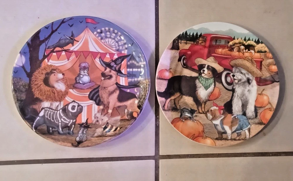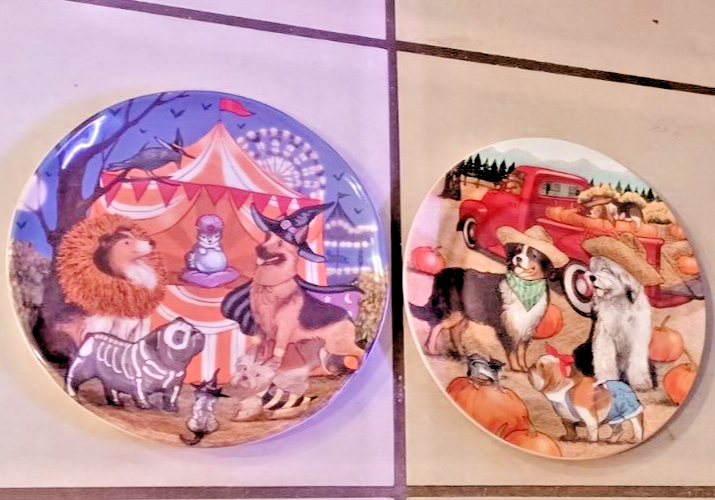 The product is a set of two Pier 1 Imports ironstone salad plates with a Halloween Midnight Carnival Park Avenue dog theme. Each plate has a diameter of approx 8.75 inches and features a multicolor design. The plates are not antique and are an original creation. The backstamp is printed, and they are not handmade. Perfect for Halloween occasions, these plates would make a festive addition to your dinnerware collection.