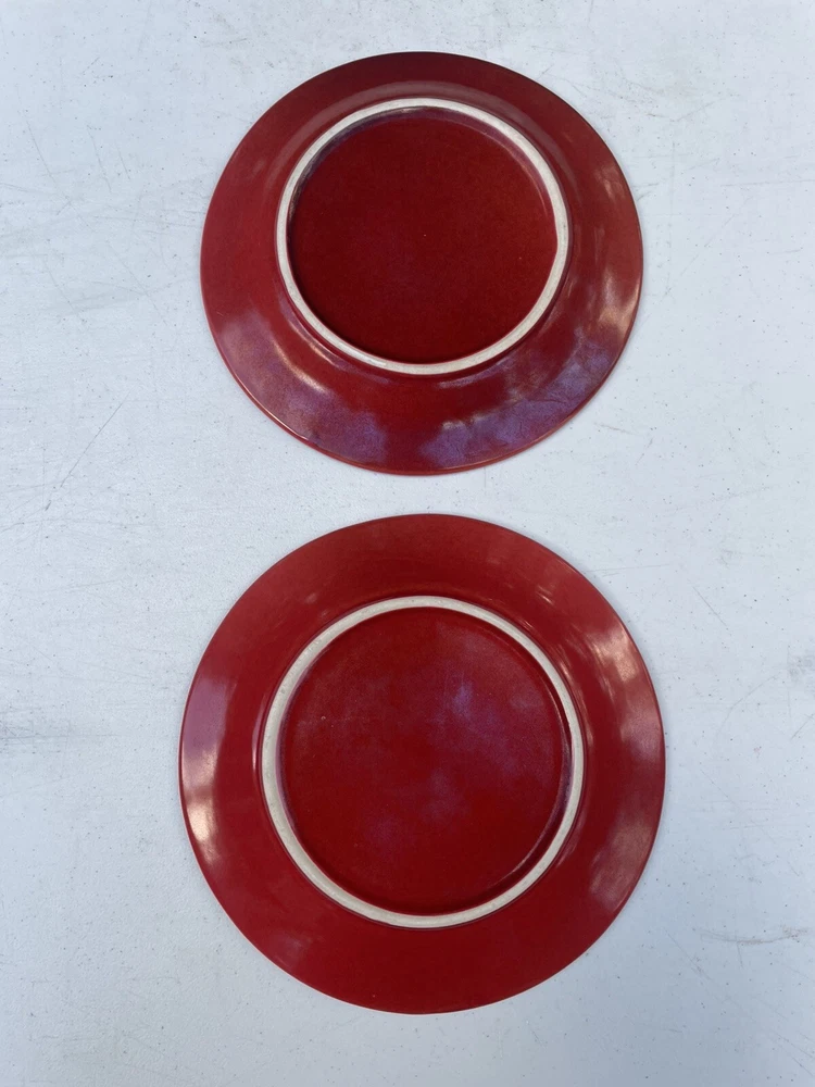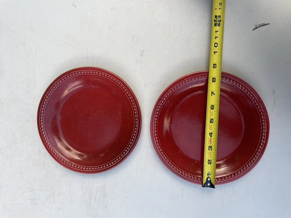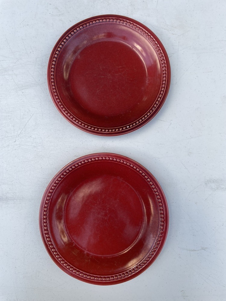 (2) PIER 1 'Spice Route' 8 1/2" DINNER PLATES: Beaded Rim; Paprika Red No chips or cracks some minor scratches from normal use. Good condition. See my other listings for more color and size options. These Spice Route dinner plates help define your table in intriguing ways! A lively mix of pumpkin-color hues mingle in Nutmeg Orange's plate center & sloping sides. Along the round rim, embossed bands enclose an eye-catching raised-relief beading. A sleek glaze covers all, & brings out individual dappled color accents. As with all Pier One "Spice Route" pieces, such complementary & contrasting orange w/ brown flecks allow for many mix-and-match options. Spice Route excels in organic-looking table settings, or wood-hued rooms. Please see photos- (3) Pier 1 'Spice Route' Nutmeg Orange Dinner Plates measure 10 ¾ " wide in diameter & stand 1 ⅜ " tall. Very solid, durable feel. Sides angled to hold food & sauces w/o spills. Microwave-safe & Dishwasher-safe. No chips, cracks or crazing. Minimal surface marks. Produced exclusively for Pier One in China FAST SHIPPING!