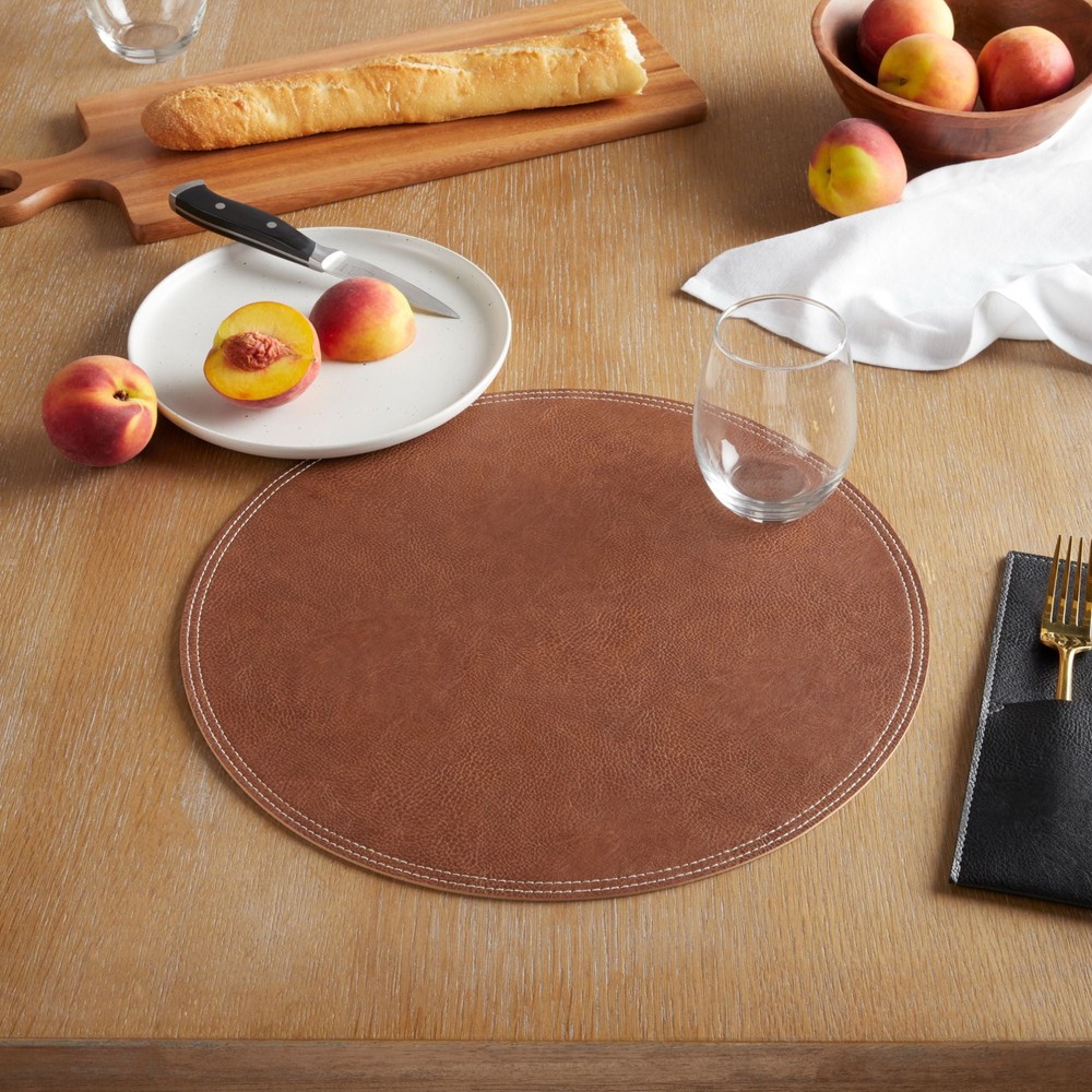 (2 pack) Better Homes & Gardens Persia Faux Leather Placemat, Brown, 15" Round, 1 Piece Product details No one denies that the kitchen is the heart of the home, and the dining table is the ultimate gathering spot to share a conversation and satisfying meal. Better Homes & Gardens table and kitchen and dining textiles will create a warm, inviting living space with colors and prints that you and your family will love. Create a custom and coordinated tablescape and kitchen decor with Better Homes & Gardens tablecloths, all while incorporating decorative accents with table runners, placemats, and chair cushions. Serve up a warm welcome to family and guests with the Better Homes & Gardens Placemats gracing your dining table. This placemat features a beautiful design that will create a casual, welcoming space for your guests. The Better Homes & Gardens Placemats will add style and function to your table decor. Create your own custom look that reflects your style by mixing and matching with coordinating pieces. These placemats will create a welcoming look for your dinner party yet are practical for everyday use. This placemat is easy to clean and is sure to stand the test of time. Measures 15” in diameter. Imported. Includes 1 placemat Easy care, wipe clean