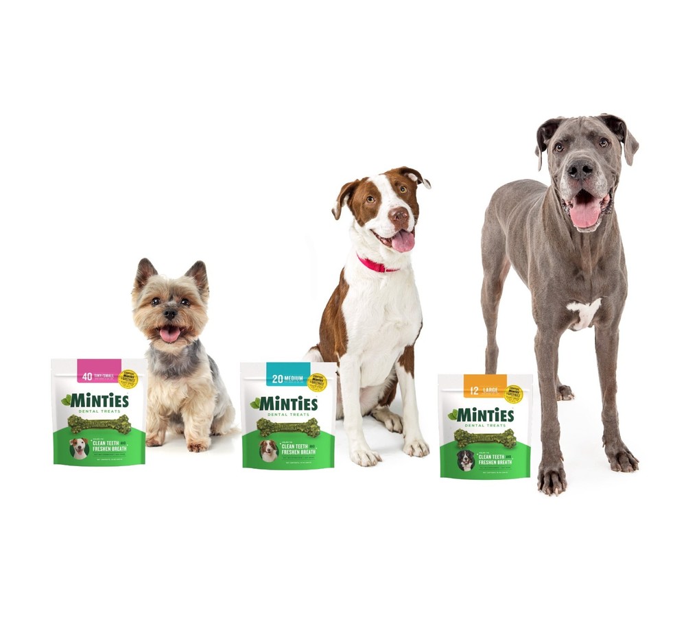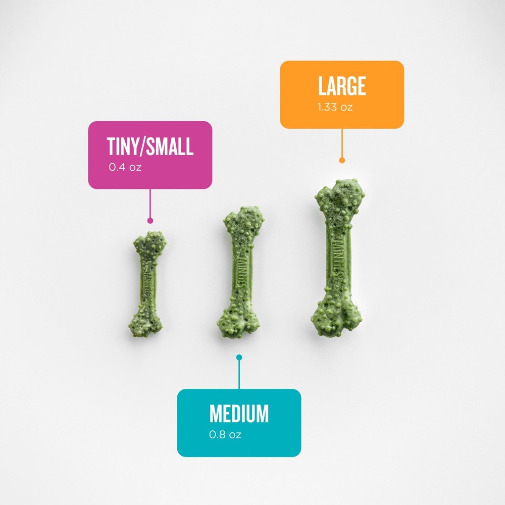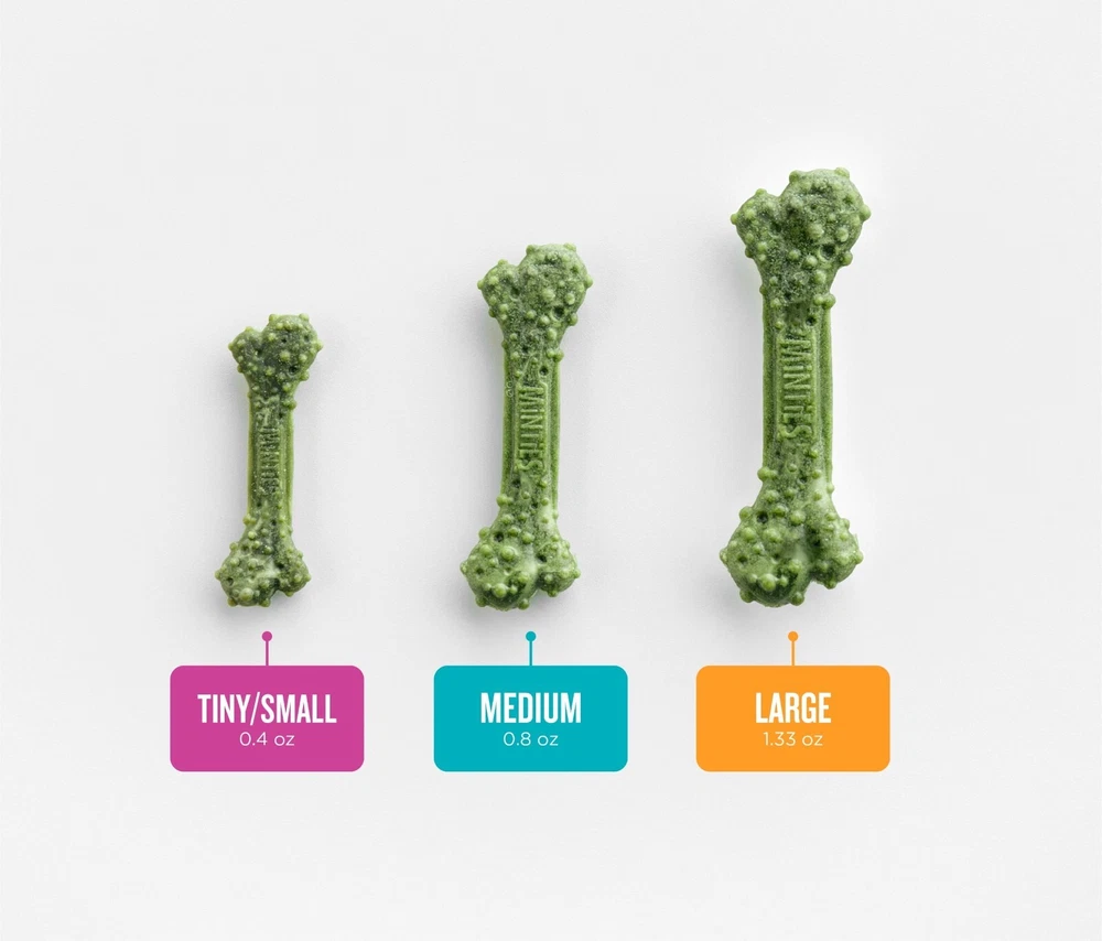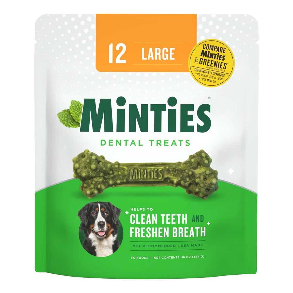 Minties Dental Bone Treats, Chews for Large Dogs over 50 lbs, 24 Count, 32 oz, Shelf-Stable MINTIES is the affordable dog dental chew made from ingredients your dog will love. Contains no wheat, soy, corn, artificial flavor, or animal by-products. The unique design encourages dogs to chew, helping to remove plaque, tartar, and bad breath at its source. With a delicious blend of real peppermint, Minties Teeth Cleaner Dental Dog Treats are flavorful treats designed to give your dog fresh breath and a sparkling smile. Vet-recommended: One Minties dog dental treat is all it takes to start dog teeth cleaning and freshening and to help remove plaque and tartar. Gluten-free ingredients: Minties dental treats for dogs contain no wheat, corn or soy. No added sugars or salt. Freshens your dog's breath: Minties dog dental treats contain five breath fresheners, alfalfa, peppermint, parsley, fennel and dill. Plaque removal: Keep your dog's teeth and gums healthy and clean with Minties dog dental chews. Helps remove plaque buildup and controls tartar as they chew. Brand Minties Pet Size Large, Extra Large Meat Type Chicken Pet Food Flavor Minties Pet Food Condition Shelf-Stable Pet Treat Variety Dental Treats Assembled Product Weight 2 lb Animal Type Dog Manufacturer Tru Rx LLC Assembled Product Dimensions (L x W x H) 3.50 x 9.00 x 10.50 Inches Animal Health Concern Dental Care Feeding Instructions Feed a Minties Dental bone once a day to fight bad breath, plaque, and tartar Ingredients Rice Flour, Vegetable Glycerin, Water, Natural Chicken Flavor, Calcium Carbonate, Tricalcium Phosphate, Dried Alfalfa (Source of Chlorophyll), Peppermint Oil, Brewers Dried Yeast, Lecithin, Parsley, Fennel, Dill, Mixed Tocopherols (Preservative), Cholecalciferol (Source of Vitamin D3), Yellow #5, Blue #1