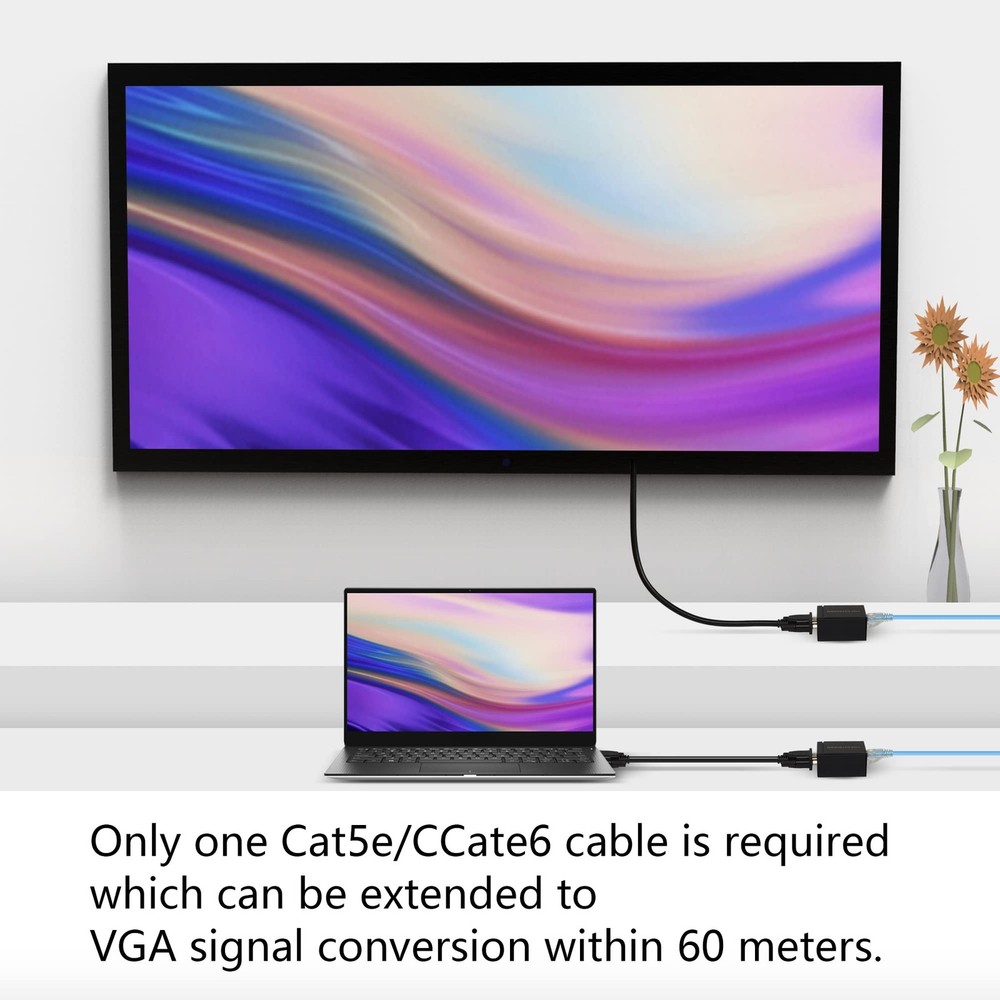 VGA extender adapte, over you only need a cat5e/cat6 pure copper cable,you only need to pay a lower cost, you can enjoy VGA signal reception within a range of 60m,compatible VGA interface, can be widely used in office, conference room, media video, stage Demonstrations, outdoor displays, etc. Feature: 1.Cost saving, only need a Cat5e/Cat6 network cable to complete VGA signal conversion. 2.Expandable 60M, VGA signal. 3.High intelligent conversion chip. 4.No delay, stable transmission, high-definition picture quality. 5.Alloy shell, strong and durable. 6.Lightning protection, static electricity. 7.Plug and play, convenient and fast. Specification: Connector: VGA to RJ45 Color: black Quantity: 2pcs Package Included: 2PCS X VGA extender convert adapte 【50% Cost Reduction】VGA extender adapte, over you only need a cat5e/cat6 pure copper cable,you only need to pay a lower cost, you can enjoy VGA signal reception within a range of 60m, through the VGA extender adapter convert, no delay, stable transmission, high-definition picture quality. 【Smart Conversion】Built in high quality smart chip,support cat5e/cat6 to VGA signal conversion, to ensure the same input and output.more importantly, it ensures stable signal transmission and high definition picture quality, bringing you a better experience. 【High Quality Material】VGA extender, with galvanized alloy shell, strong and durable, anti-lightning, dustproof, anti-static, and ensure fast cooling,better use effect. 【Plug and Play】 VGA extender adapter,you only need a cat5e/cat6 pure copper cable to complete the rj45 convert VGA signal cable,no need to drive, just plug it in and use it, and enjoy high-definition and stable signal transmission. 【Wide Use】This vga extender adapter is compatible with VGA computer, VGA monitor, projector or TV, monitor host and other devices with VGA interface, can be widely used in office, conference room, media video, stage Demonstrations, outdoor displays, etc.