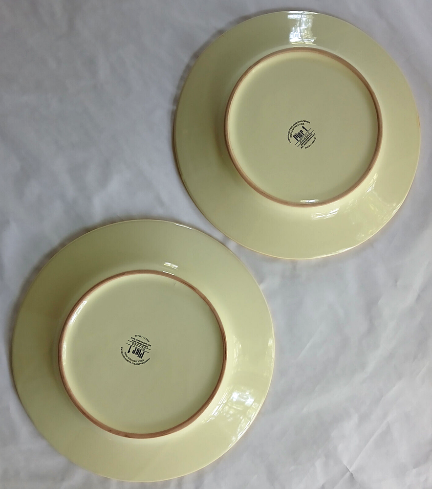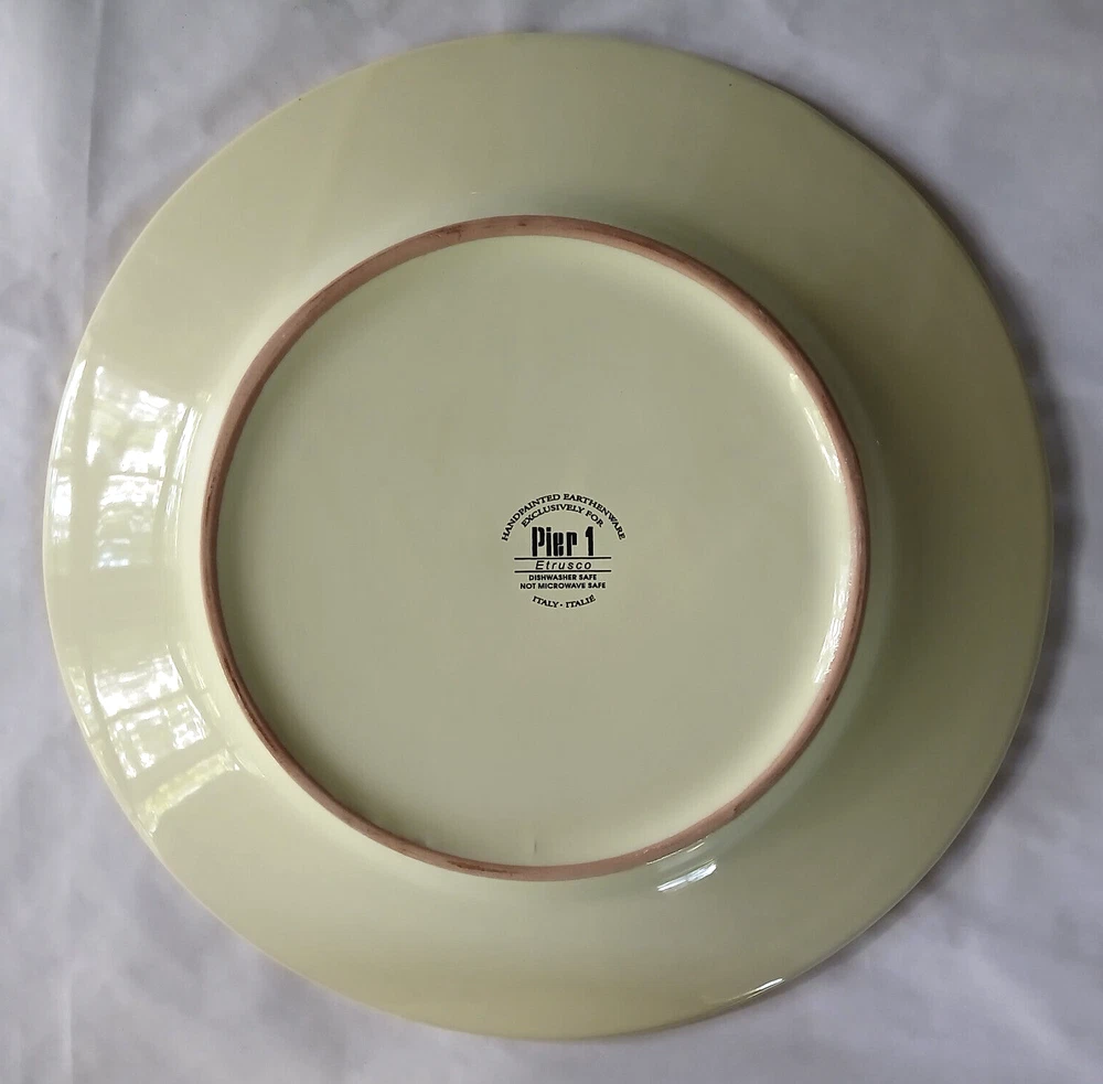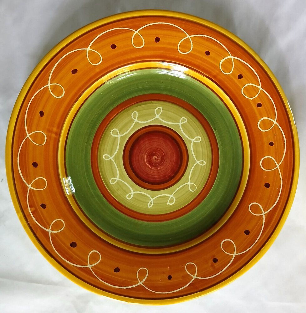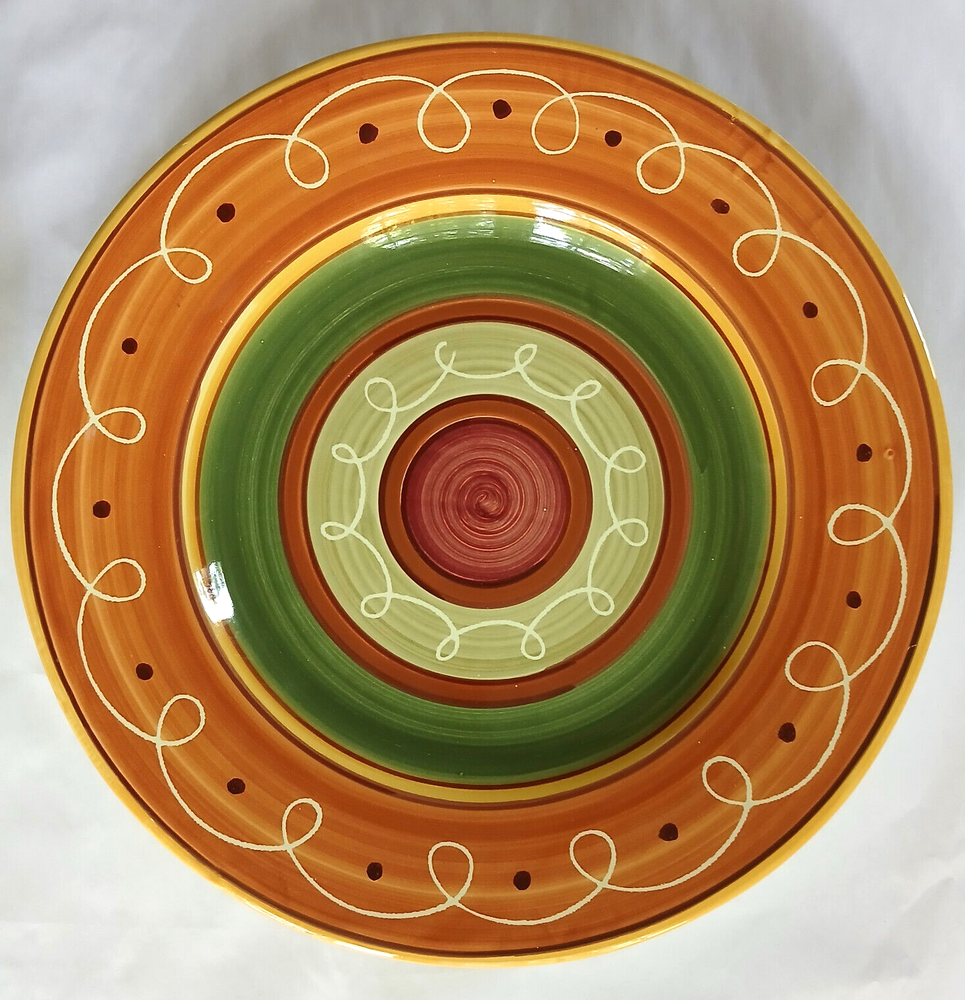 In very good condition, two Pier 1 red, orange, green bands, swirls and dots, 11.5 inch diameter Etrusco dinner plates. Hand painted and made in Italy. The pattern is discontinued and was active around 2005. If you have any questions or would like additional pictures please ask. Please note that shipping is based on the weight & size of the package and the destination and will require extra packaging materials to keep it safe during transit which also adds to the weight. Each plate weighs around 2 pounds. If ever you receive anything from me with which you have a legitimate issue, please contact me ASAP and I will work with you to resolve it. All items come from a smoke free and odor free environment. Thanks for looking!