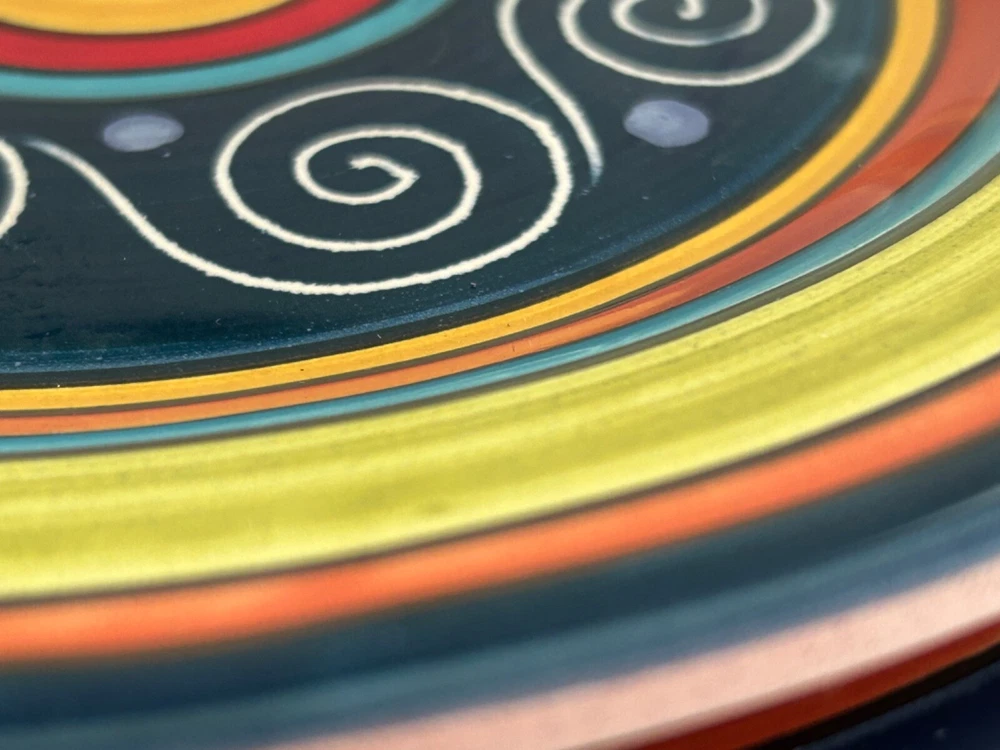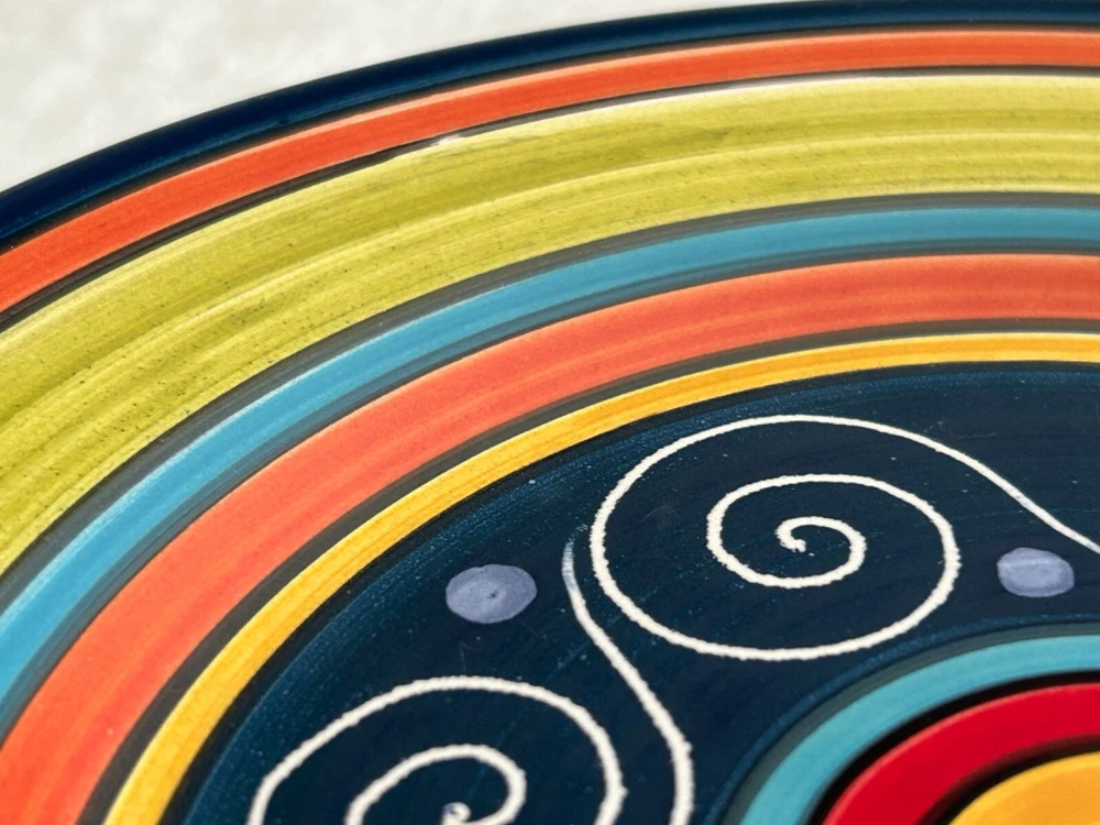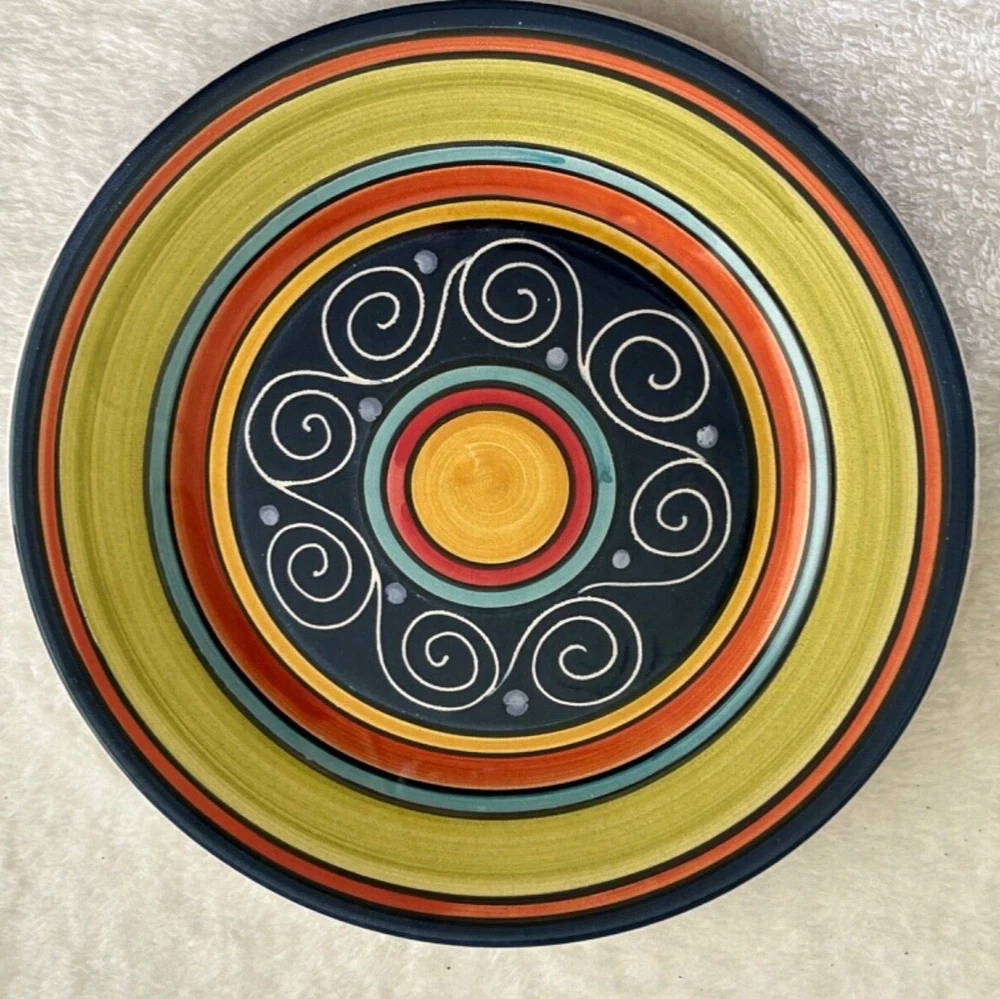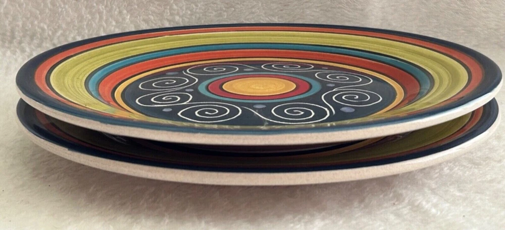2 colorful gorgeous 9" salad or luncheon plates in excellent condition without chips, cracks, crazing, or fading of the gorgeous and vibrant colors of green, red, blue, orange, and yellow. I love the festive pattern! Thank you for viewing.