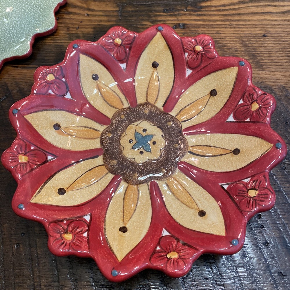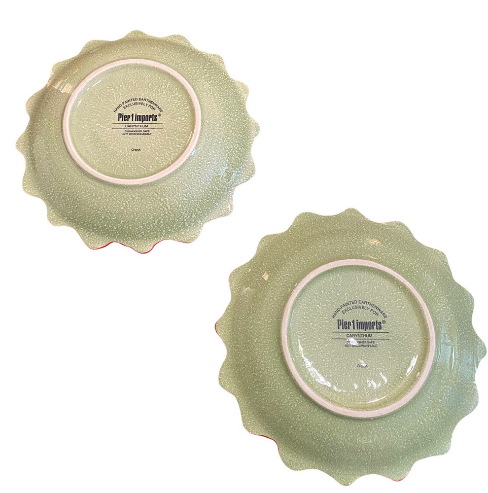 Add a touch of elegance to your table setting with these stunning floral salad/dessert plates from Pier 1 Imports. The round earthenware plates feature a vibrant red floral pattern with scalloped edges. The hand-painted design is perfect for a flower-themed table setting. The 8" plates come in a set of two and are dishwasher safe. Made in China, these plates are perfect for any occasion, whether it's a formal dinner party or a casual family meal. In beautiful condition. No chips or cracks. -220352