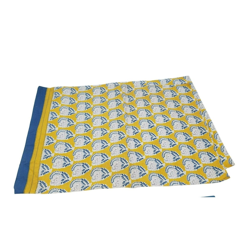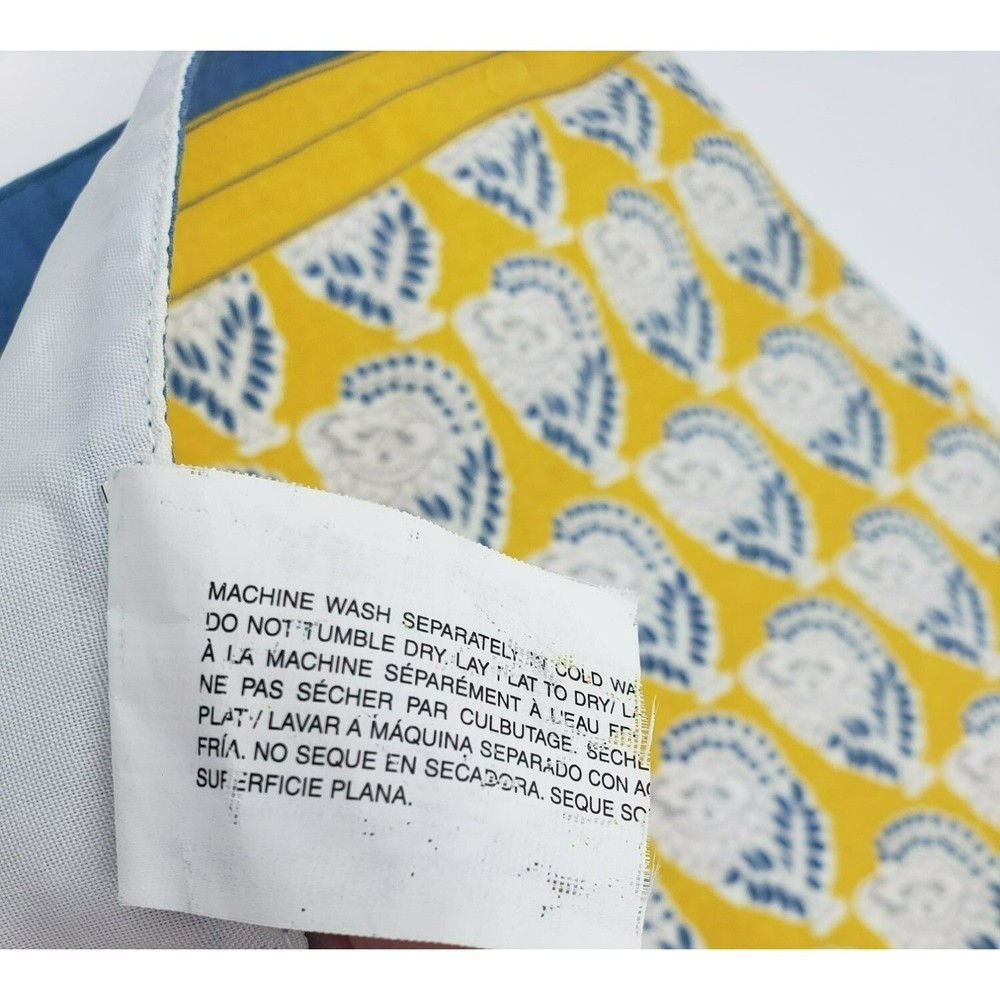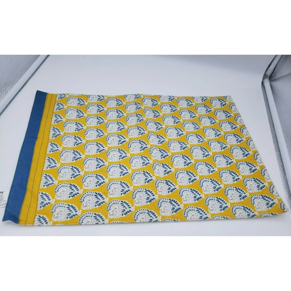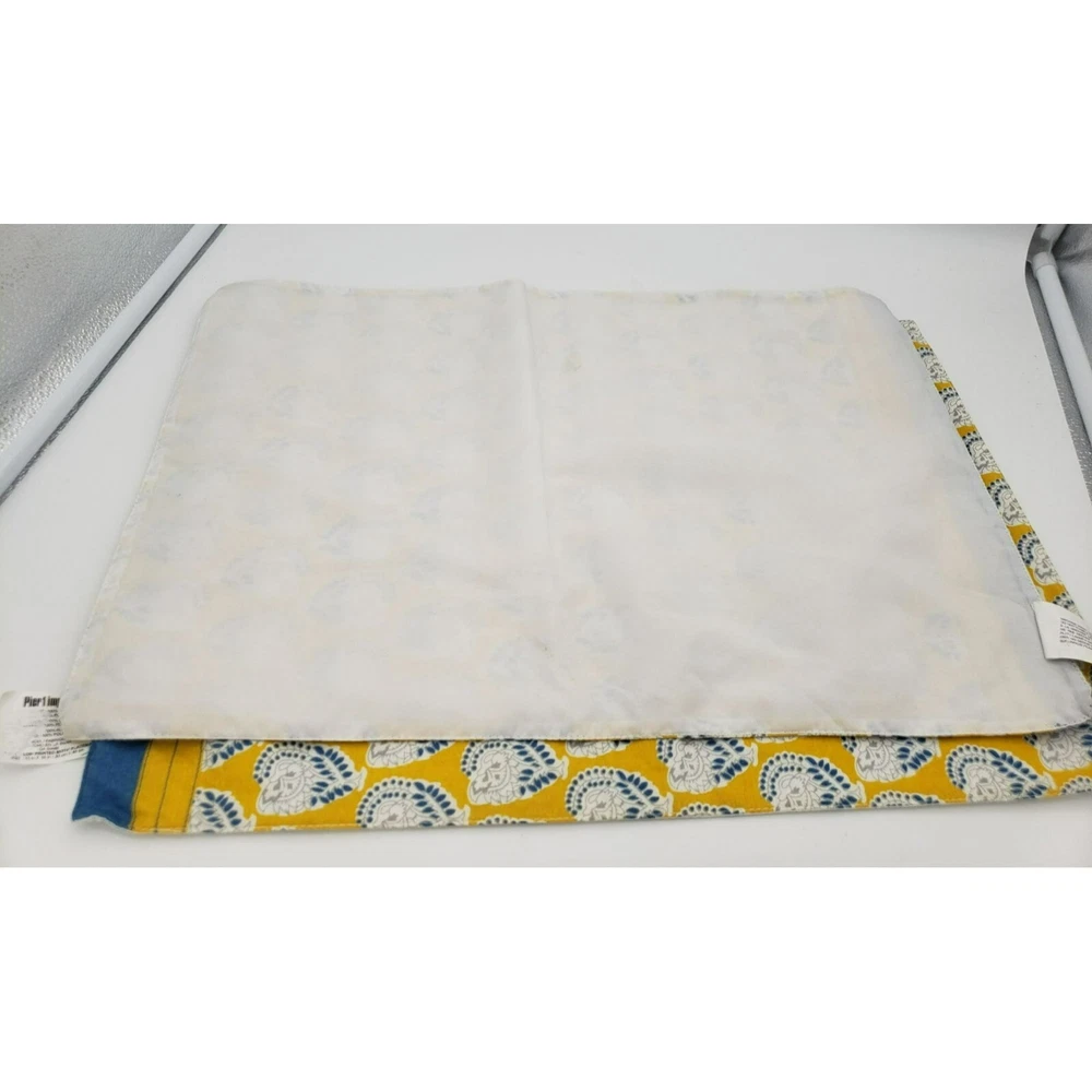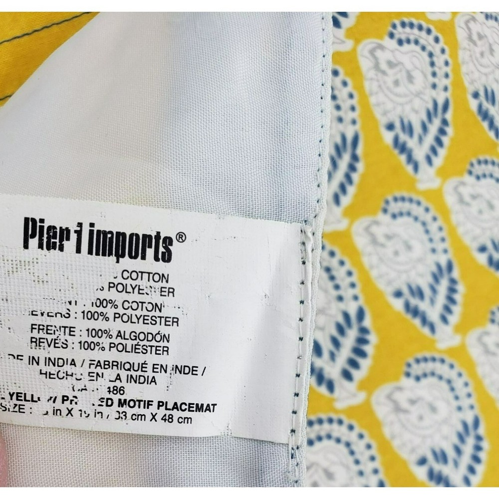 Enhance your home decor with this set of elegant Pier 1 Imports cotton blend place mats. Featuring a vibrant yellow and blue floral print, it adds a touch of sophistication to any space. • 100% Cotton • Floral Print • Yellow and Blue Design • 18.75"x13" • Machine Washable • Small stain on the white side. Condition: Pre-Owned