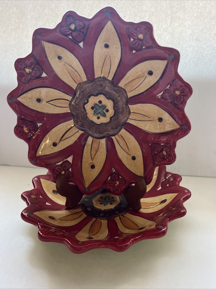 Add a touch of elegance to your dining table with this beautiful set of two round dessert plates from Pier 1 Imports. The plates feature a stunning floral pattern in multi-color, perfect for all occasions. Crafted from high-quality stoneware, these plates are durable and long-lasting. This two-piece set includes dessert plates, each measuring approximately 8 inches in diameter. They are perfect for serving your favorite desserts or salads. These plates are handmade and feature an art pottery production style, making them unique and one-of-a-kind. Bring a contemporary style to your table with these stunning Pier 1 dessert plates.