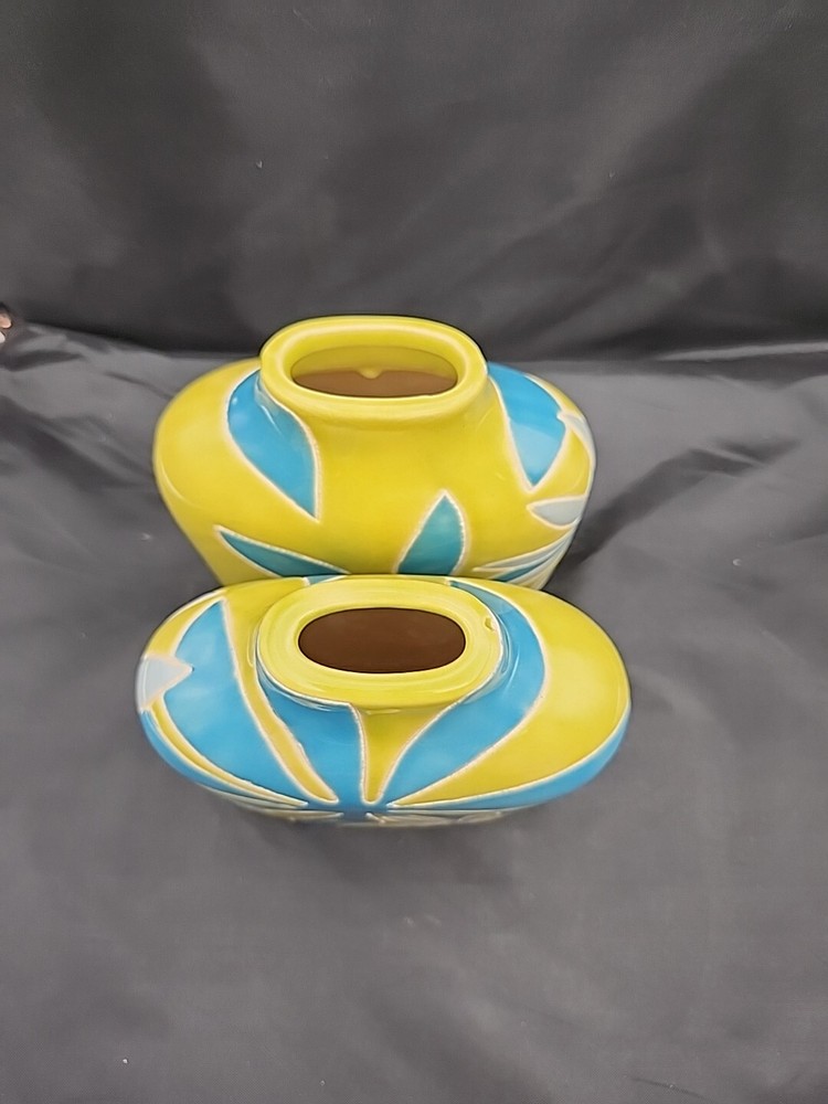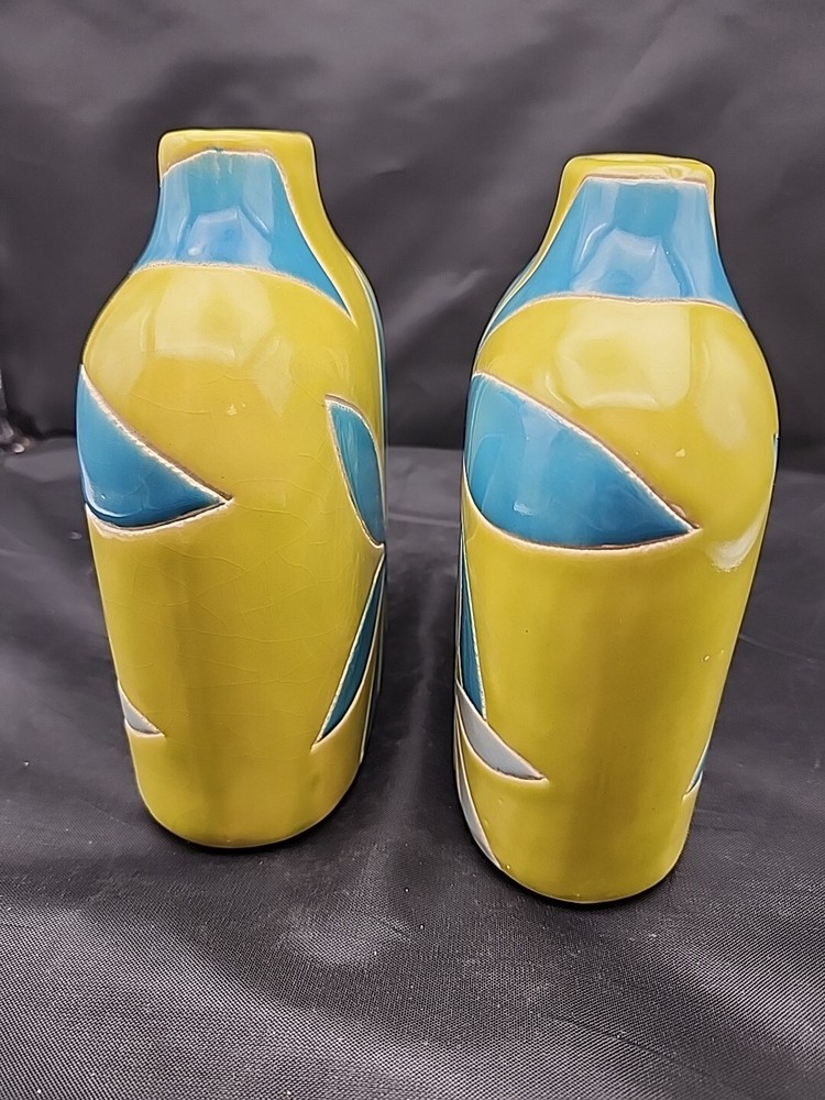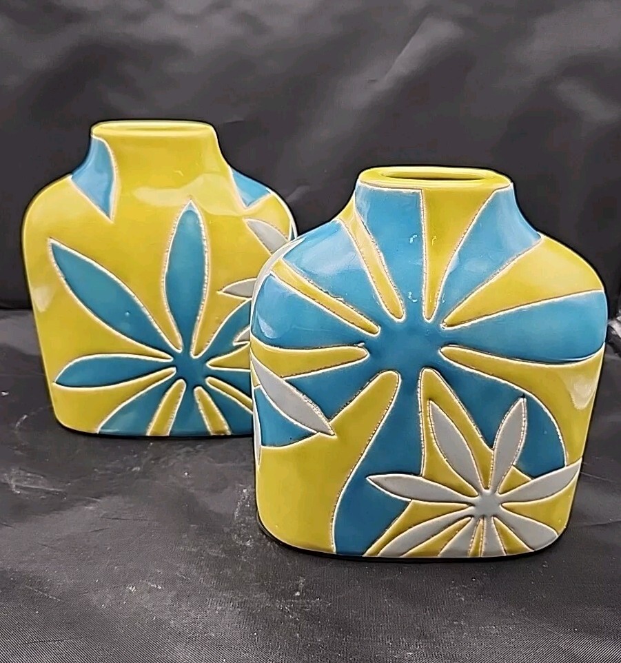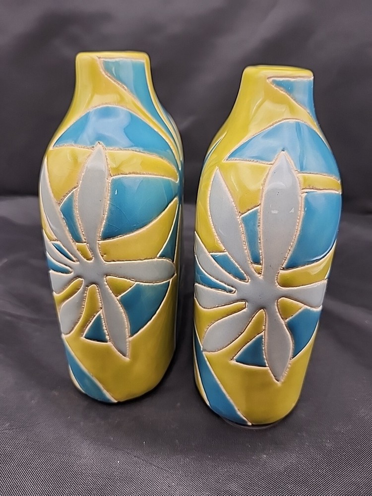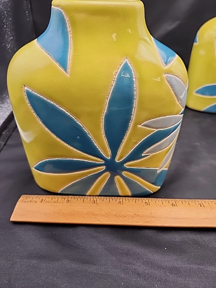 Fun happy vases. The originally came from Pier 1. Please see all photos for details, conditions, and sizing. After sizing photos comes things I want to point out. Their is a glazed chip on one. So it was always like that. The other photo showed that one has crazing, and the other does not. This is caused by temperature changes. So one was near an air conditioner or stove, perhaps.