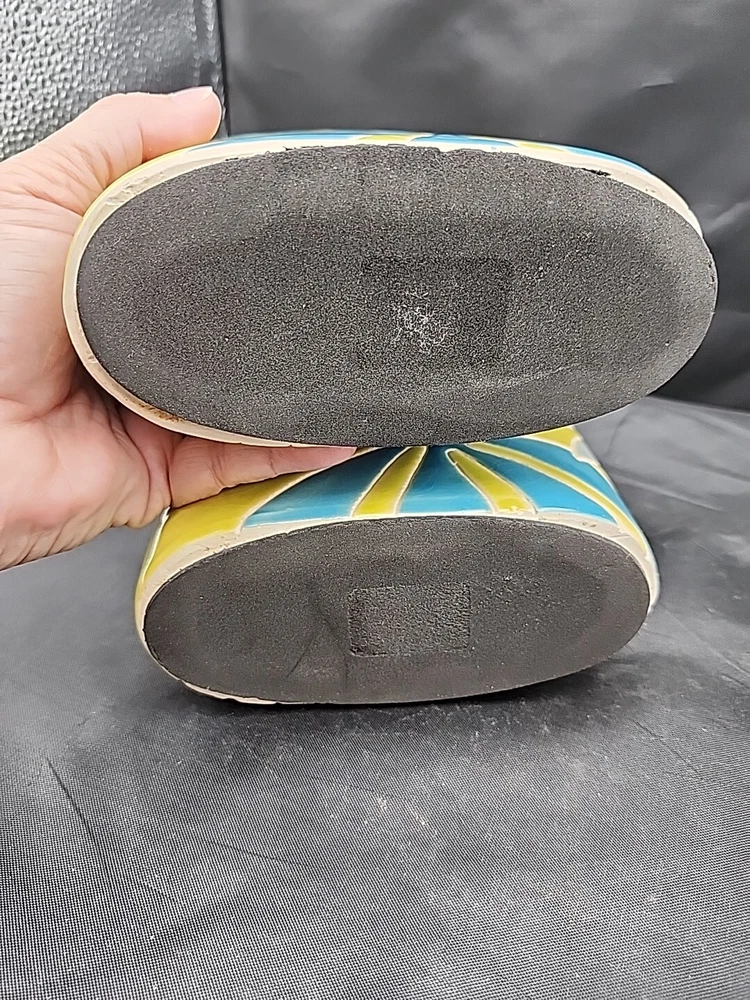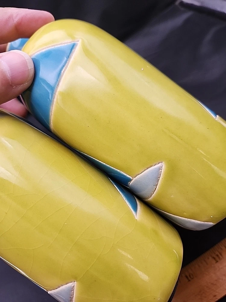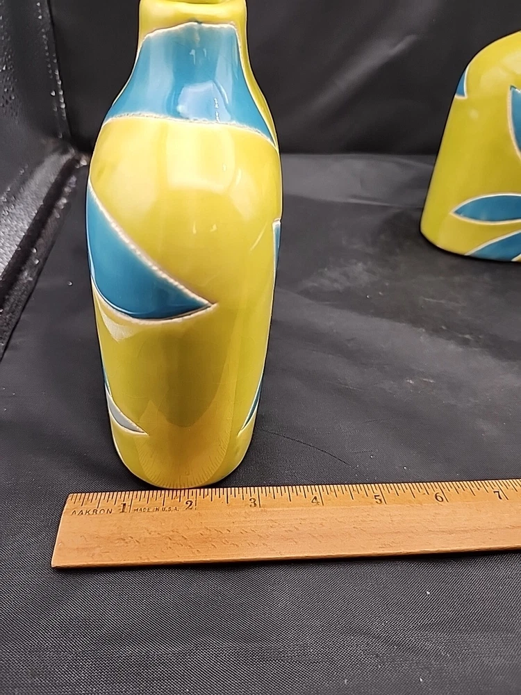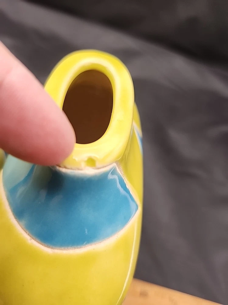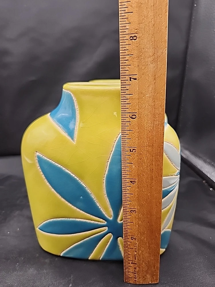 Fun happy vases. The originally came from Pier 1. Please see all photos for details, conditions, and sizing. After sizing photos comes things I want to point out. Their is a glazed chip on one. So it was always like that. The other photo showed that one has crazing, and the other does not. This is caused by temperature changes. So one was near an air conditioner or stove, perhaps.