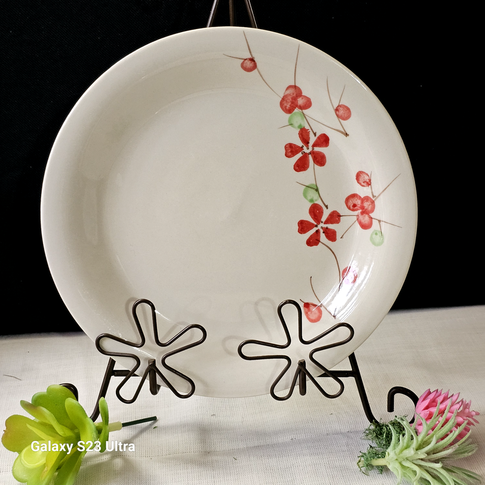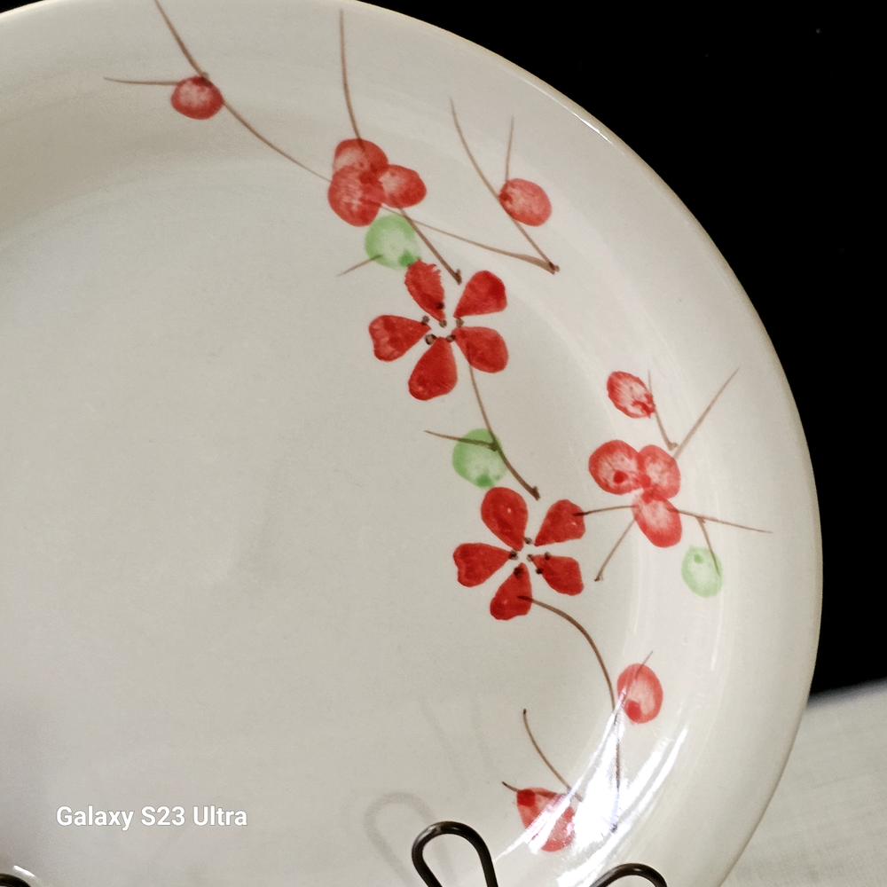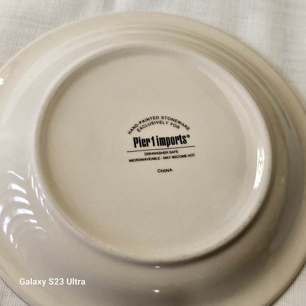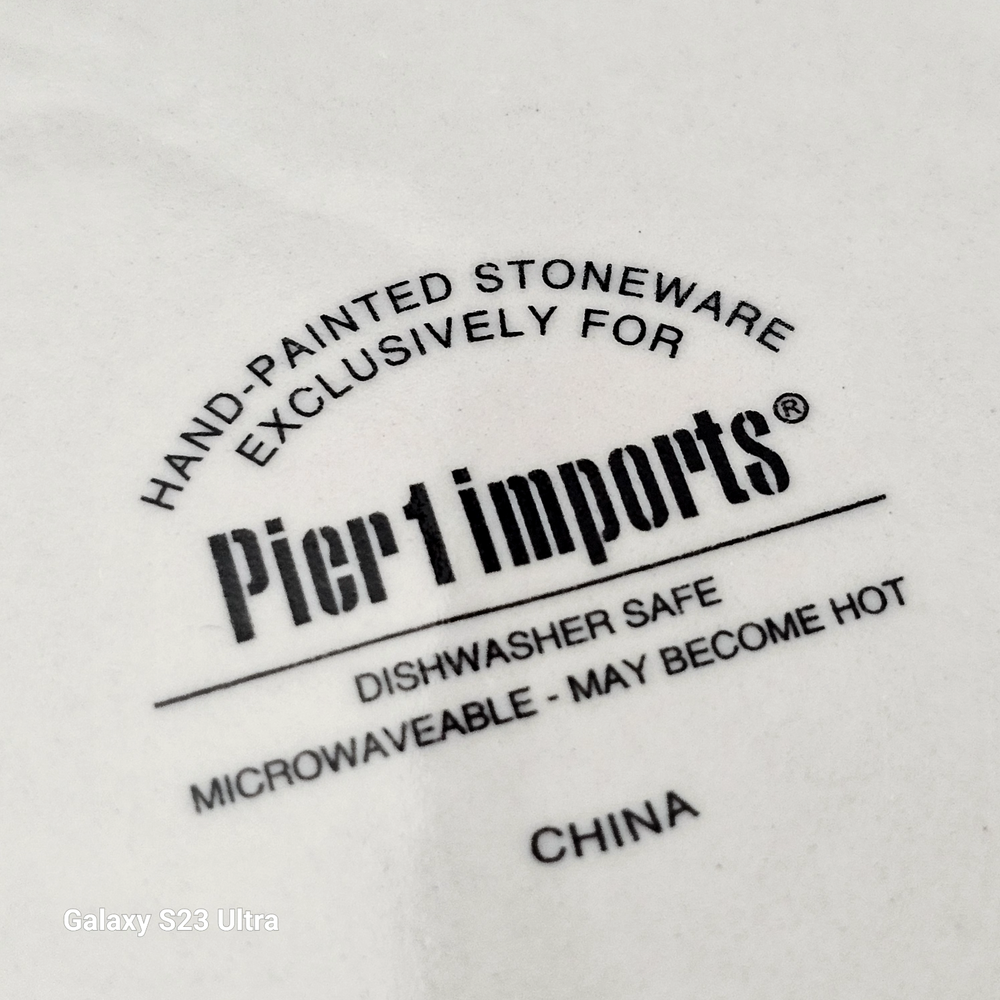 Add a touch of Art Deco charm to your table setting with these two round Pier 1 Imports plates. They feature beautiful hand-painted red flowers on a glossy finish, making them perfect for all occasions. The plates are made of high-quality stoneware making them ideal for serving appetizer, salad, bread, or dessert. These plates are not only decorative but also practical, as they are stackable, dishwasher safe, and microwave safe. The plates have a diameter of 7.5 inches and are perfect for teens and unisex adults. Get your hands on these original Pier 1 Imports plates today and elevate your dining experience! Condition: Very good used condition from a smoke-free and pet-free home