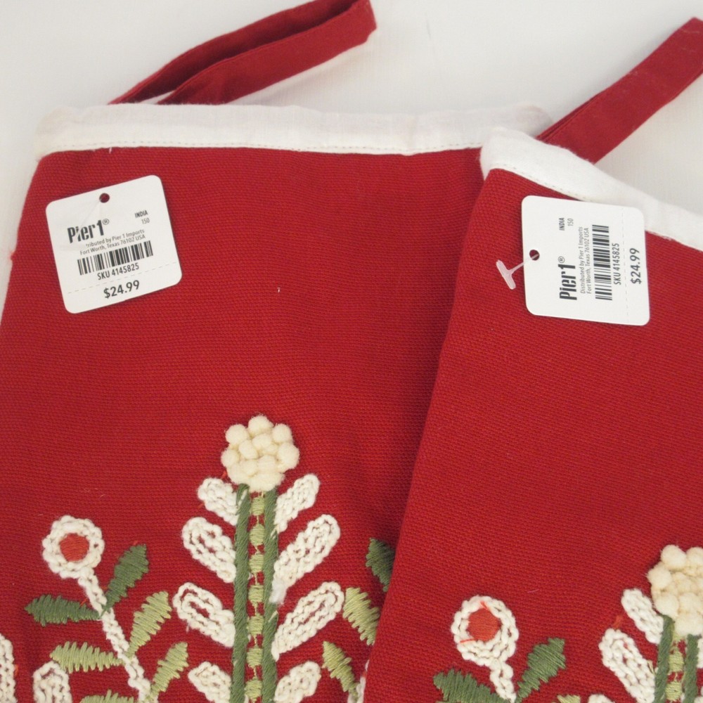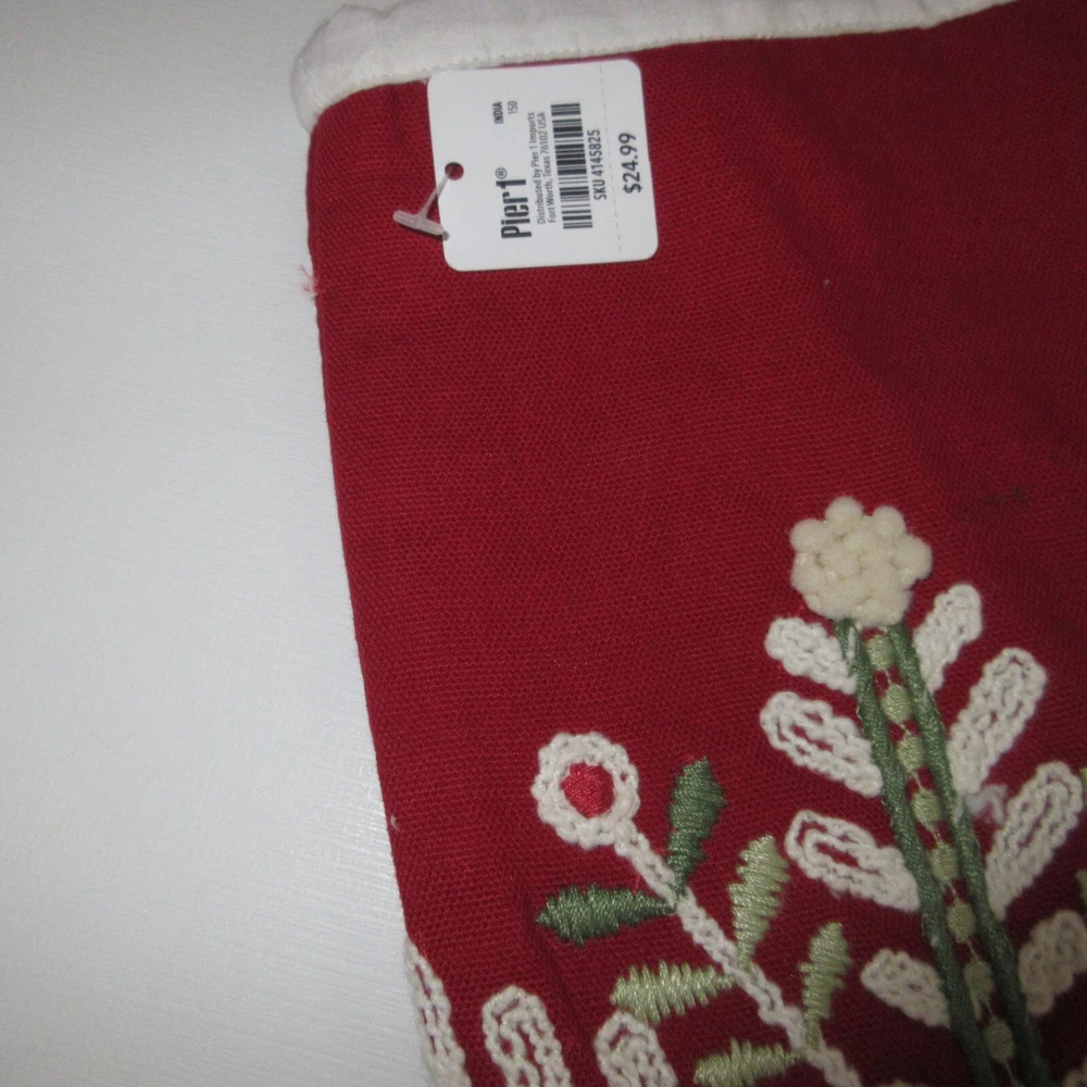 2 Pier 1 Imports Red White Green Snowflake Design Christmas Stocking Still has tags. One stocking has a snag in the fabric. Length: 18” 45.7 cm Width: 6” 15.24 cm...